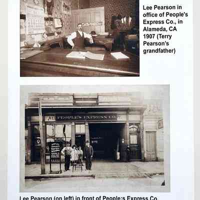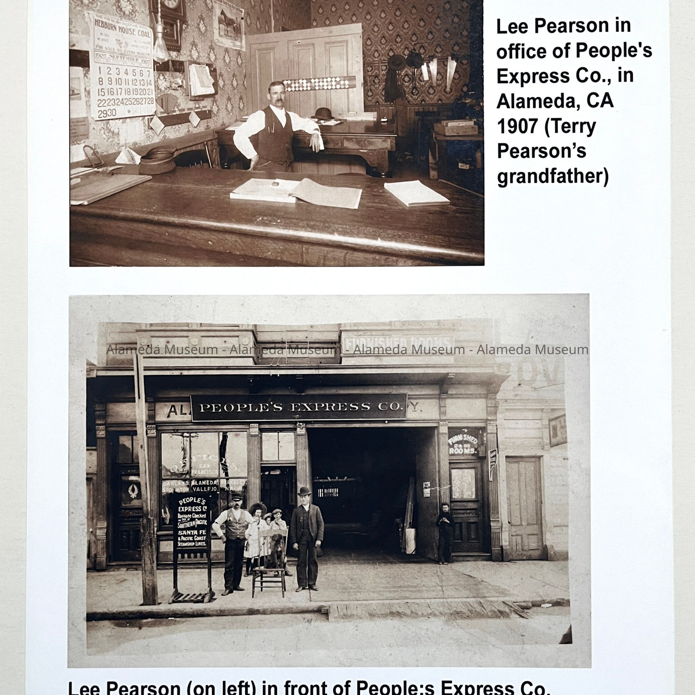 HISTORY OF OBJECTS: TWO PHOTOS ON EACH PAGE OF LEE PEARSON IN HIS OFFICE, “LEE PEARSON'S EXPRESS CO”. ONE PHOTO SHOWS THE INTERIOR AND EXTERIOR OF THE COMPANY.