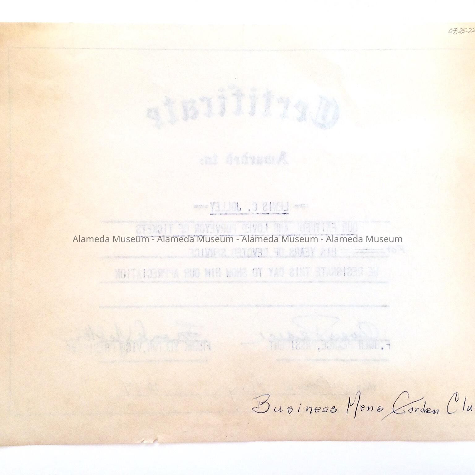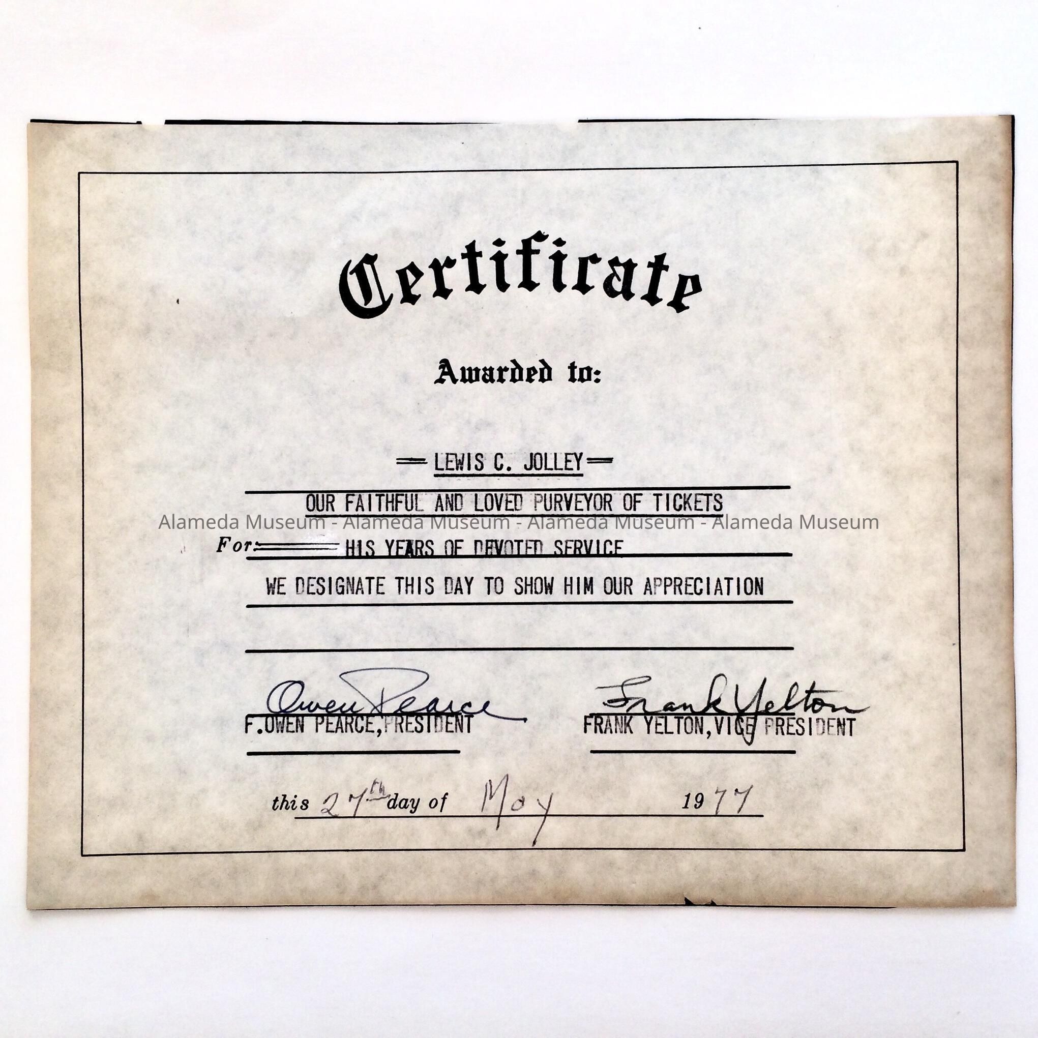 Printed Alameda High School Certificate awarded Lewis C. Jolley for service, 1977Entry/Object ID