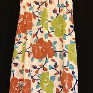 A PRINTED COTTON SKIRT, WITH FLORAL DESIGN IN GREEN AND BROWN COLORS ON AN OFF-WHITE BACKGROUND. SKIRT IS SECURED BY A ZIPPER.
