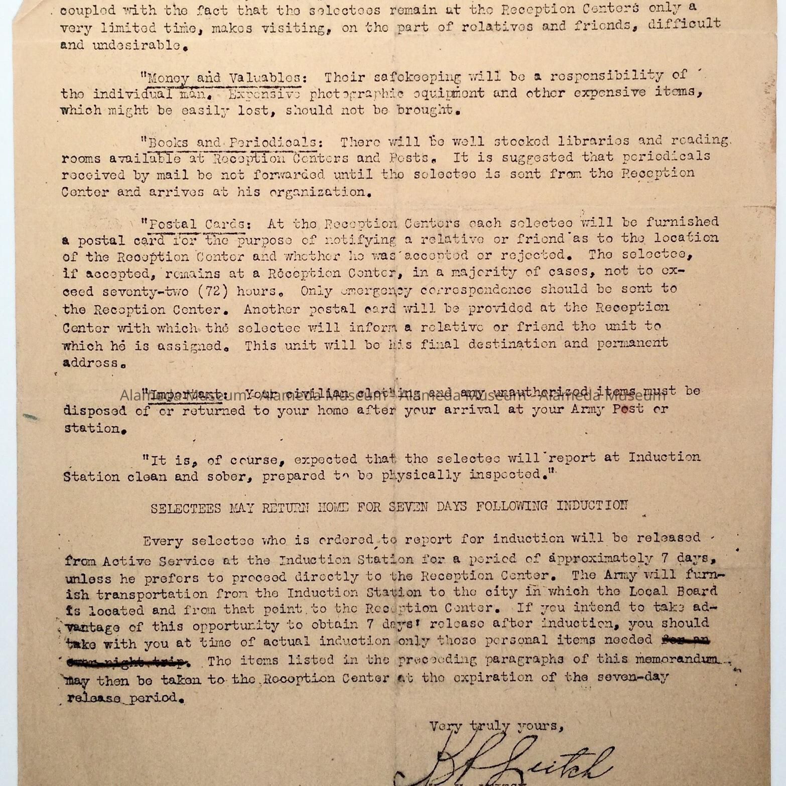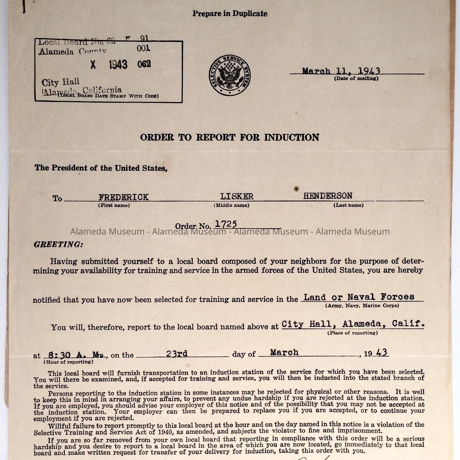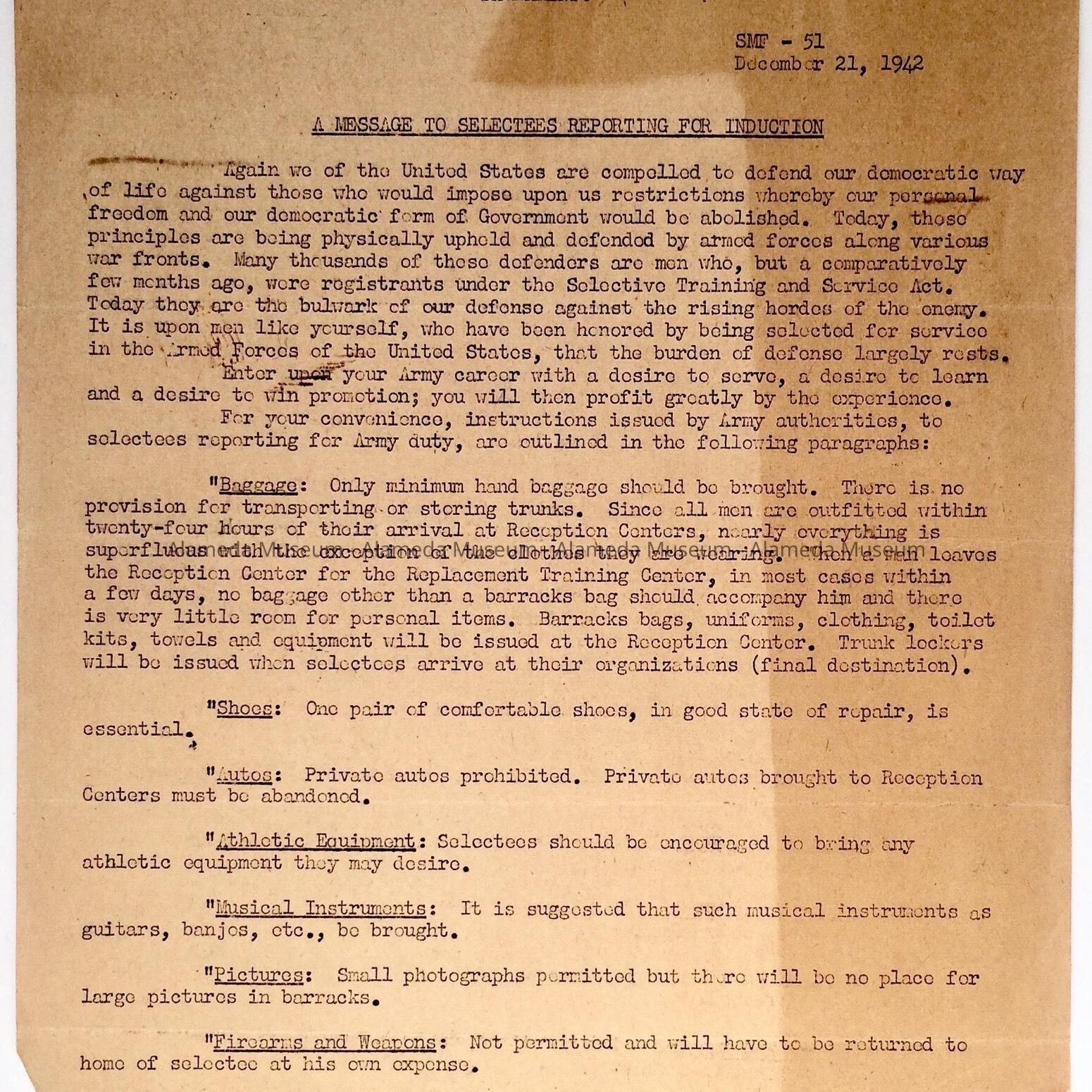 Printed Orders and papers for induction, WW II, c. 1943Entry/Object ID