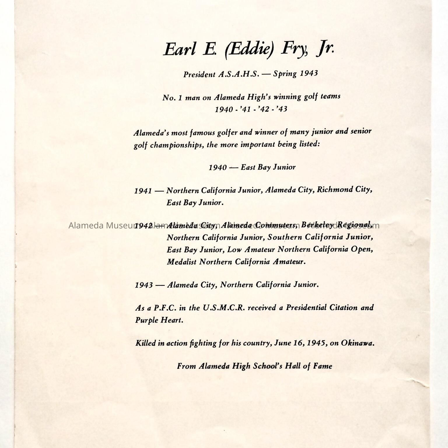 A PRINTED TESTIMONIAL OF THE LATE EARL E FRY, JR, WHO WAS A CHAMPION GOLFER. HE WAS GRADUATED FROM ALAMEDA HIGH SCHOOL AND WAS THE SON OF EARL FRY, SR, GOLF PRO AT THE ALAMEDA MUNICIPAL GOLF COURSE.