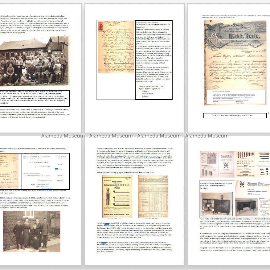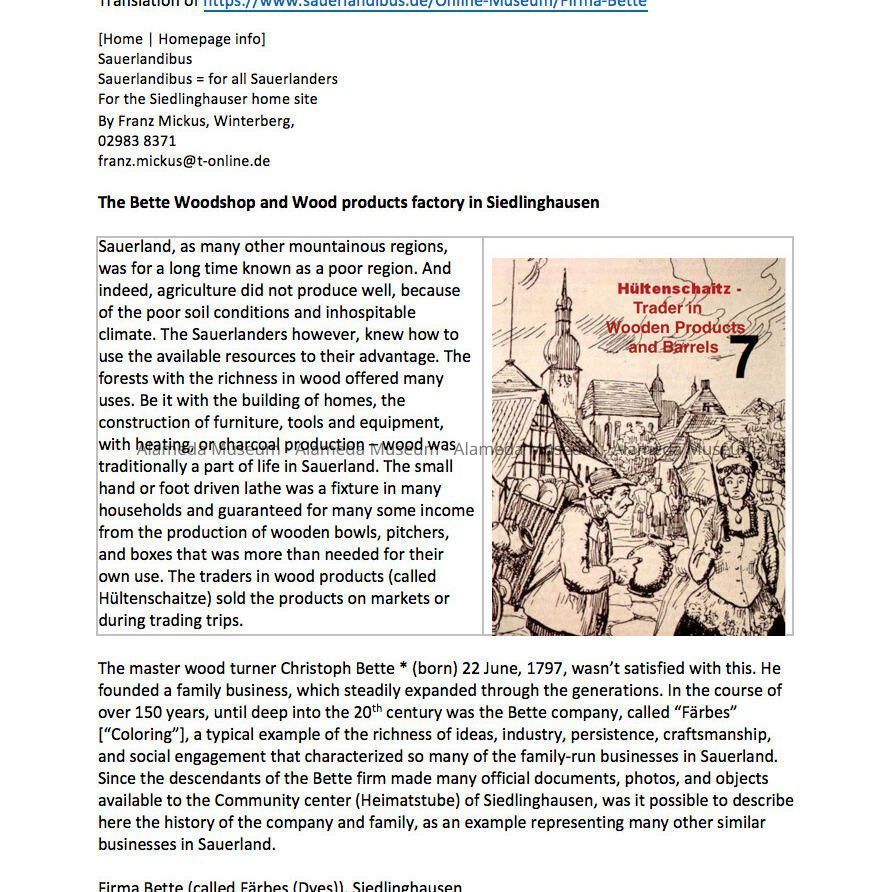 History of Object: Printed version of a translation of a German website about the Bette Firm of woodworkers. Frank Bette grew up in the family. The German article was written by Franz Mickus, 9/2019.