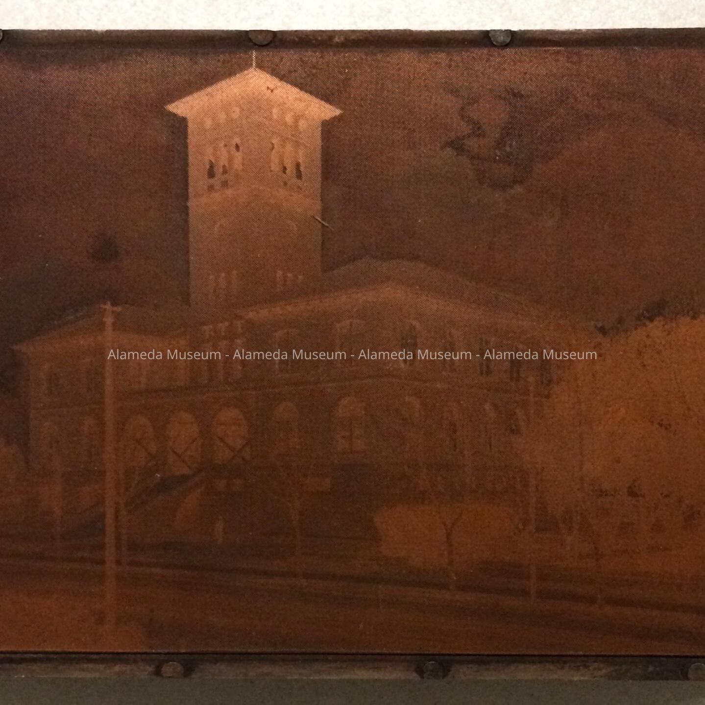History of Object: The plate depicts the Alameda City Hall during the construction, for the entrance seems to be blocked by boards to prevent public entrance.