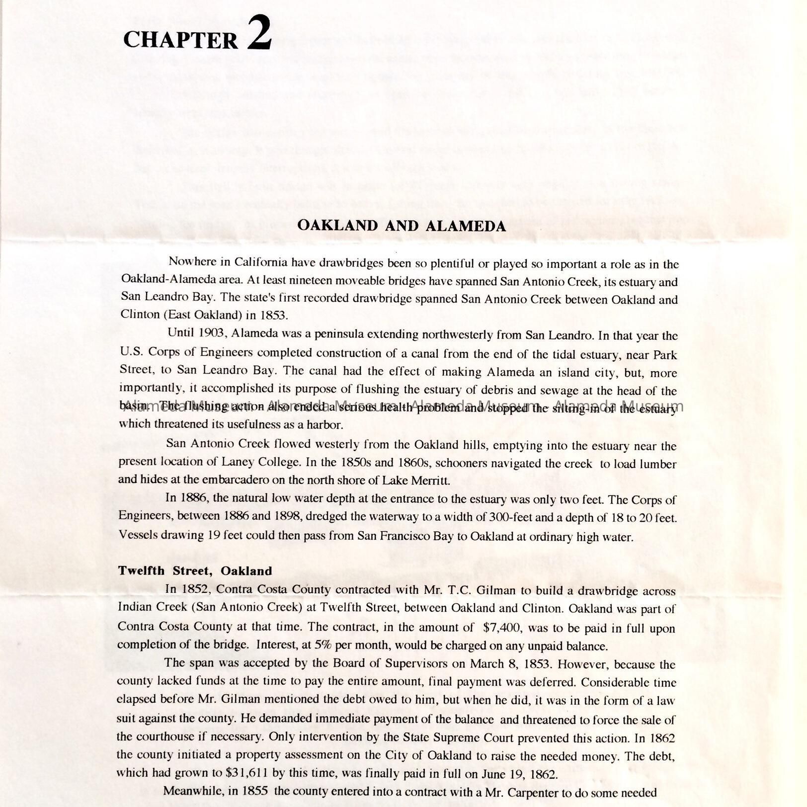 Description: A. 2 pages copied or printed from a book, p. 20, titled 'Chapter 2, Oakland And Alameda' and 29, 'Park Street * Mile 7.3', showing a fuzzy photo of a bridge.