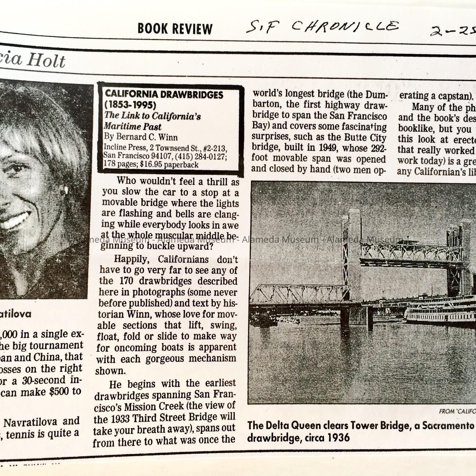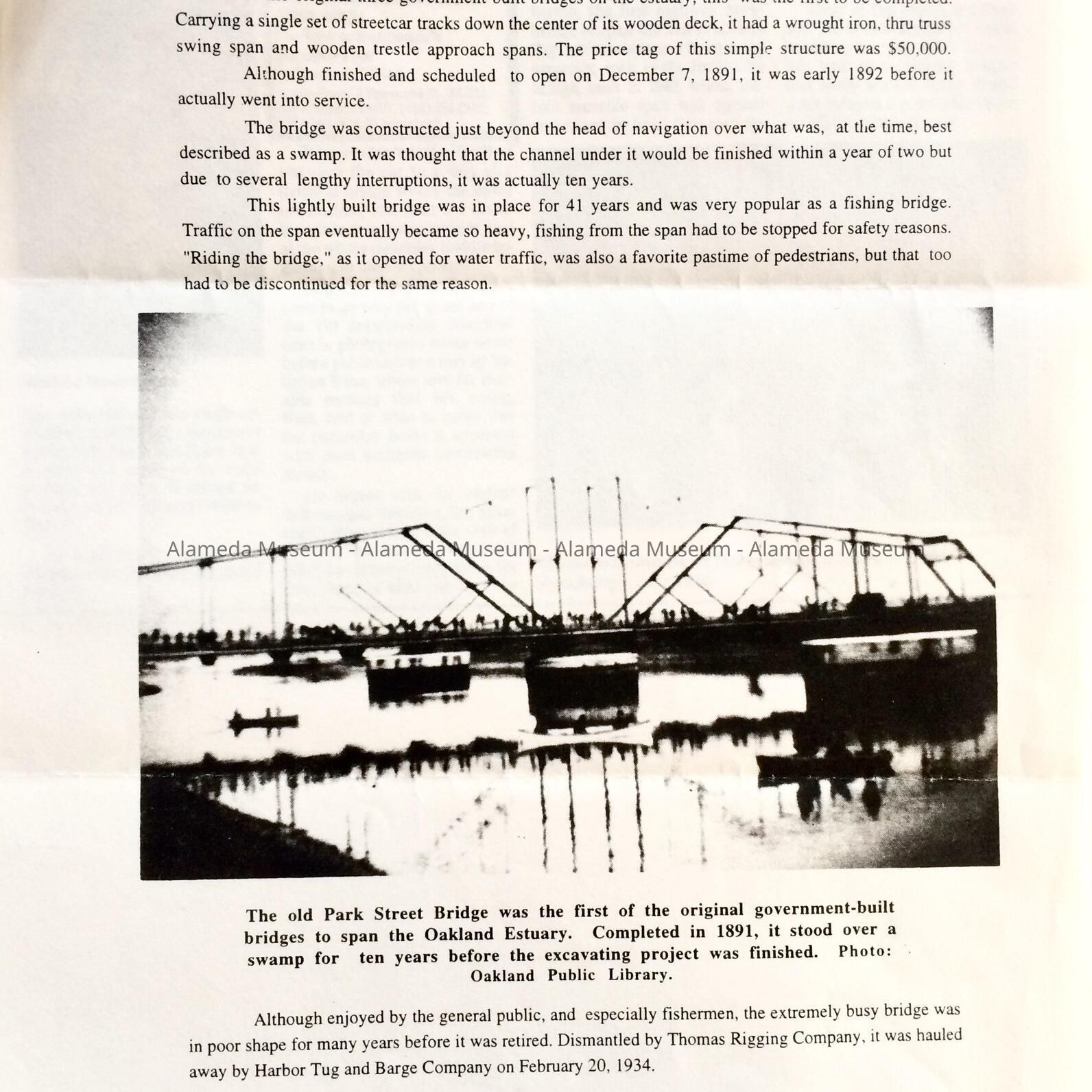 History of Object: Copy of pages relating to Alameda from the book 'California Drawbridges (1853-1995), The Link to California's Maritime Past', by Bernard C. Winn, Incline Press, San Francisco, and a book review of the same by Patricia Holt, from the S.F. Chronicle of 2-25-1996. Discusses the Park Street Bridge, Bridge, which carried a single set of streetcar tracks on a wooden deck, had a wrought iron, thru truss wing span and wooden trestle approach spans, was completed in 1891, and dismantled in 1934.