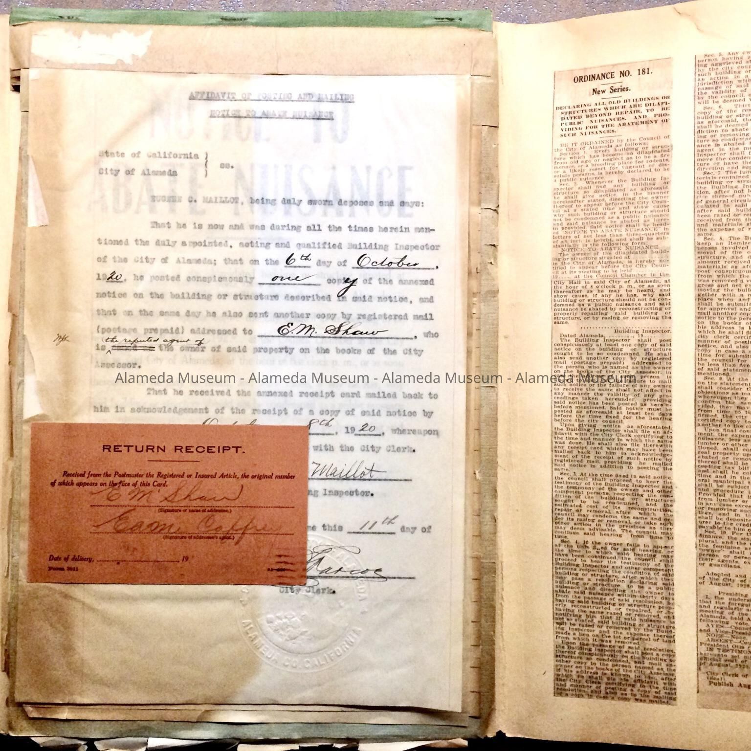 History of Object: Abatement notices served by Building Inspector, E.C. Maillot. Includes photos of the following buildings, in all likelihood demolished: