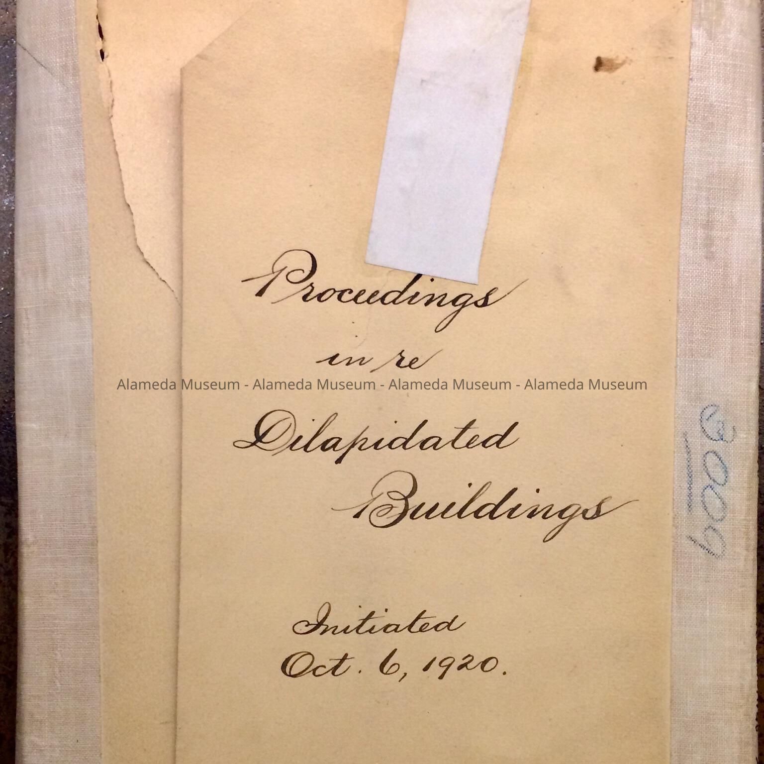 Description: Light tan folder, with sepia ink lettering “Proceedings in re Dilapidated Buildings Initiated Oct. 6. 1920". Folder has been reinforced on the sides with a tape, which has ‘3009’ in blue pencil on the front, and on the side, in black ink or markers: ‘Dilapidated Buildings Proceedings Against’. Folder contains correspondence, petitions, affidavits, photos, and notices to abate nuisance. Inside cover flap has clipping of a printed ordinance.