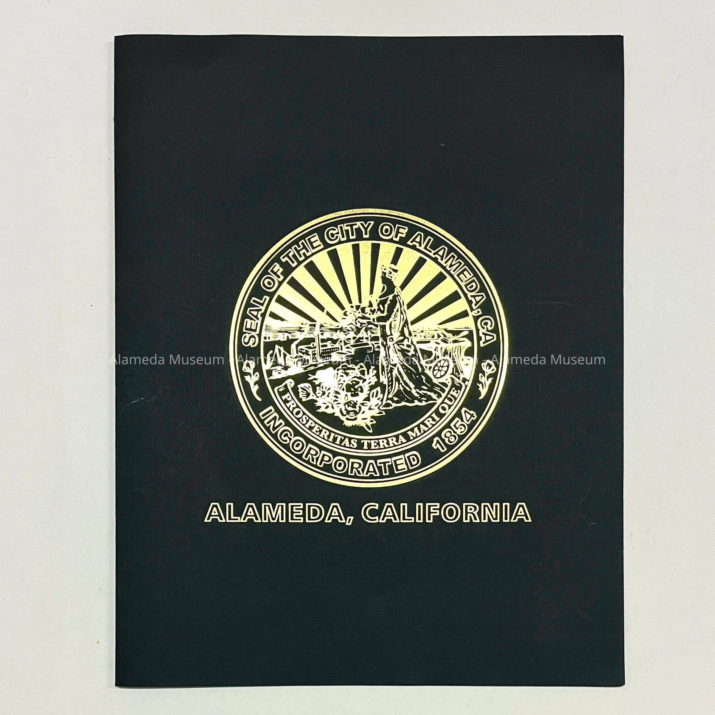 Description: Black folder of construction paper with linen-look, with Seal of the City of Alameda in gold, holding a Proclamation on formal paper with gold and raised or embossed borders and faded version of the seal in the background.