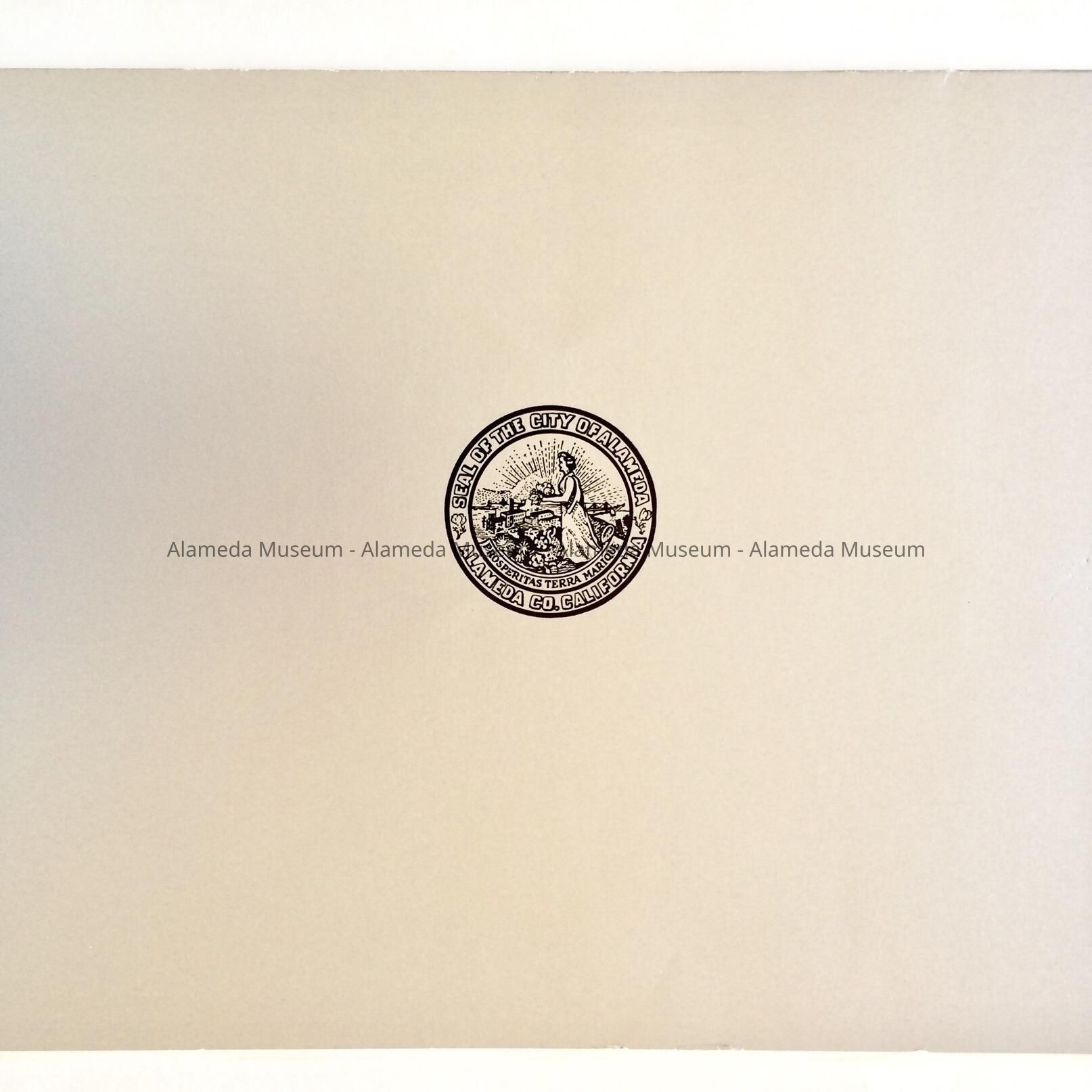 TYPEWRITTEN PROCLAMATION ON CITY OF ALAMEDA STATIONERY IN A GREY-COLORED COVERLET OF HEAVY STOCK PAPER. COVERLET HAS THE CITY SEAL IN BLACK-COLORED TYPE ON A GREY-COLORED BACKGROUND.