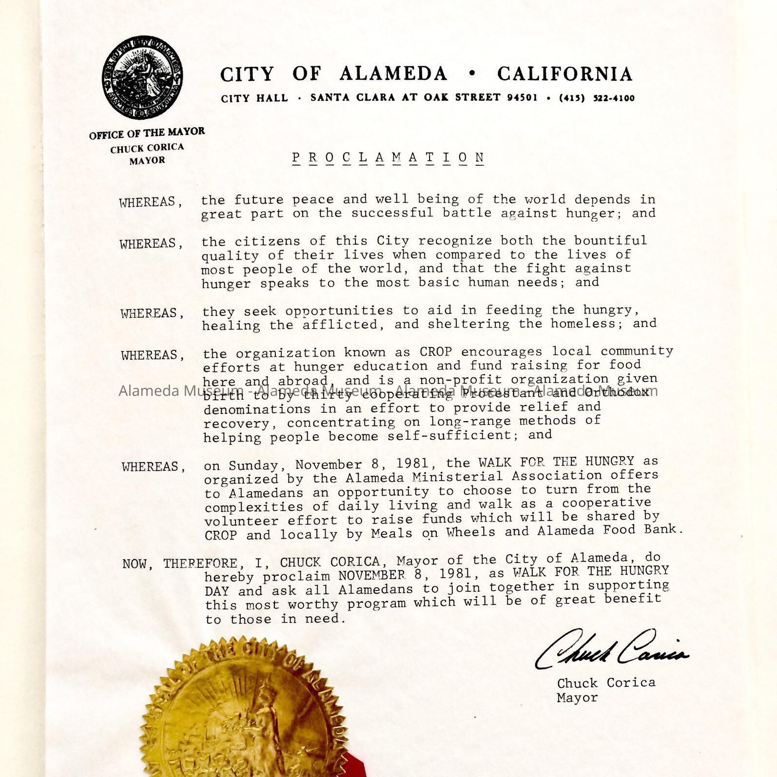 A PROCLAMATION ISSUED BY THE CITY OF ALAMEDA, DECLARING SUNDAY, NOVEMBER 8, 1981 AS THE "WALK FOR THE HUNGRY." THE EVENT WAS ORGANIZED BY THE ALAMEDA MINISTERIAL ASSOCIATION. FUNDS DERIVED FROM THE EVENT WERE GIVEN TO MEALS ON WHEELS. PROCLAMATION WAS SIGNED ON NOVEMBER 8, 1981, BY CHUCK CORICA, THEN MAYOR OF ALAMEDA.