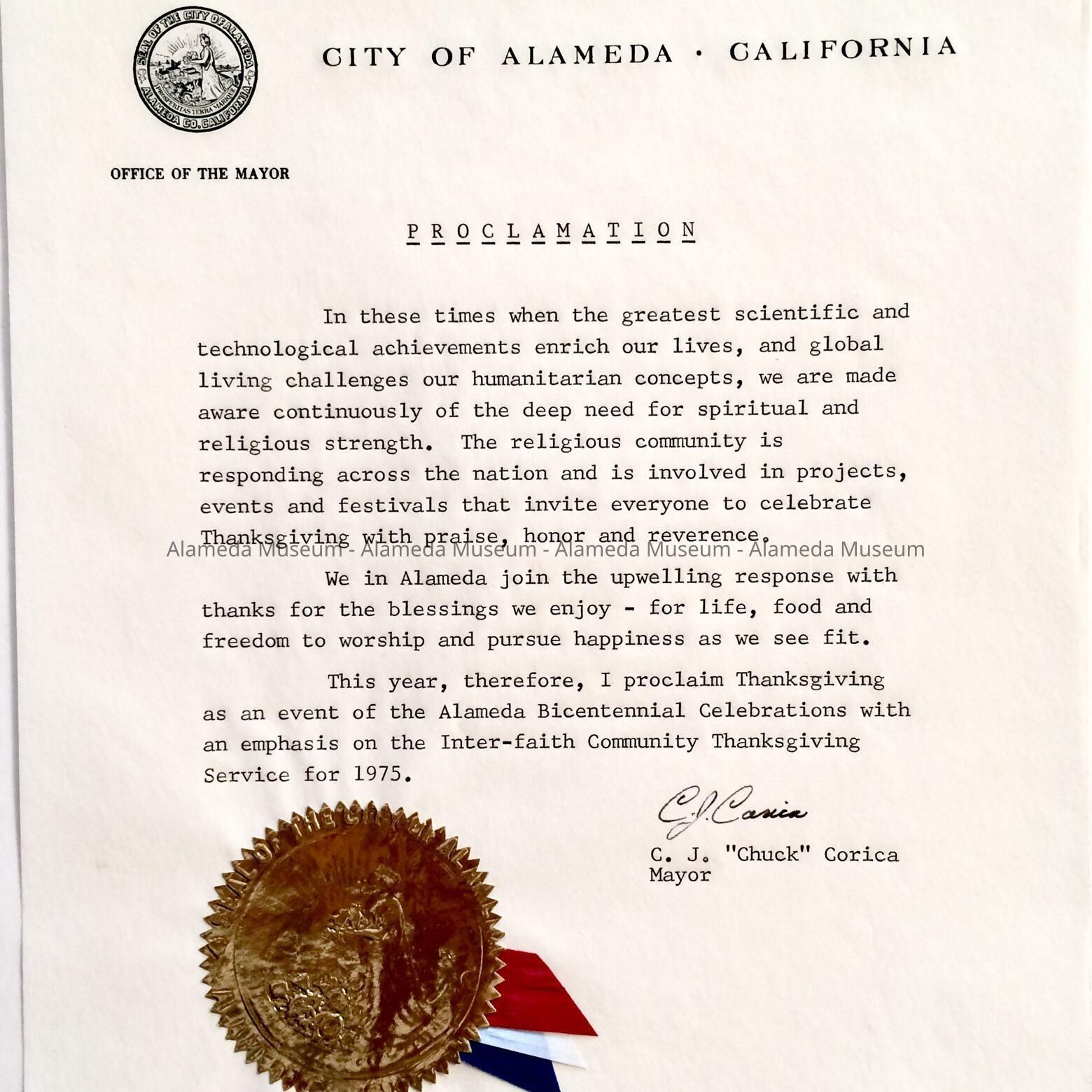 HISTORY OF OBJECT: A PROCLAMATION ISSUED BY THE CITY OF ALAMEDA AND SIGNED BY THE LATE C. I. CORICA, MAYOR, PROCLAIMING THANKSGIVING AS AN EVENT OF THE ALAMEDA BICENTENNIAL CELEBRATION.