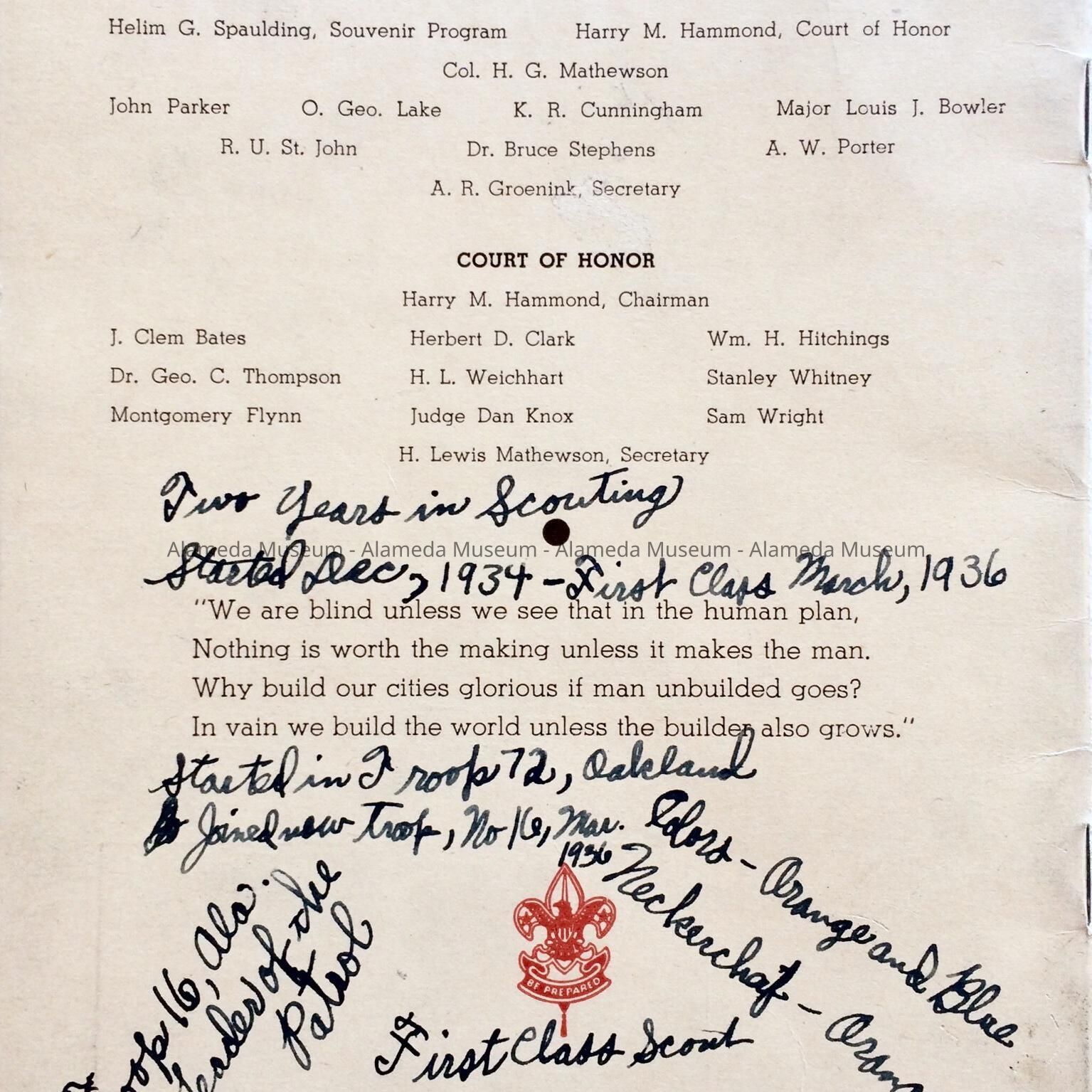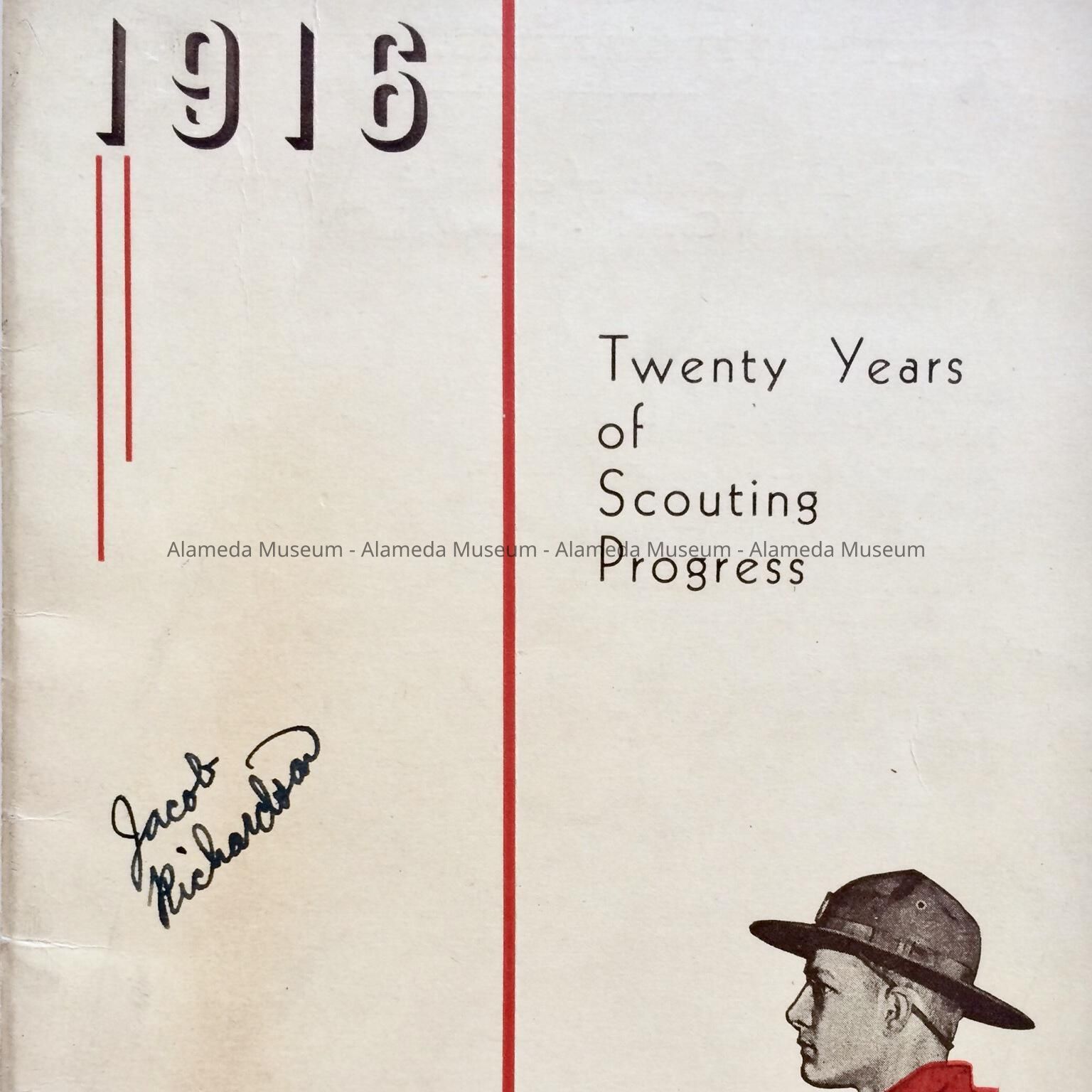 A PROGRAM REPORT CONCERNING THE 20-YEAR-CELEBRATION OF THE ALAMEDA COUNCIL, BOY SCOUTS OF AMERICA, 1916-1936. THE BOOKLET CONTAINS A PROGRAM OF THE EVENT AND HIGHLIGHTS OF SCOUTING HISTORY IN ALAMEDA. THIS PARTICULAR COPY BELONGED TO JACOB RICHARDSON. ON THE BACK COVER, MR. RICHARDSON NOTED EVENTS WHICH OCCURRED WHEN HE WAS A MEMBER.