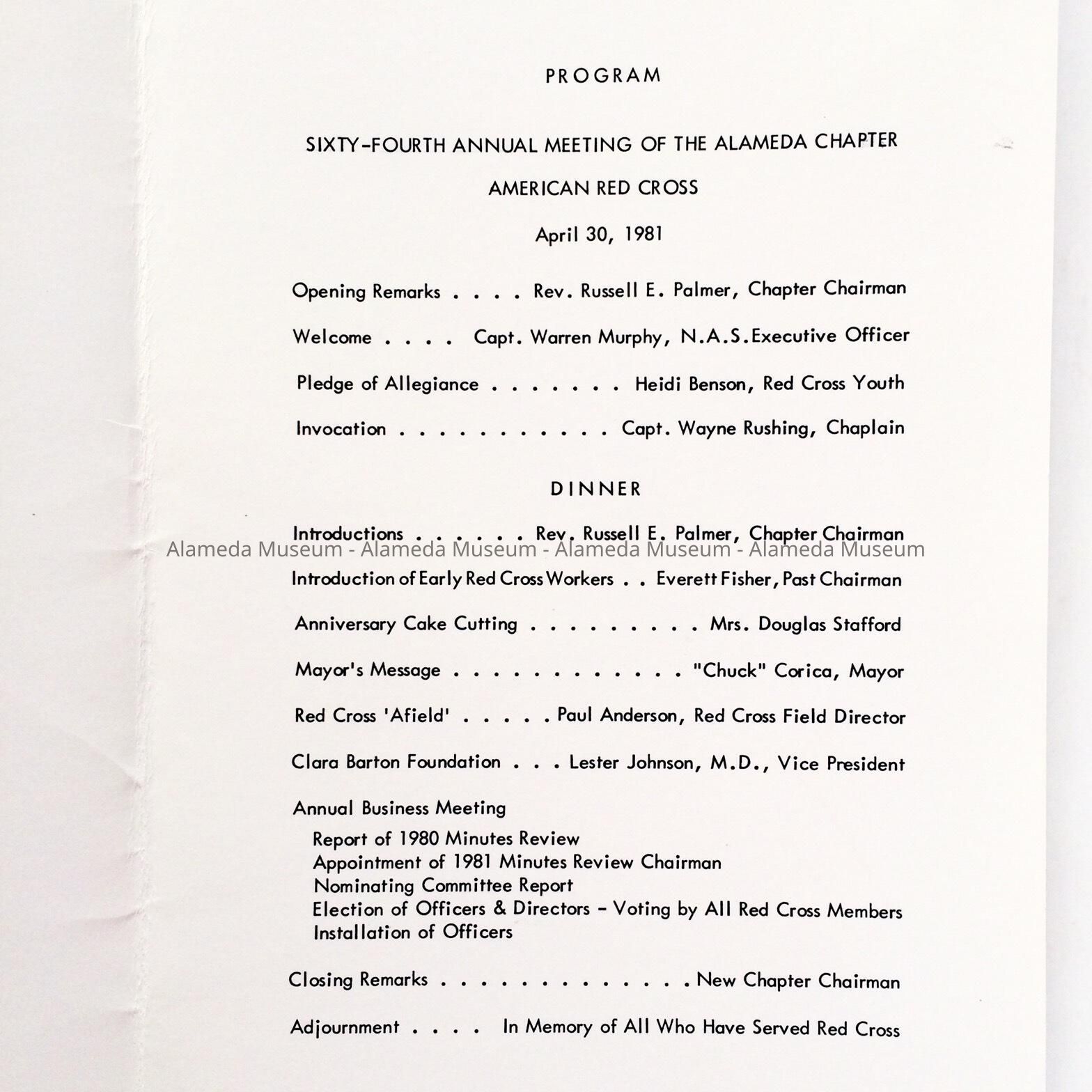 History of Object: Program for 64th annual meeting of the Alameda Chapter American Red Cross April 30, 1981.