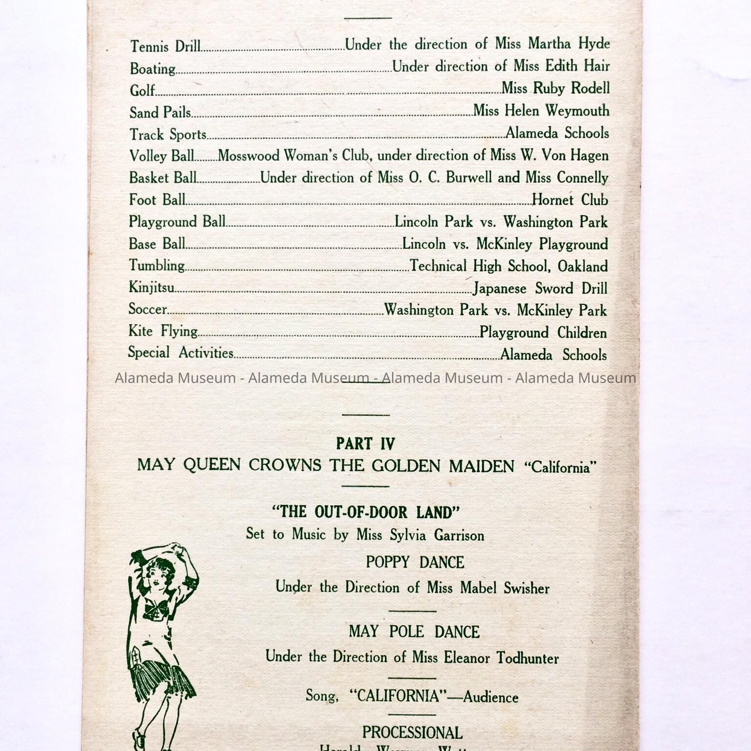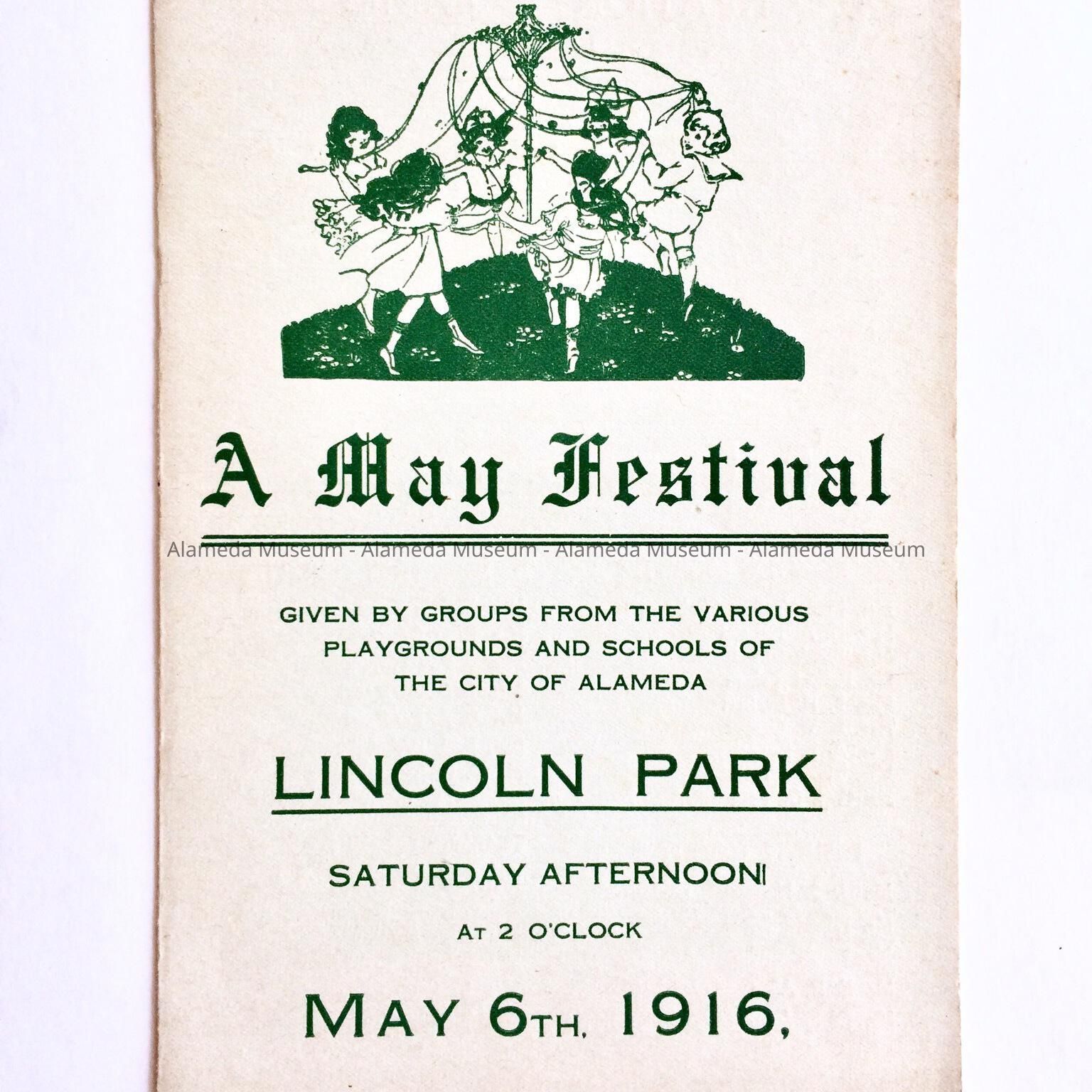 A PROGRAM ADVERTISING A MAY FESTIVAL AT LINCOLN PARK, MAY 6, 1916. THE CAST INCLUDED CHILDREN FROM THE ALAMEDA CITY SCHOOLS.