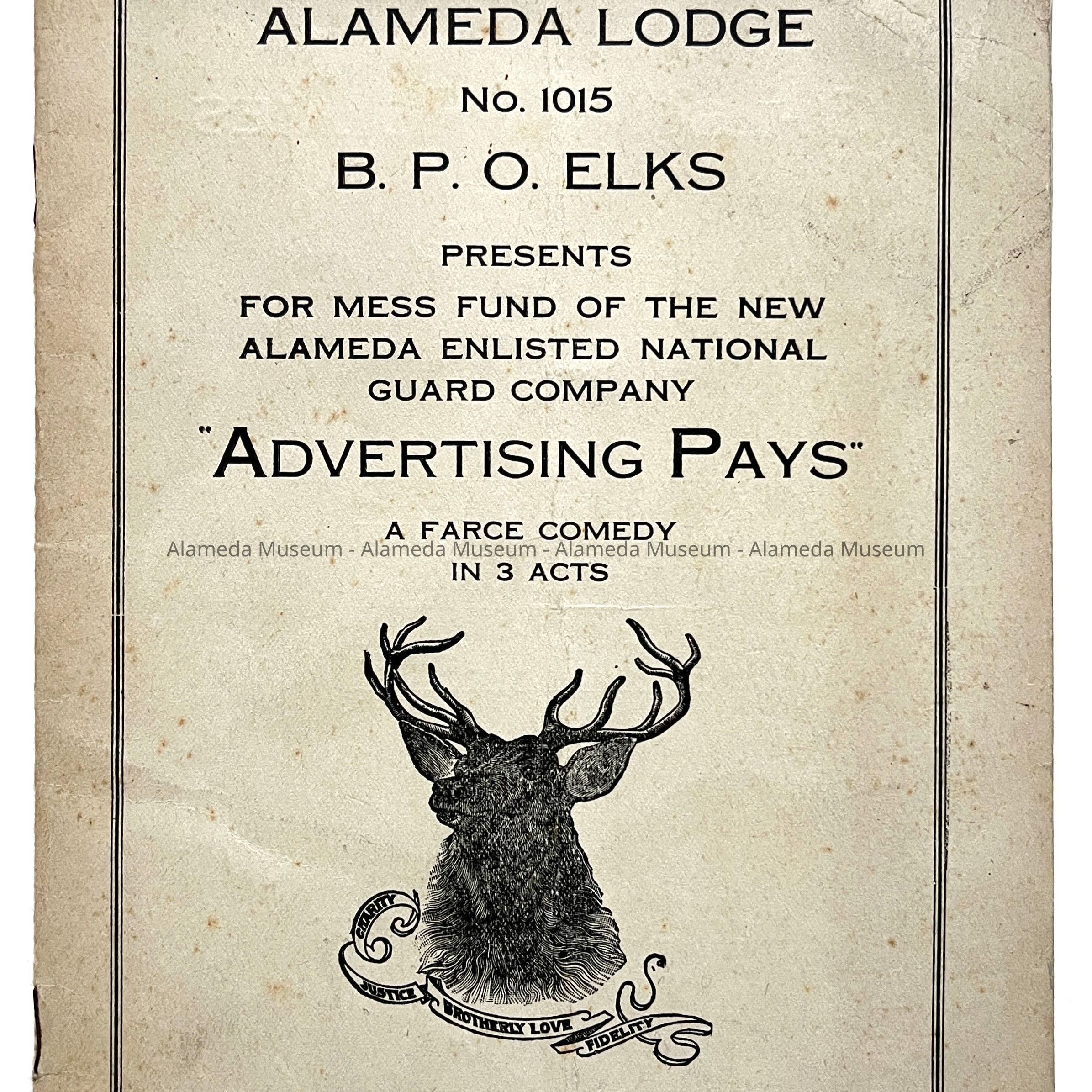 History of Object: Program, Alameda Lodge, No. 1015, B.P.O. Elks, presenting for mess fund of the new Alameda Enlisted National Guard Co, a play "Advertising Pays" a farce comedy in 3 acts. Porter School Auditorium, Alameda, Ca., May 4th, 1918. The donor's father, Herbert D. Clark was one of the performers.