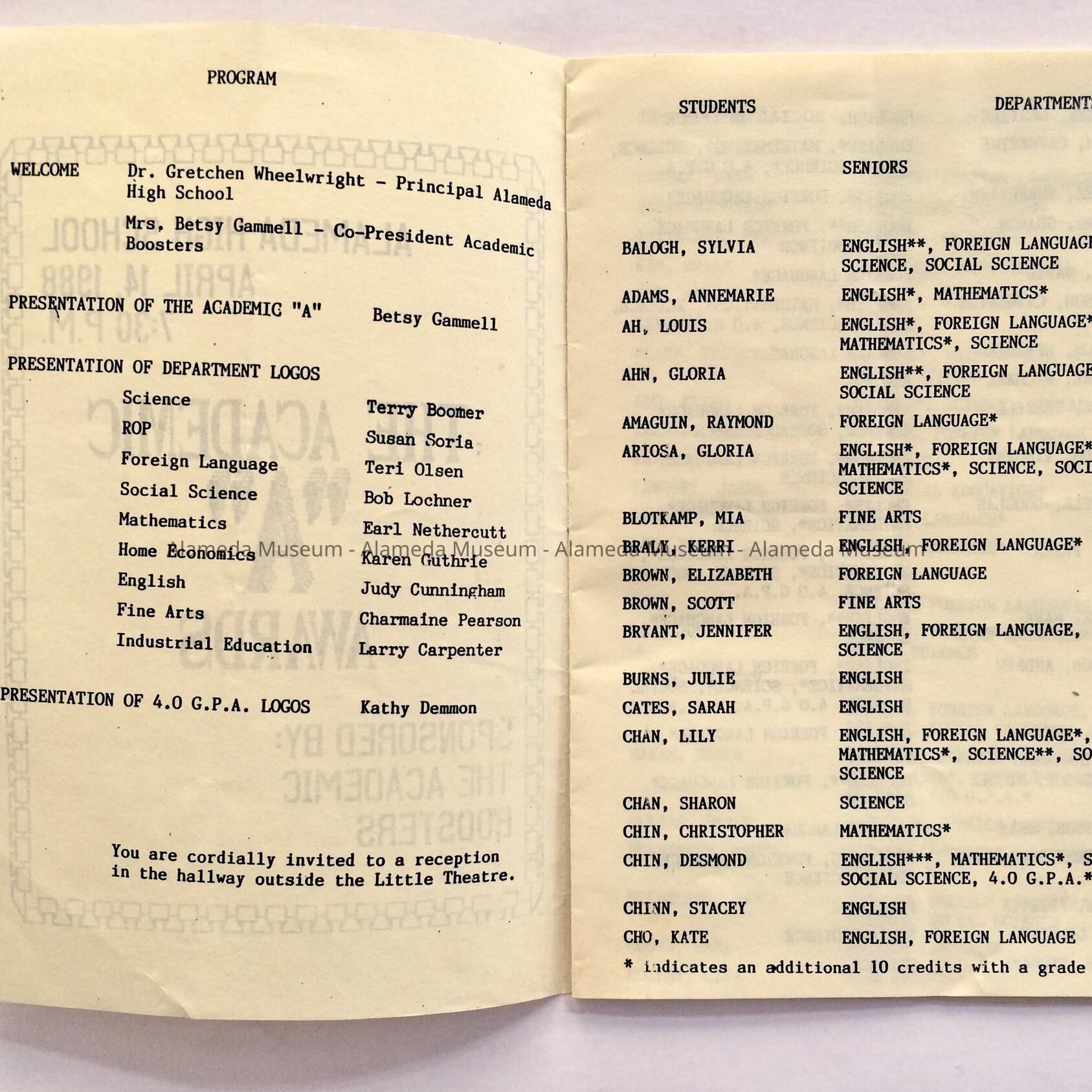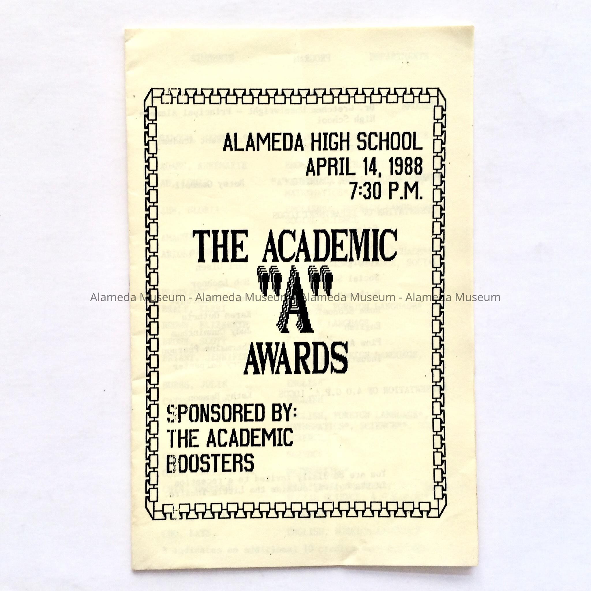 ALAMEDA HIGH SCHOOL ACADEMIC "A" AWARDS, SPONSORED BY THE ACADEMIC BOOSTERS, APRIL 14, 1988.