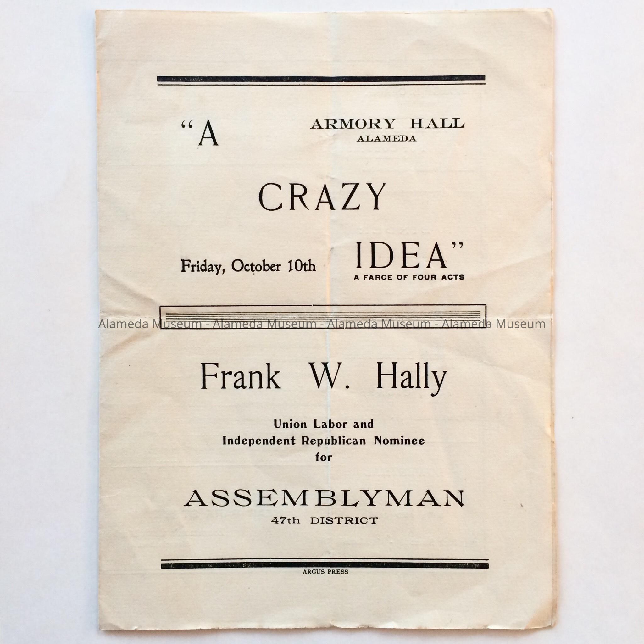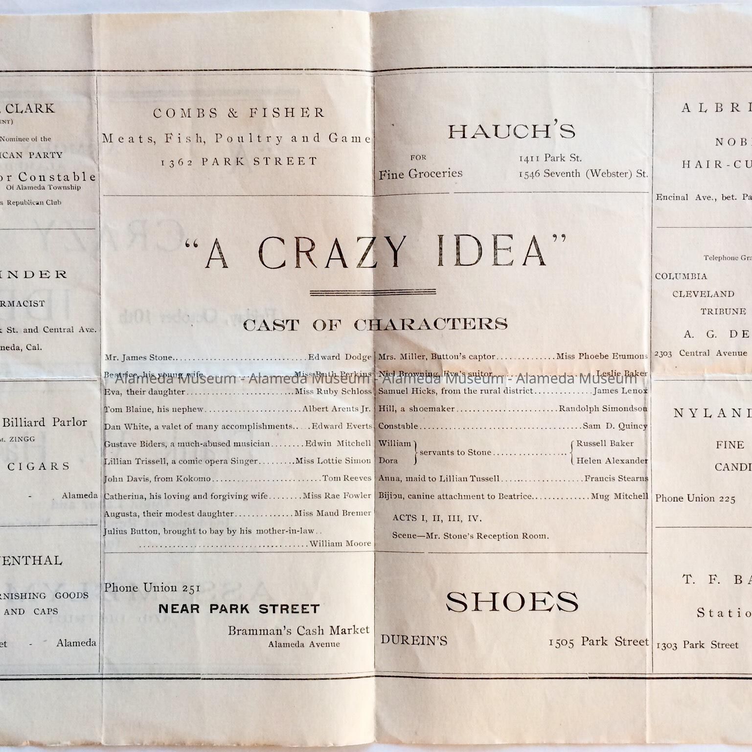 PROGRAM, DATED OCTOBER 10 (YEAR WAS OMITTED), FOR AN ALAMEDA HIGH SCHOOL CLASS PLAY, "A CRAZY IDEA," HELD AT THE ARMORY HALL, ALAMEDA, CALIFORNIA. INTERIOR OF PROGRAM INCLUDES ADVERTISEMENTS FOR EARLY PARK STREET MERCHANTS.