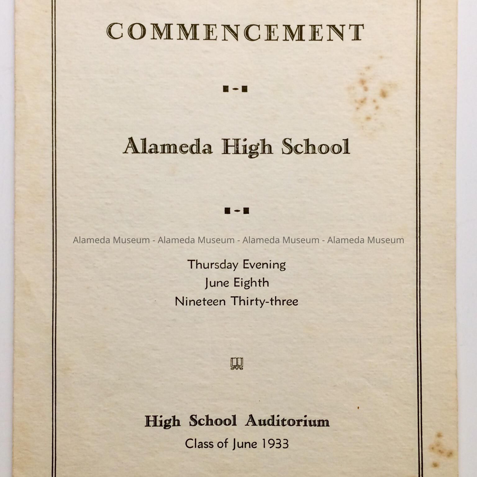 Description: 4-page program with caption: "Commencement", "Alameda High School", "Thursday Evening June Eight Nineteen Thirty-three" and "High School Auditorium", "Class of June 1933". There is some minor foxing spots visible, otherwise good condition.