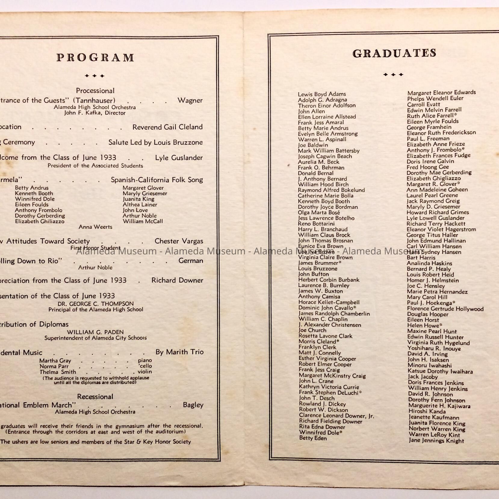 Program Alameda High School Commencement, Class of June 1933Entry/Object ID