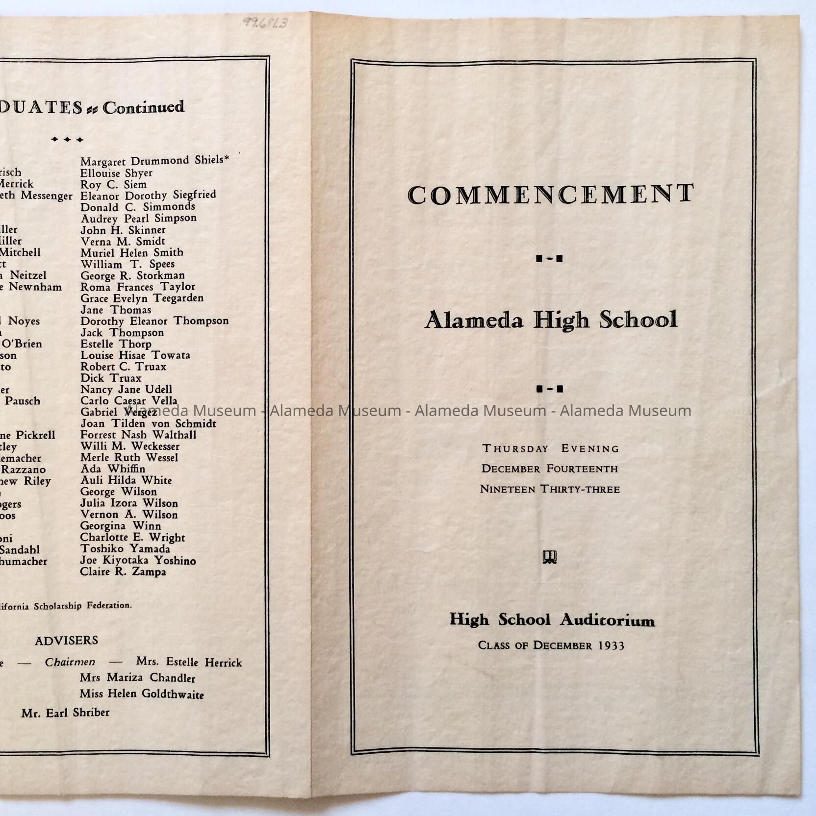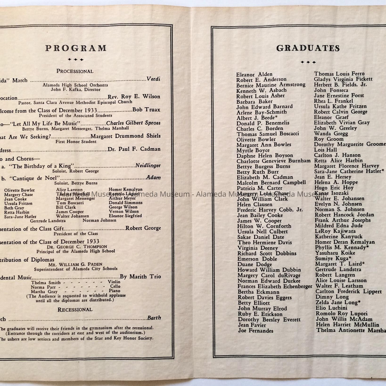 Program listing graduates for commencement exercises, Alameda High School, December 14, 1933.