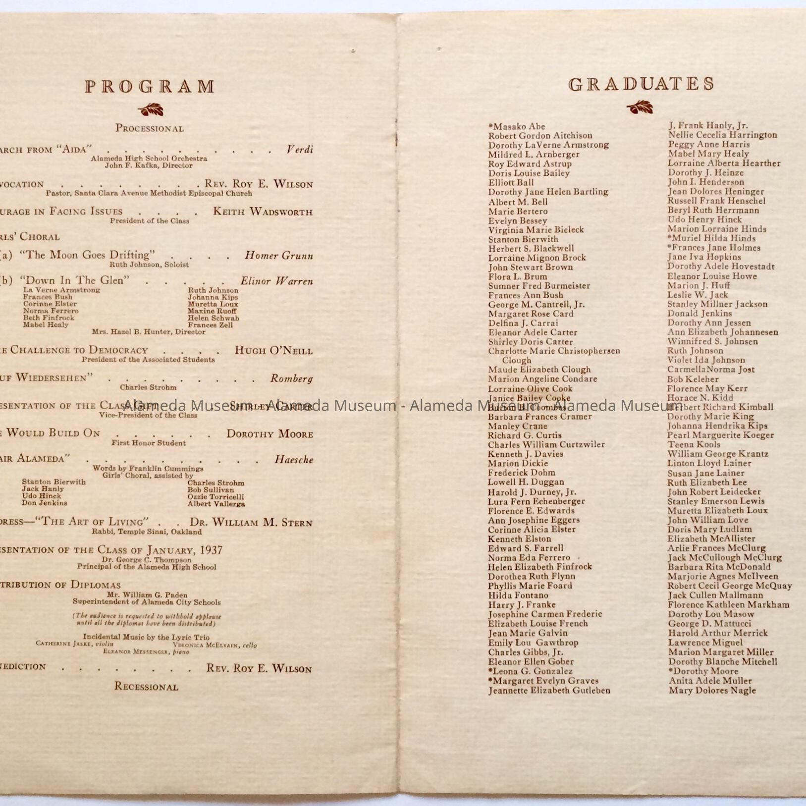 A PROGRAM FOR THE COMMENCEMENT EXERCISES OF THE GRADUATING CLASS OF ALAMEDA HIGH SCHOOL, HELD JANUARY 21, 1937. THE DONOR'S LATE HUSBAND, JACK HANLY, JR, WAS A MEMBER OF THE GRADUATING CLASS.