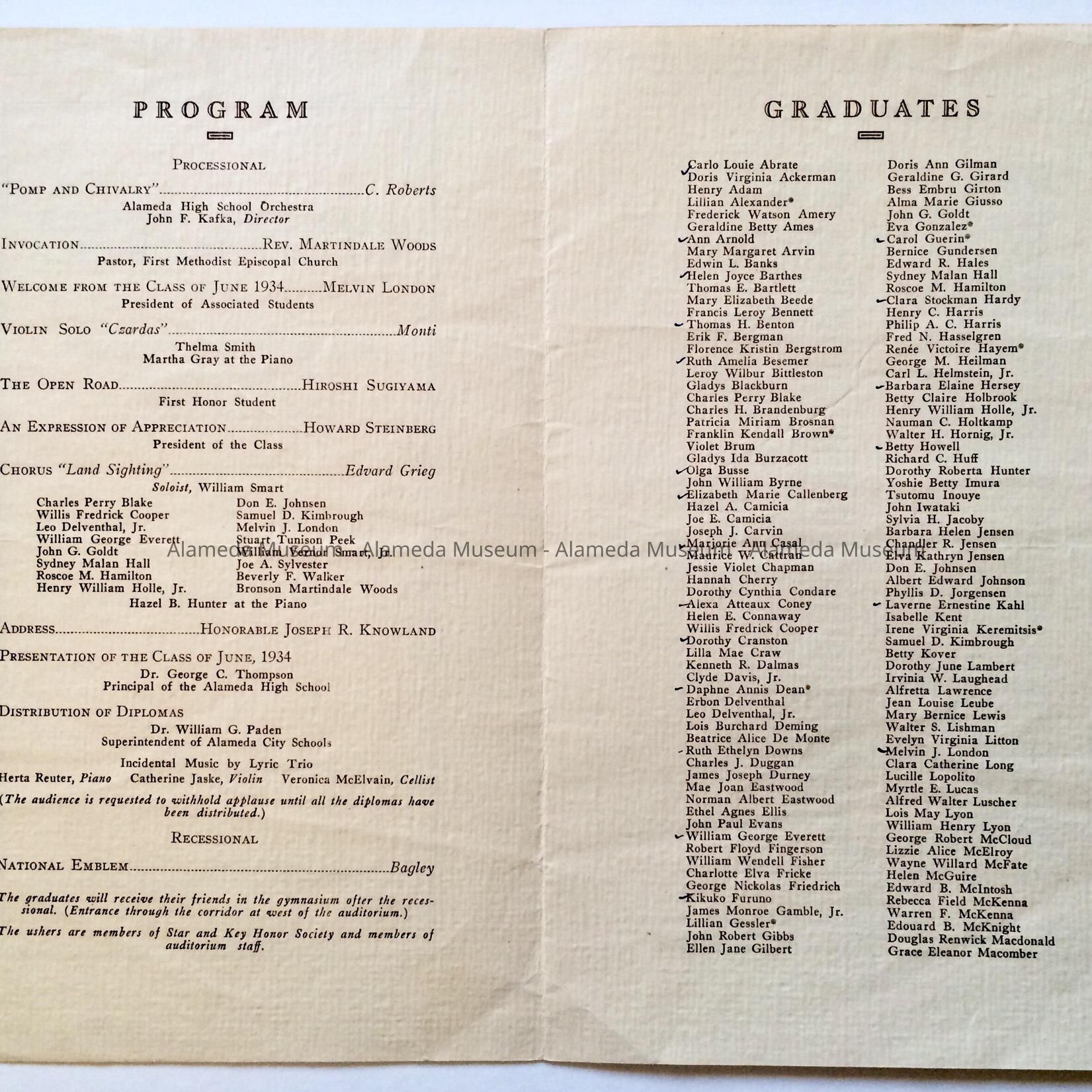 Program listing graduates for commencement exercises, Alameda High School, June 7, 1934.