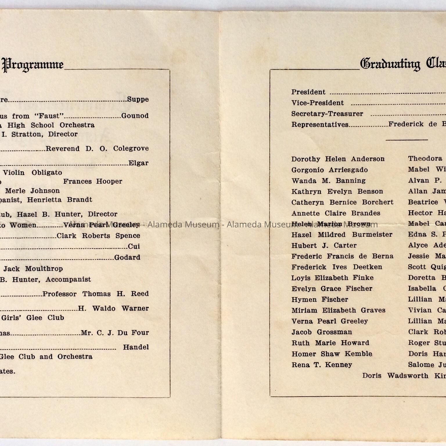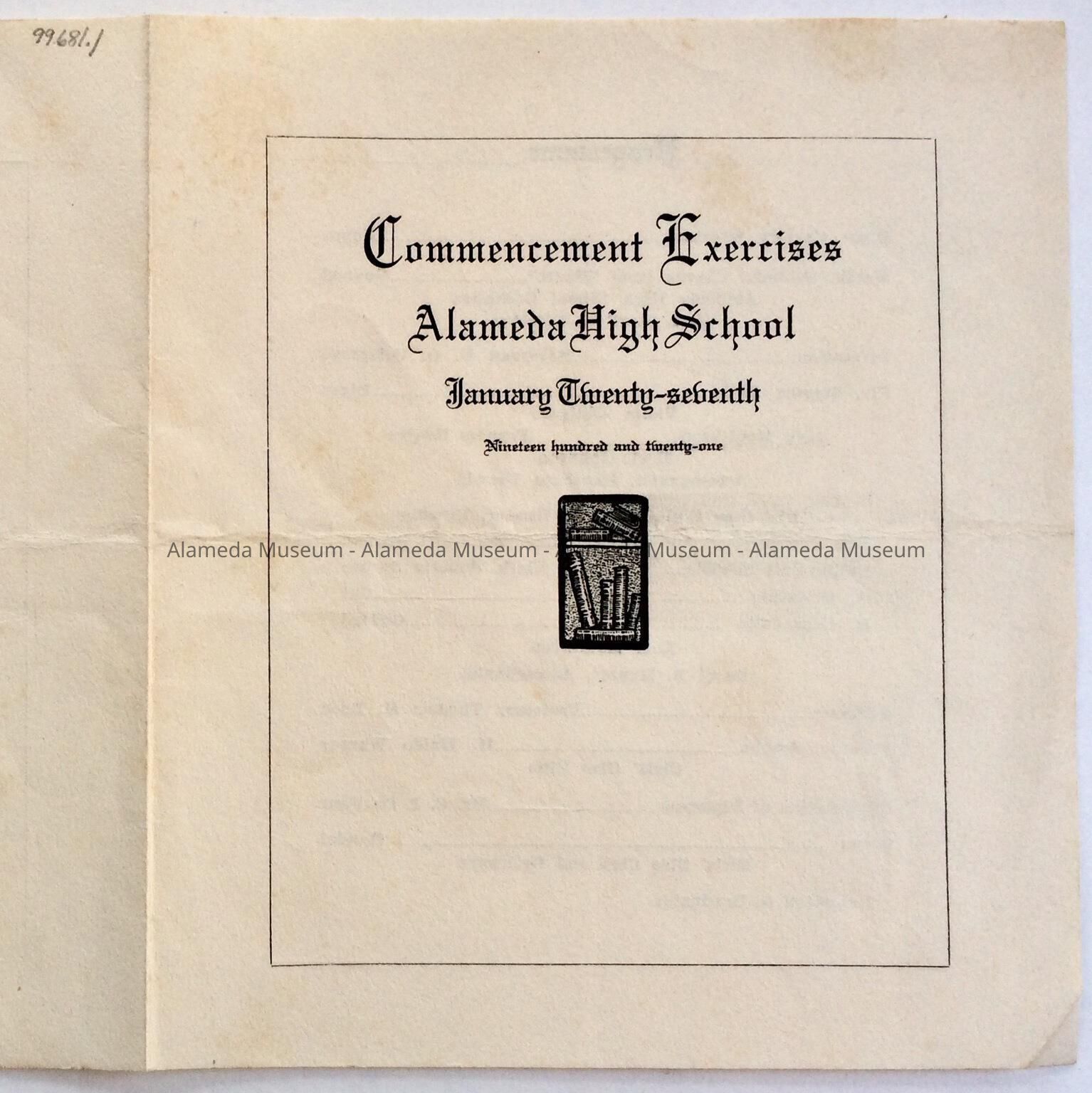 Program listing graduates for commencement exercises, Alameda High School, January 27, 1921.