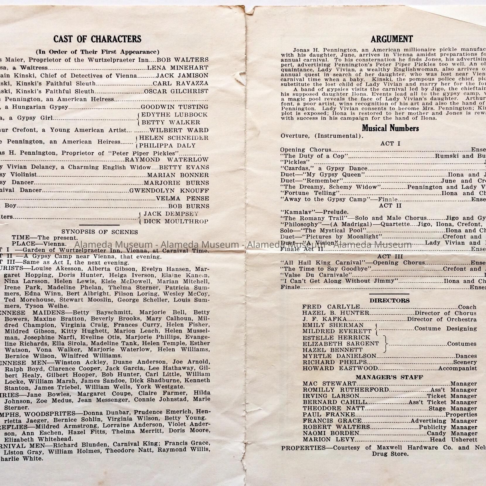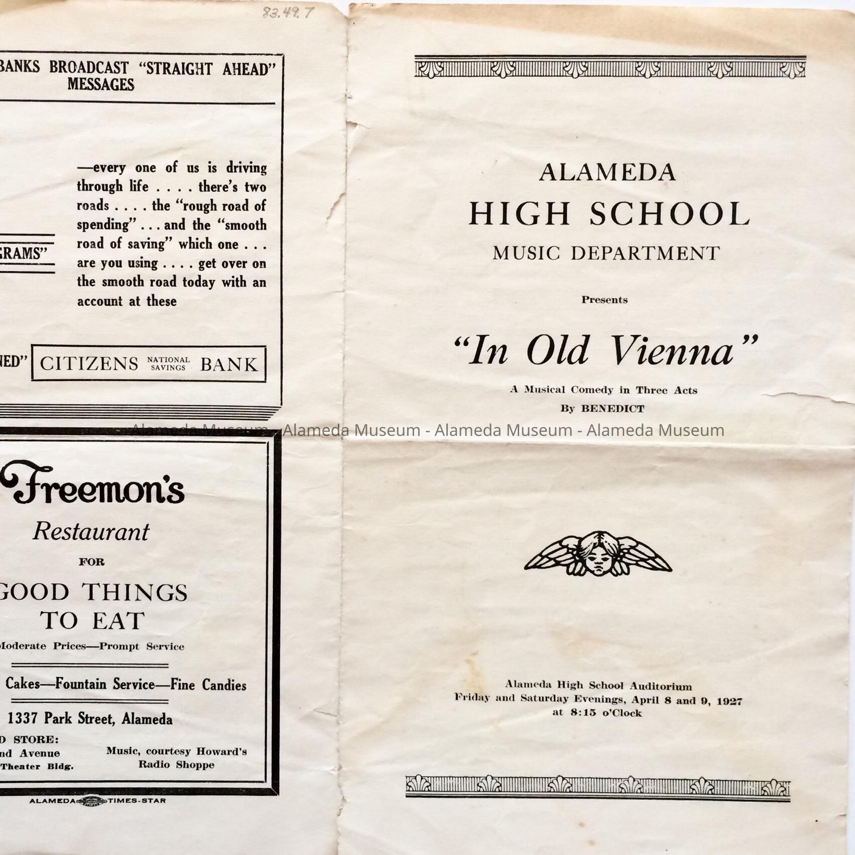 Program for the musical comedy "In Old Vienna", presented by the Alameda High School Music Department, Alameda High School Auditorium, April 8 & 9, 1927.