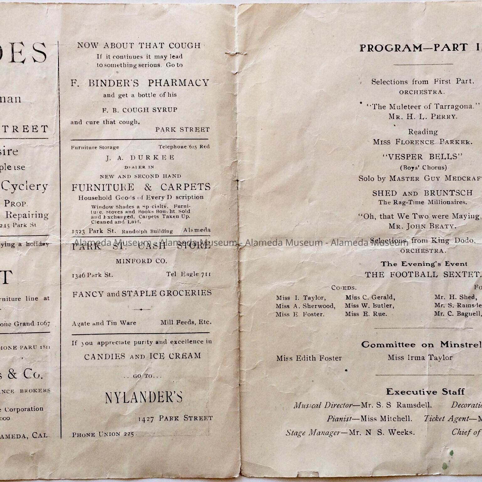 MUSICAL PRODUCTION, "SENIOR MINSTRELS," PERFORMED BY ALAMEDA HIGH SCHOOL STUDENTS AT ARMORÝ HALL, ALAMEDA, DECEMBER 5, 1902. INTERIOR OF PROGRAM DISPLAYS ADVERTISEMENTS OF EARLY PARK STREET MERCHANTS.