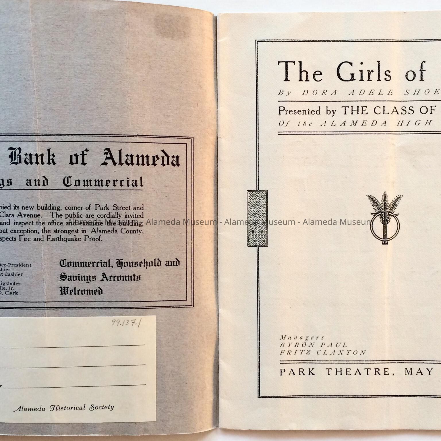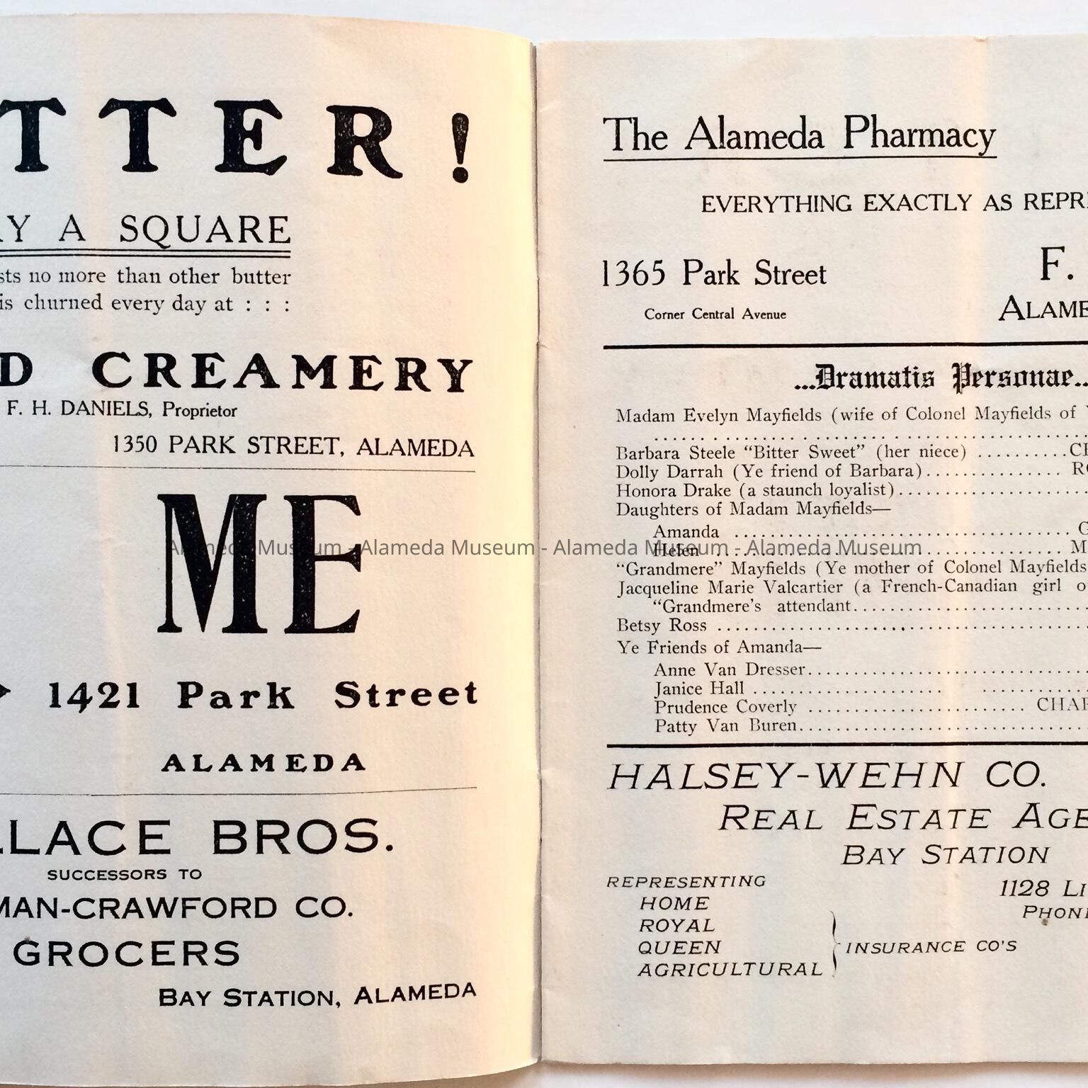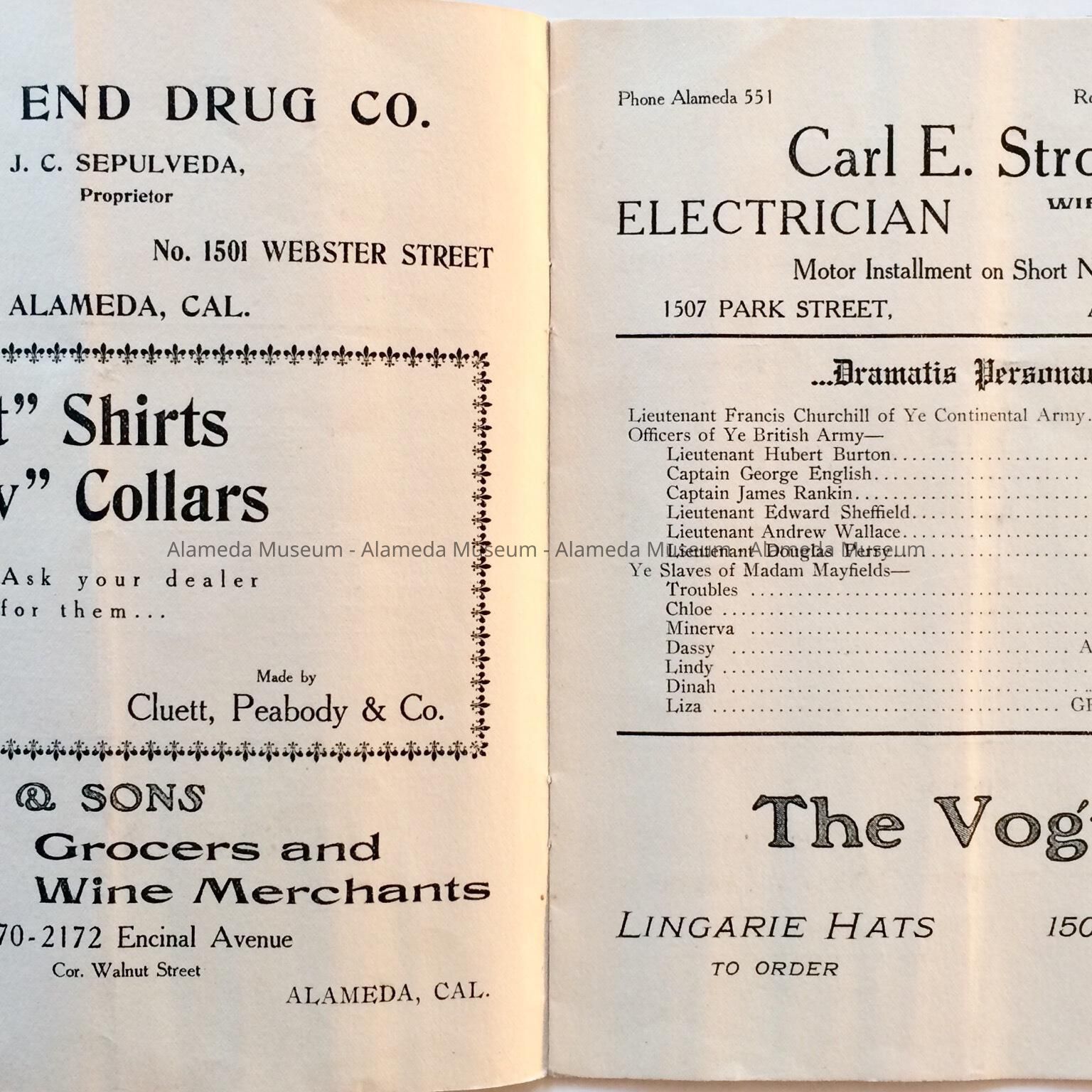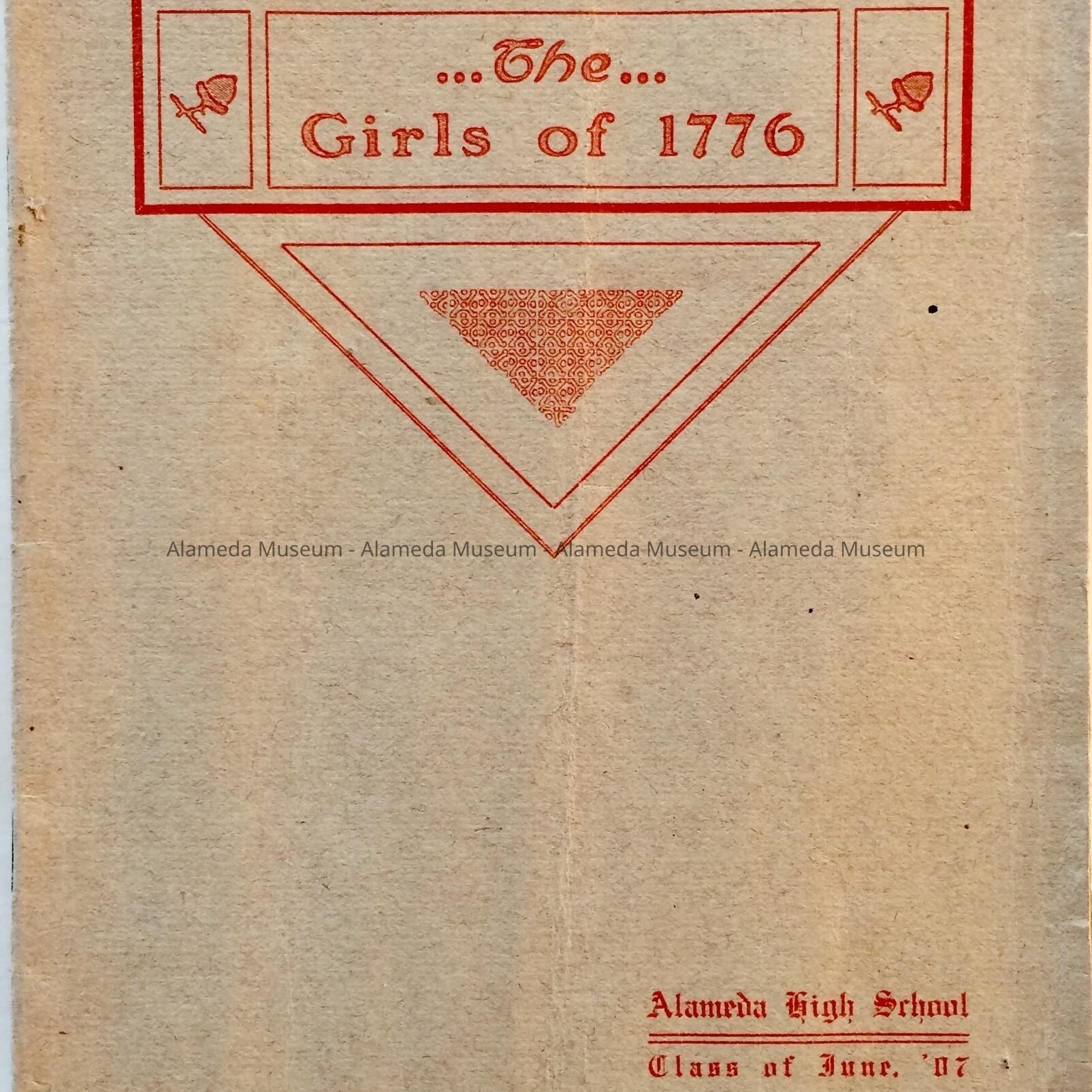 History: Program for the play entitled, "The Girls of 1776" performed by the Class of June 1907 Alameda High School. Publication has ads for many local merchants of the period. Given prior to 1971, numbered 315, and never catalogued.