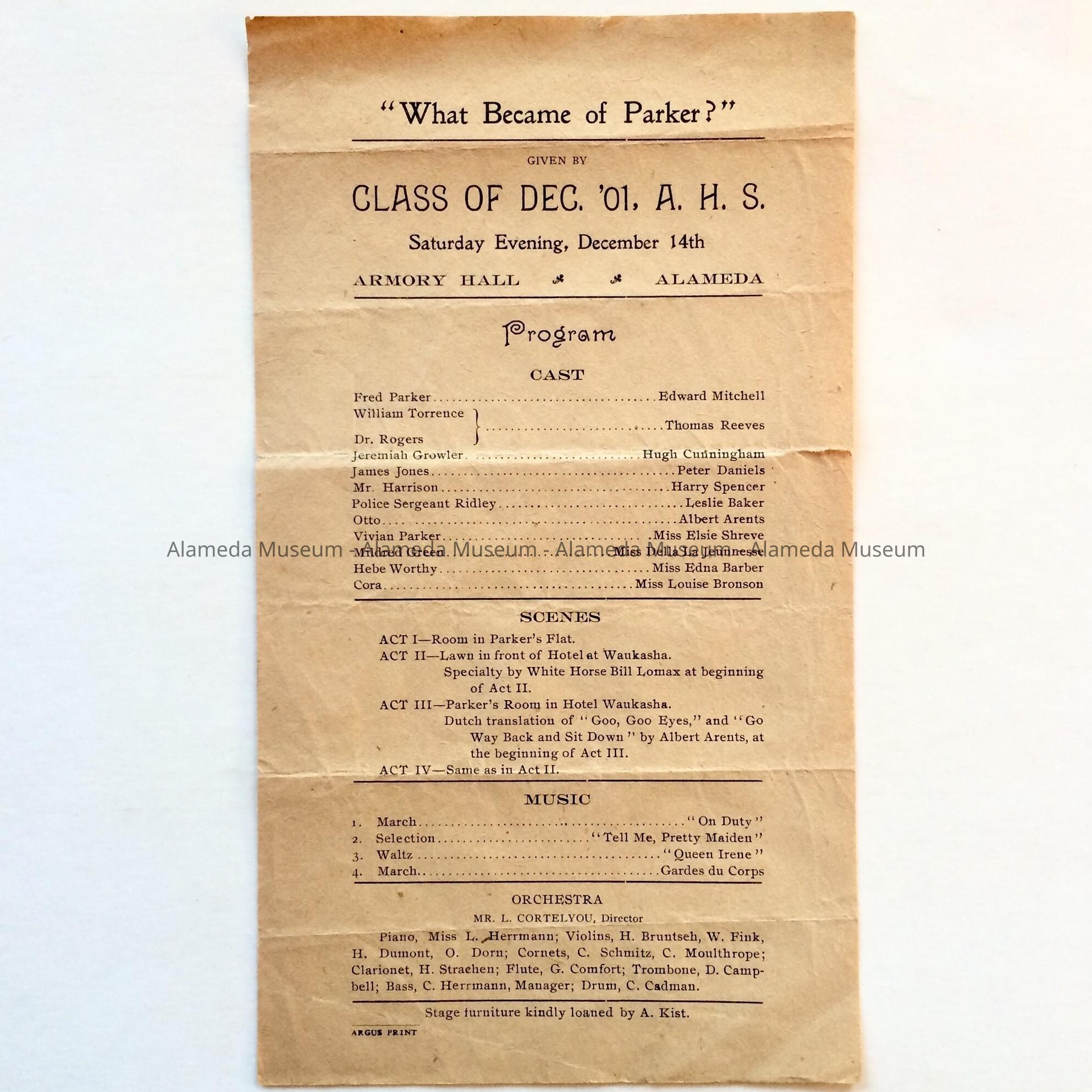 ONE-PAGE PROGRAM FOR THE ALAMEDA HIGH SCHOOL PLAY, "WHAT BECAME OF PARKER?" PRESENTED ON DECEMBER 14, 1901 AT ARMORY HALL, ALAMEDA, CALIFORNIA.