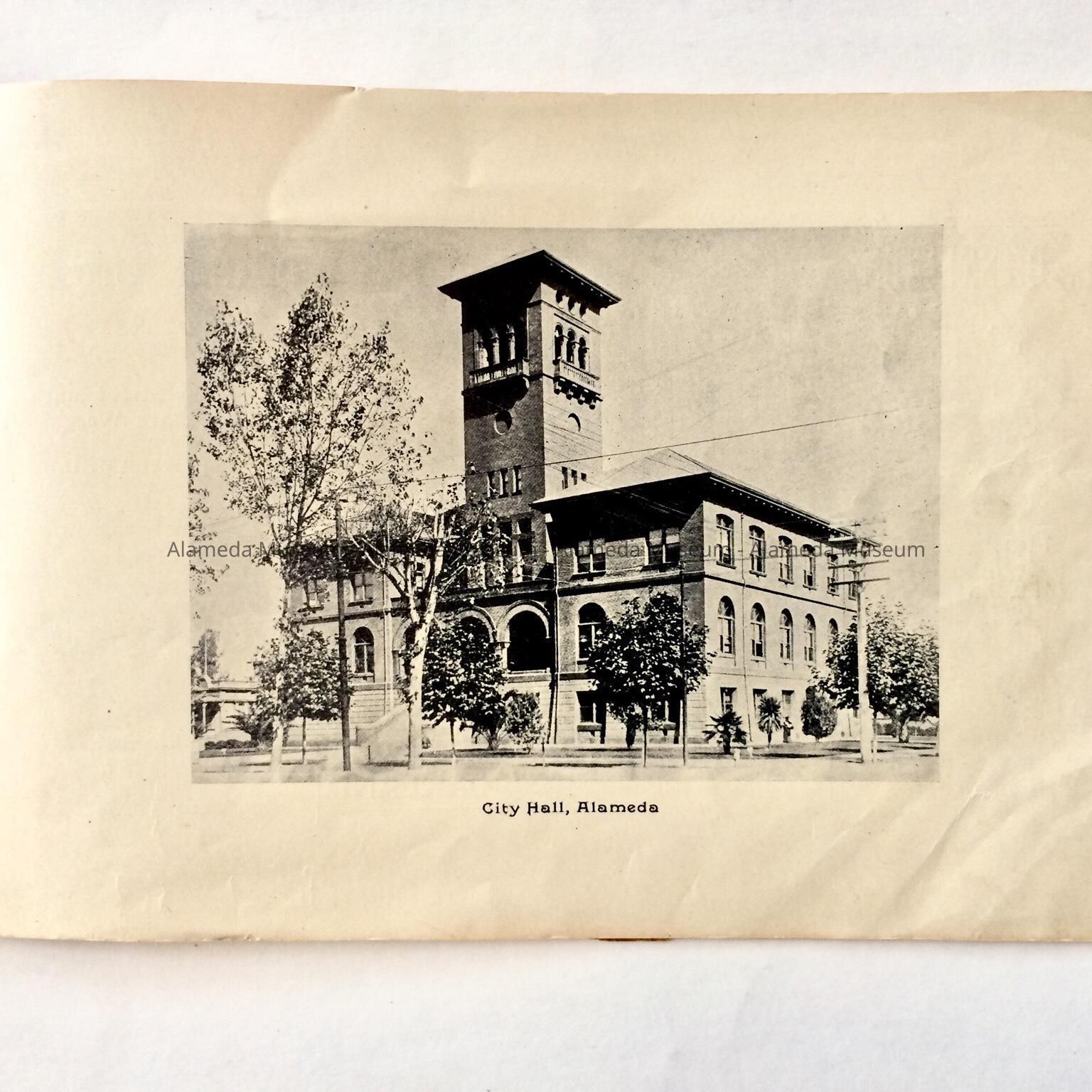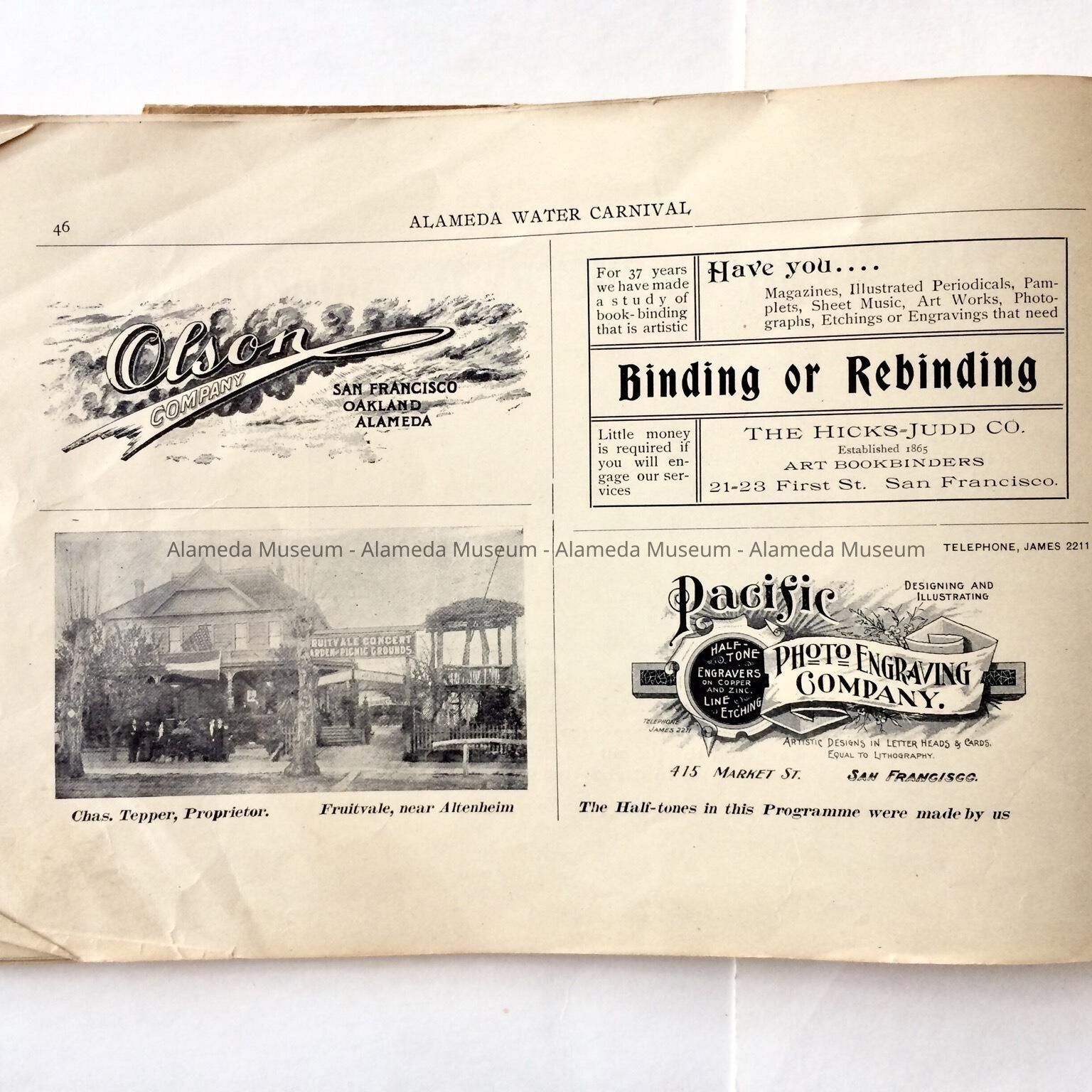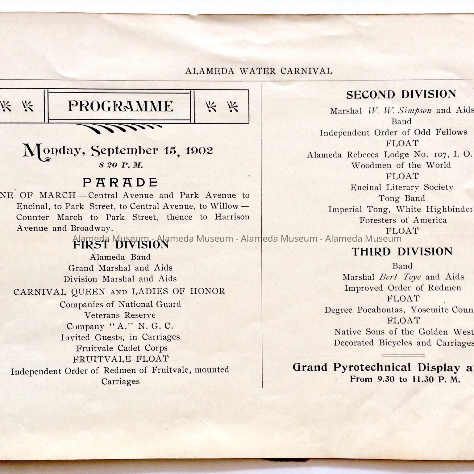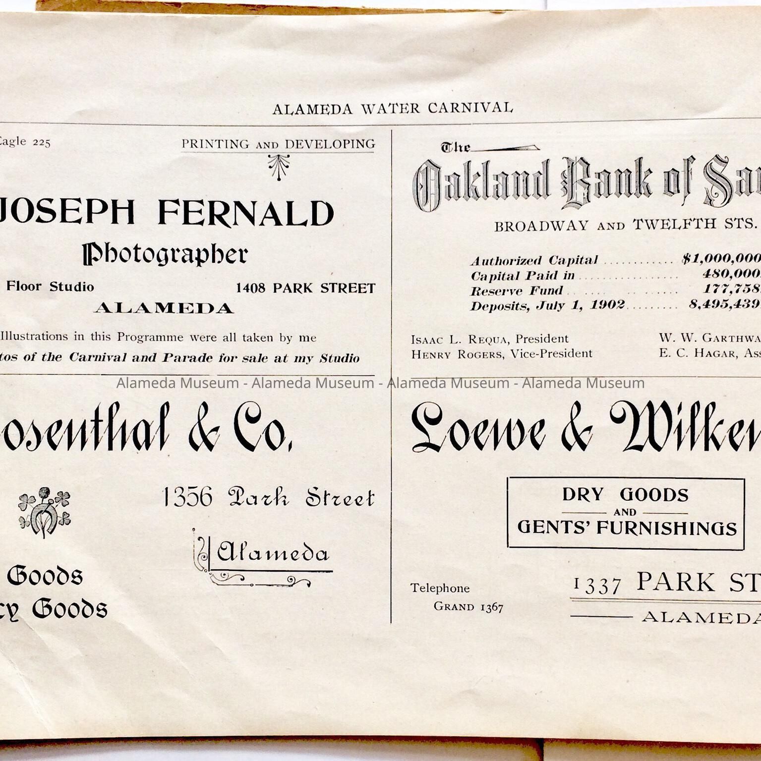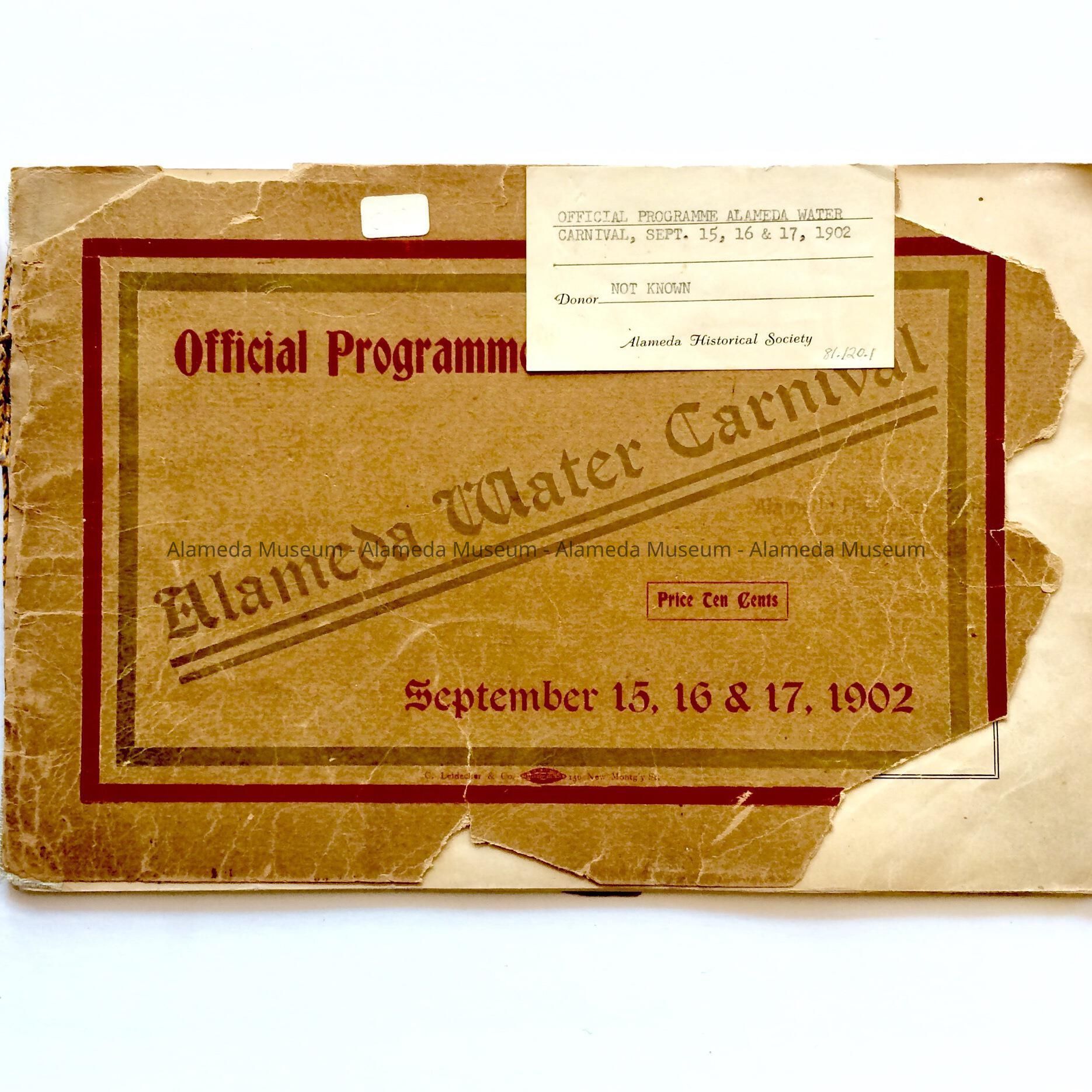 Description: This is a soft-covered booklet of 48 pages. The cover is cream colored with printing in red and gold which dates the "Official Programme Alameda Water Carnival September 15, 16, 17, 1902". The interior of the book has photographic views of Alameda such as the city hall, the Park Street Bridge, et cetera. It also contains many ads of local merchants of this time era.