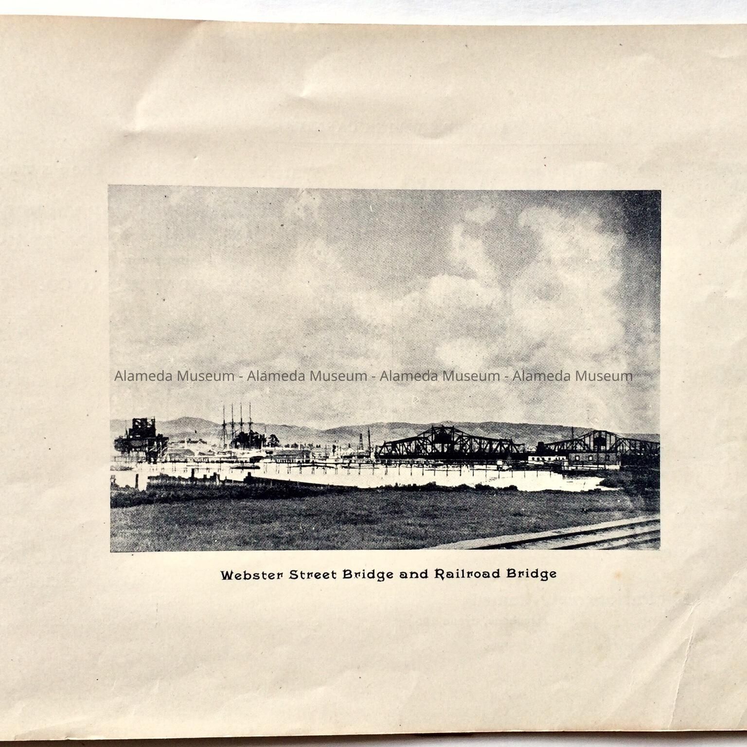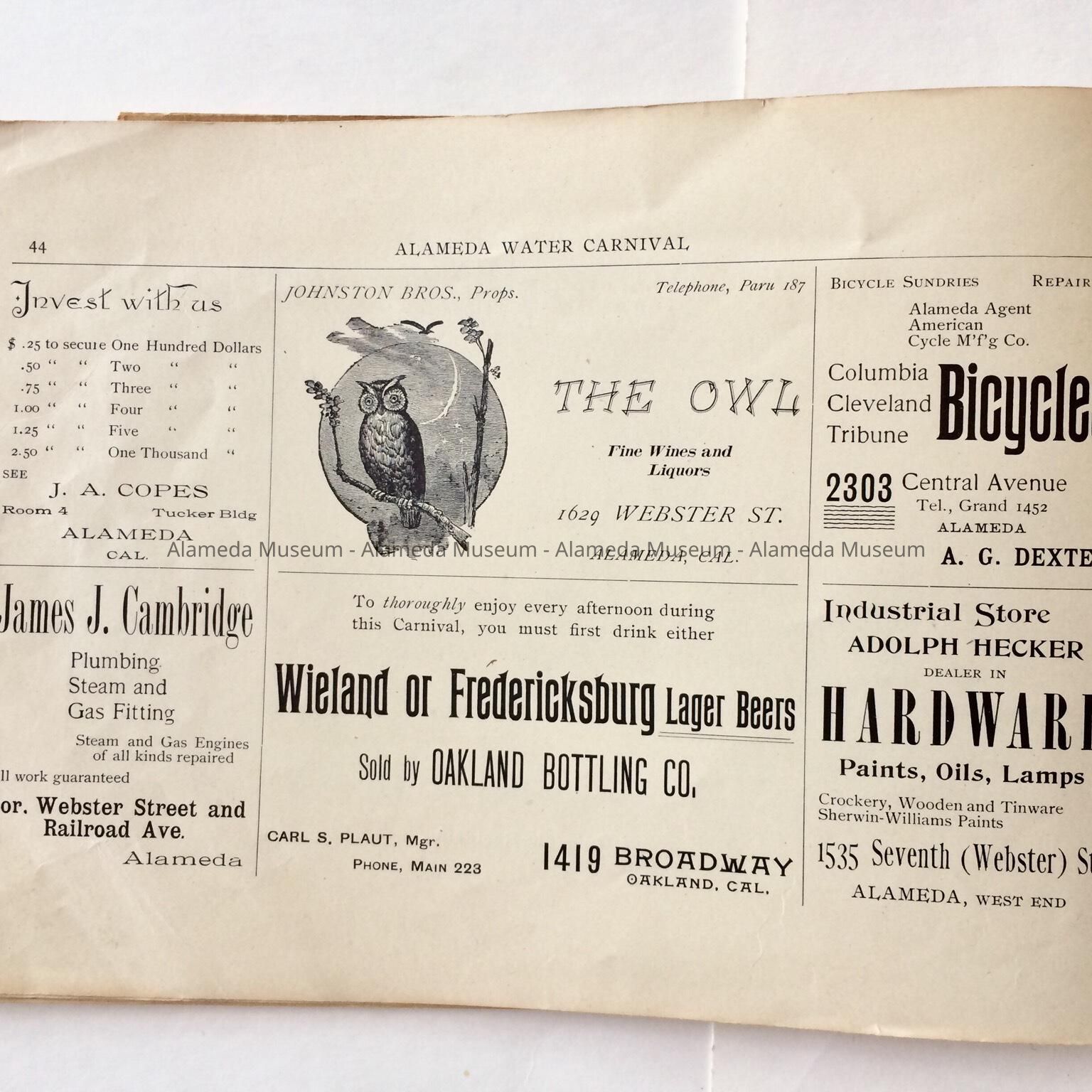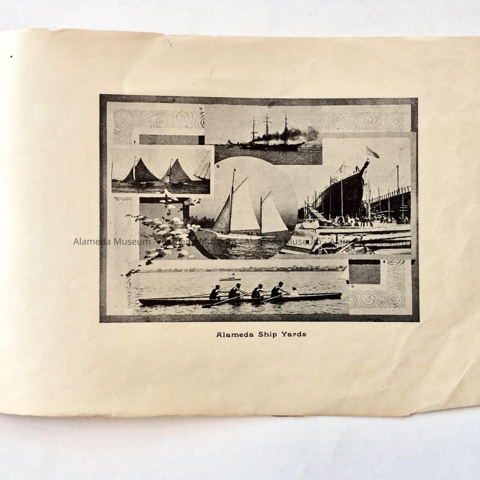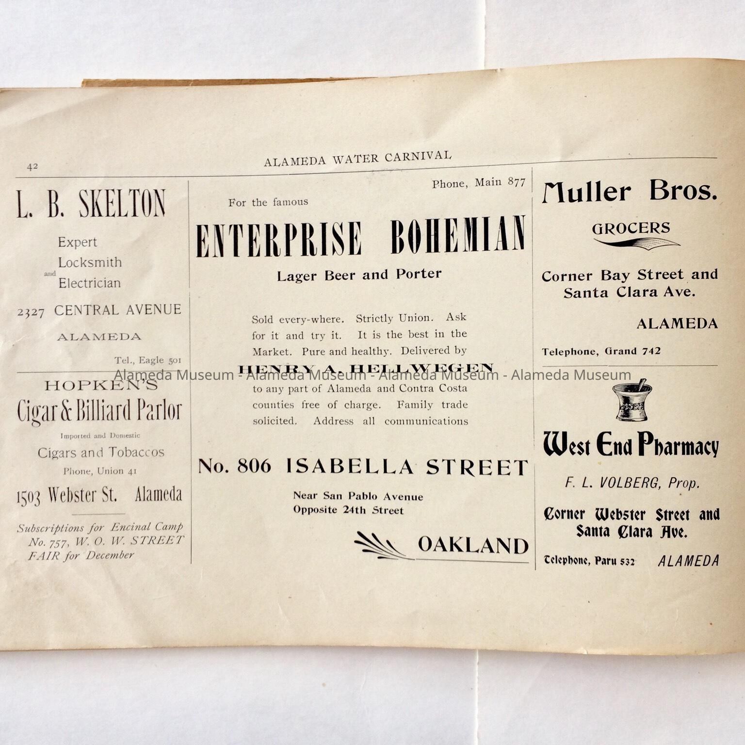 Description: This is a soft-covered booklet of 48 pages. The cover is cream colored with printing in red and gold which dates the "Official Programme Alameda Water Carnival September 15, 16, 17, 1902". The interior of the book has photographic views of Alameda such as the city hall, the Park Street Bridge, et cetera. It also contains many ads of local merchants of this time era.