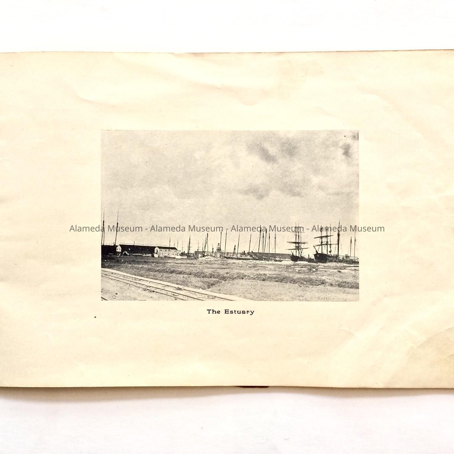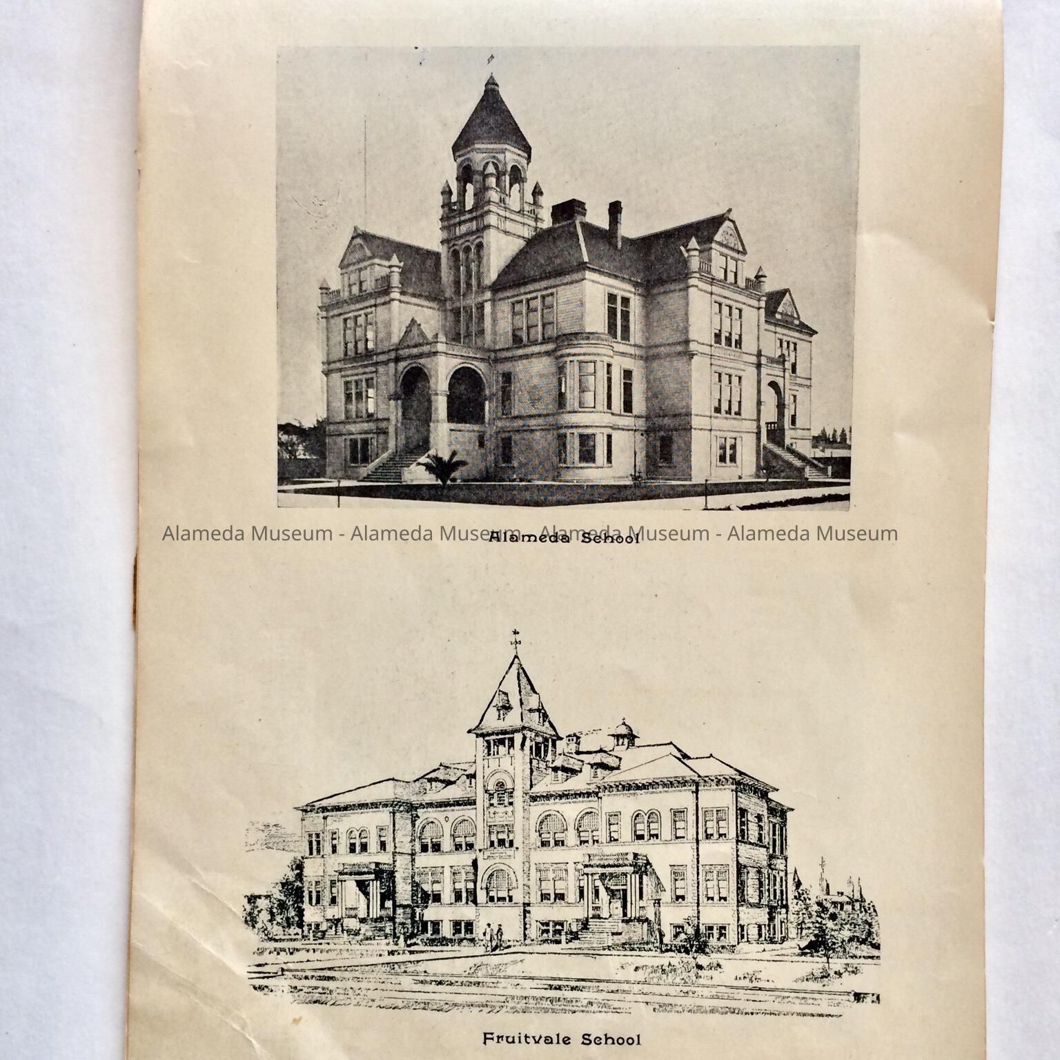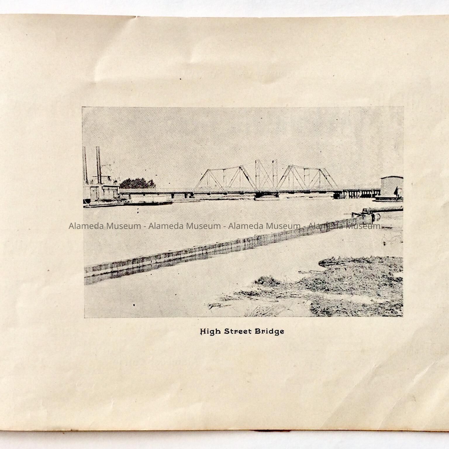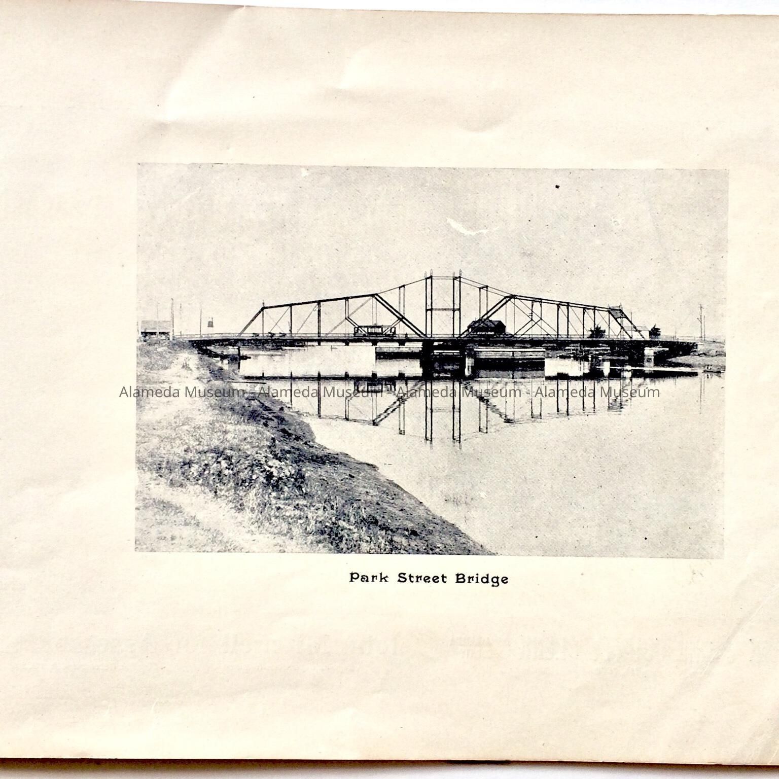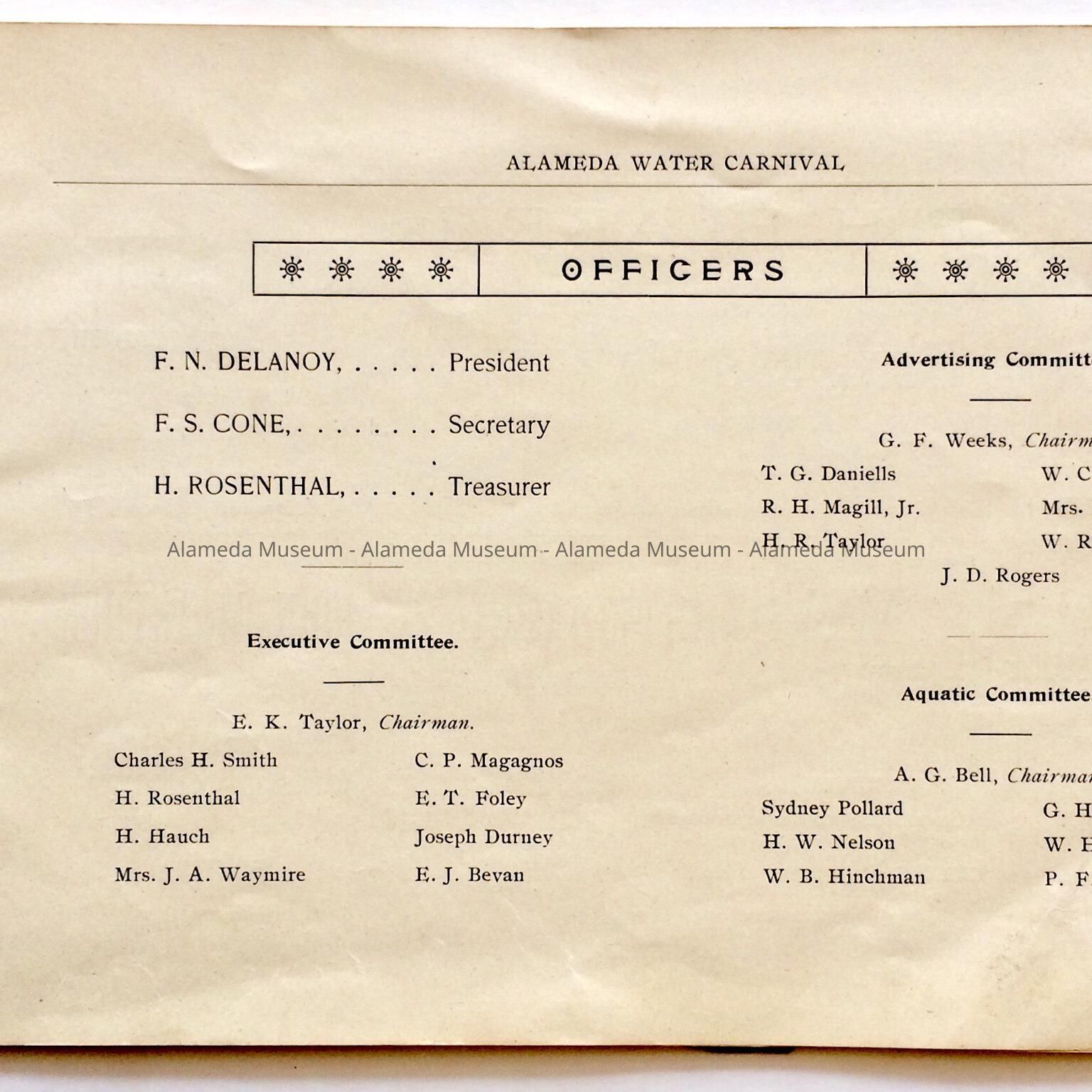 Description: This is a soft-covered booklet of 48 pages. The cover is cream colored with printing in red and gold which dates the "Official Programme Alameda Water Carnival September 15, 16, 17, 1902". The interior of the book has photographic views of Alameda such as the city hall, the Park Street Bridge, et cetera. It also contains many ads of local merchants of this time era.