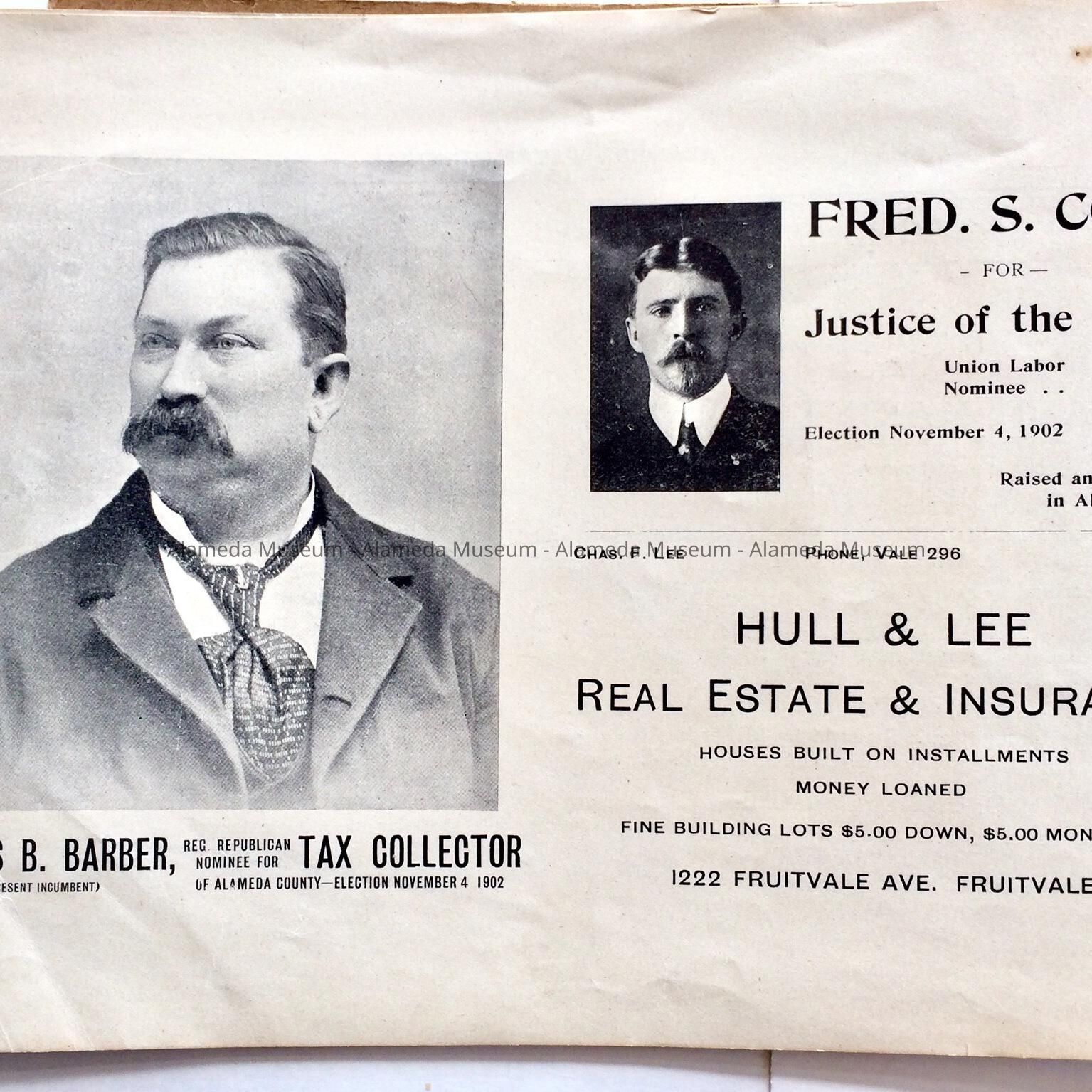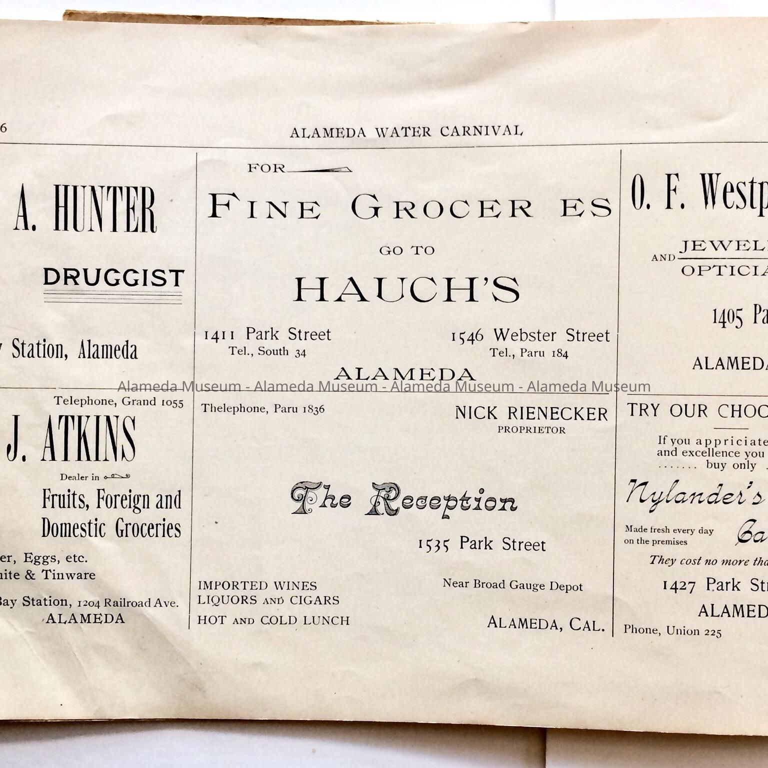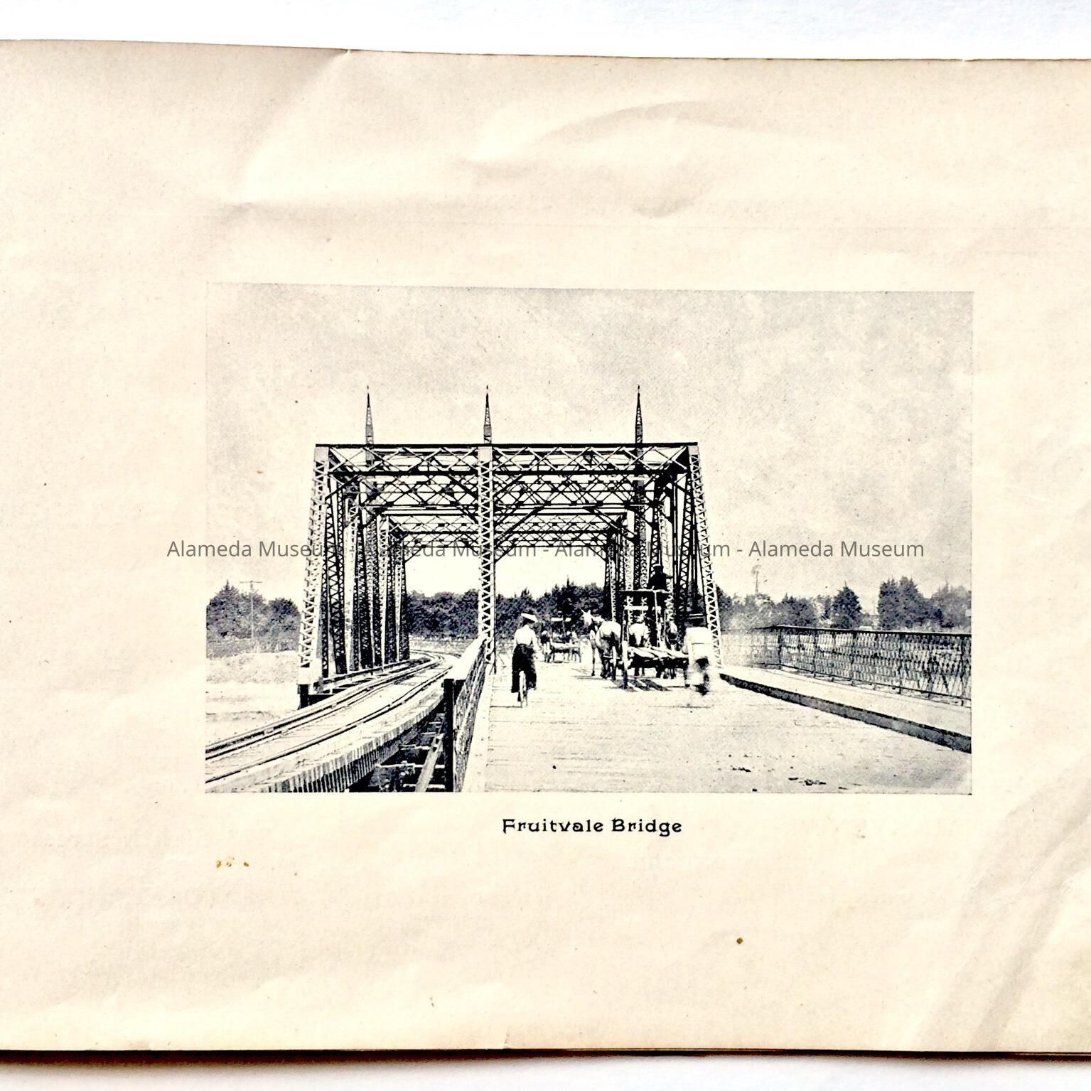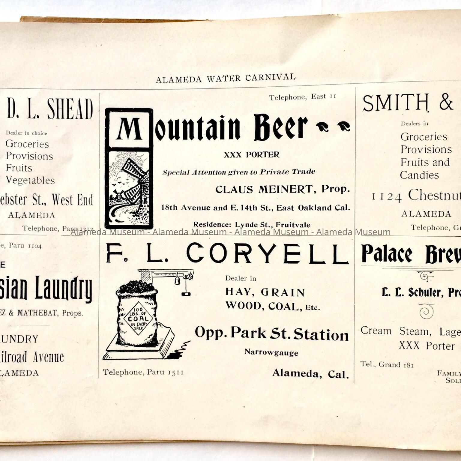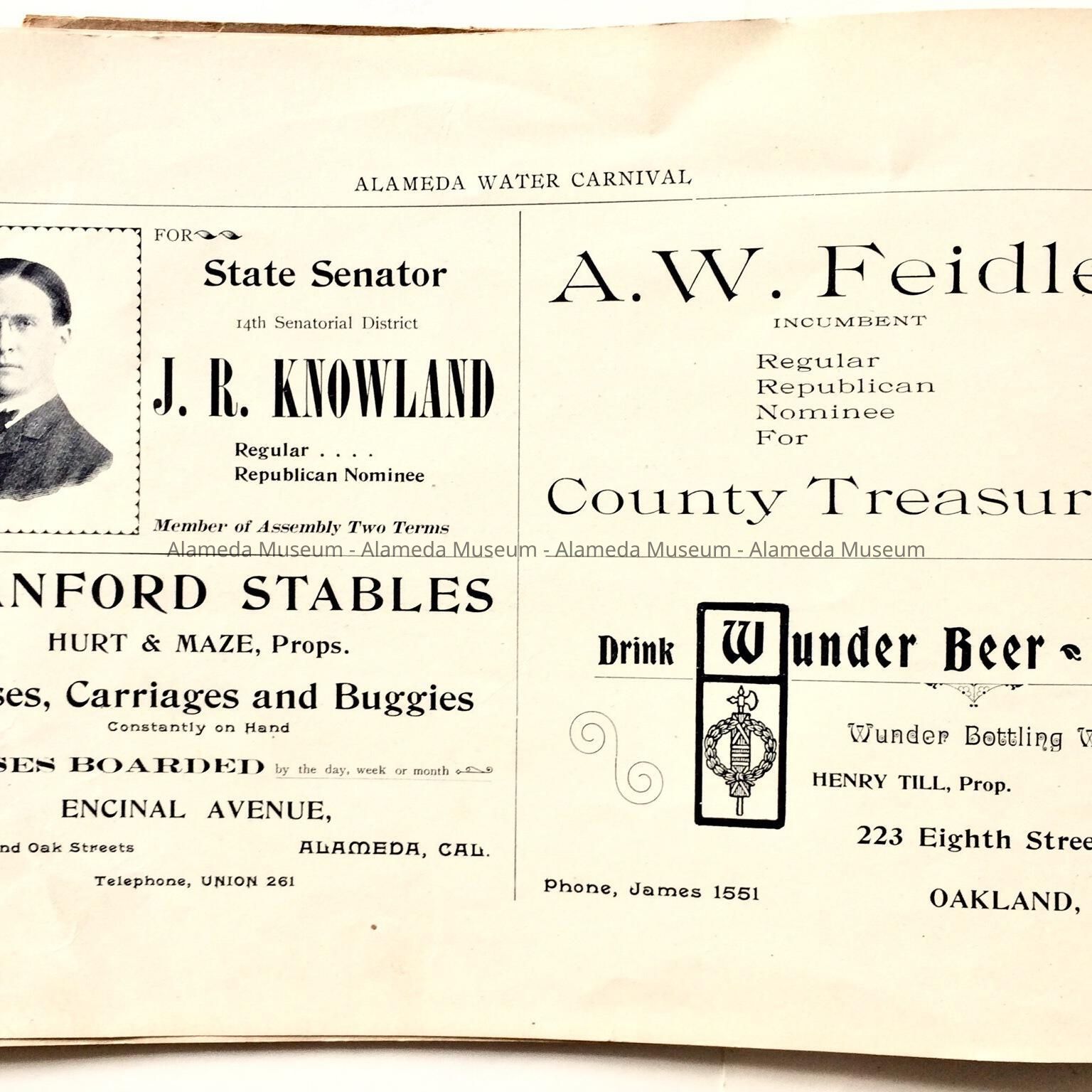 Description: This is a soft-covered booklet of 48 pages. The cover is cream colored with printing in red and gold which dates the "Official Programme Alameda Water Carnival September 15, 16, 17, 1902". The interior of the book has photographic views of Alameda such as the city hall, the Park Street Bridge, et cetera. It also contains many ads of local merchants of this time era.