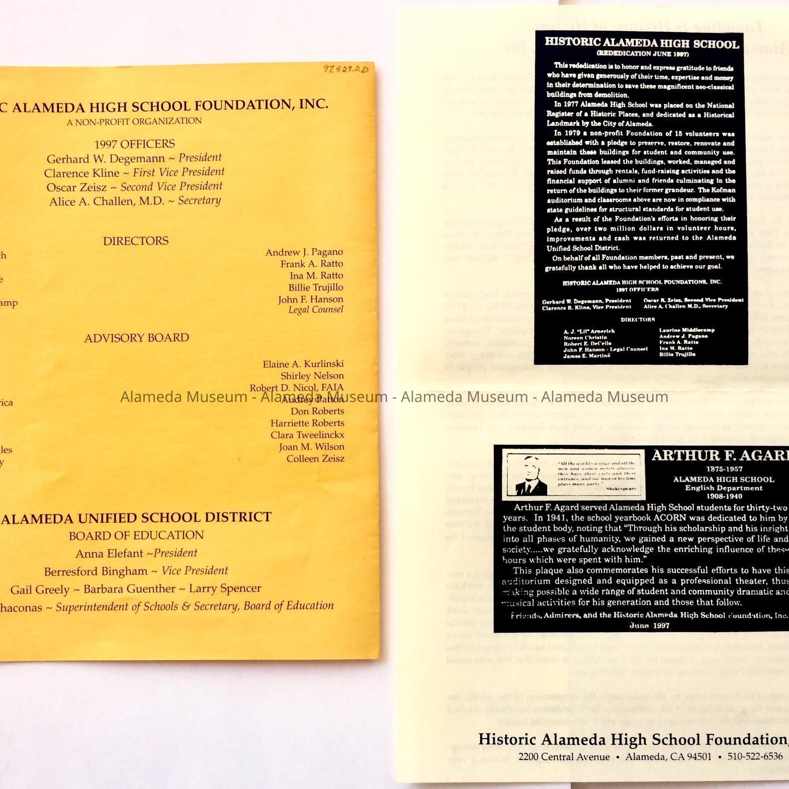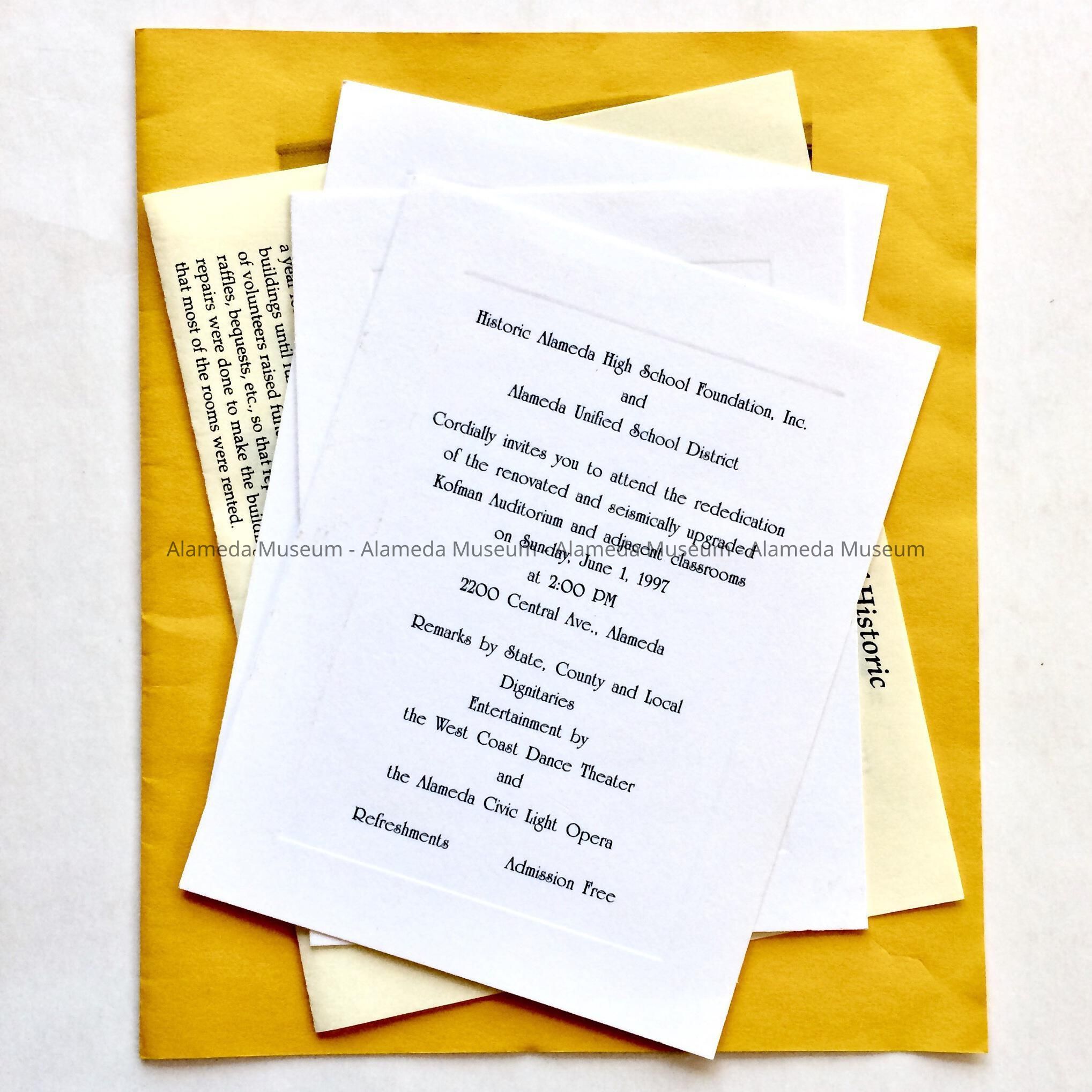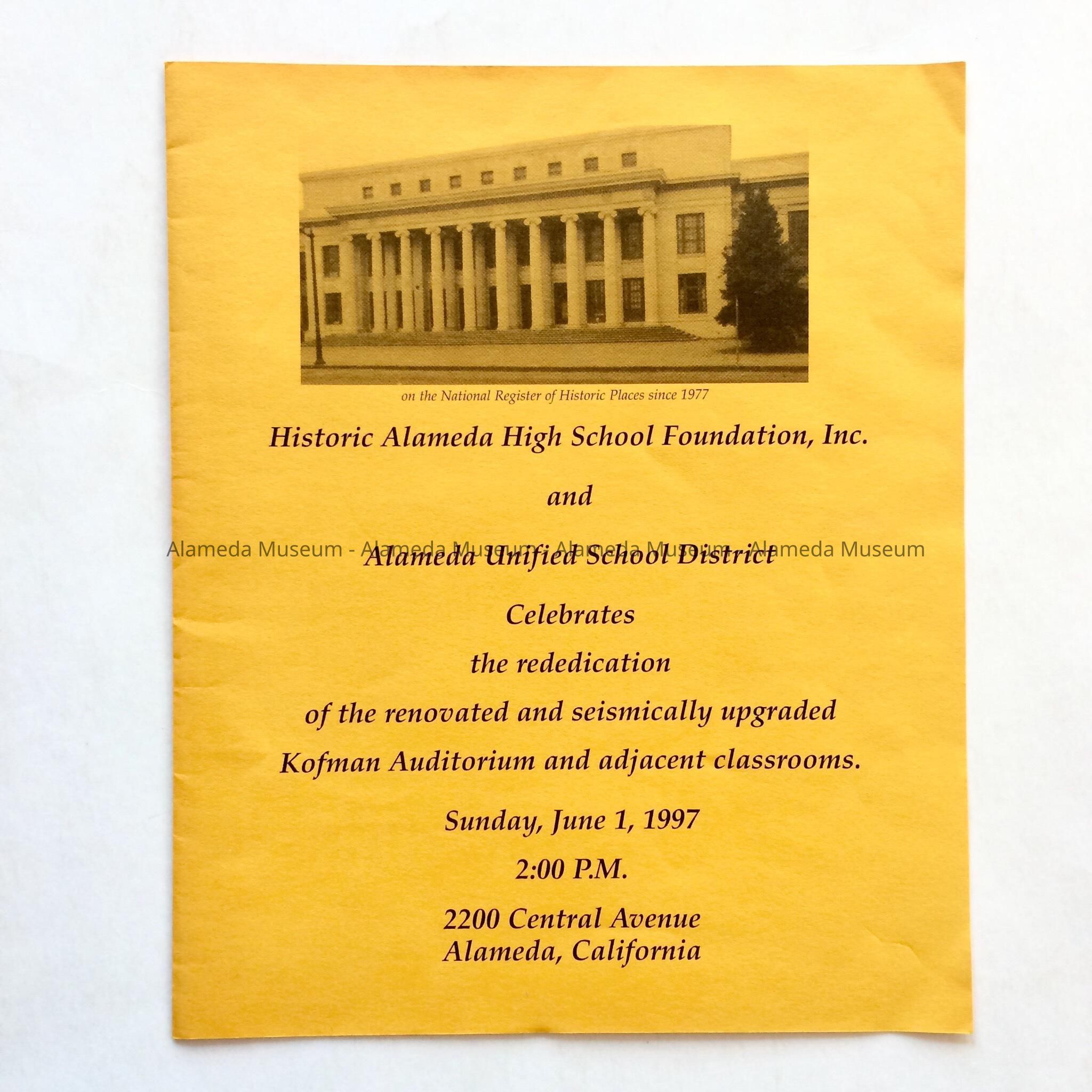 PROGRAM AND INVITATIONS TO THE REDEDICATION OF THE RENOVATED AND SEISMICALLY UPGRADED KOFMAN AUDITORIUM, HELD ON SUNDAY, JUNE 1, 1997, 2:00 PM, 2200 CENTRAL AVENUE, ALAMEDA, CA.