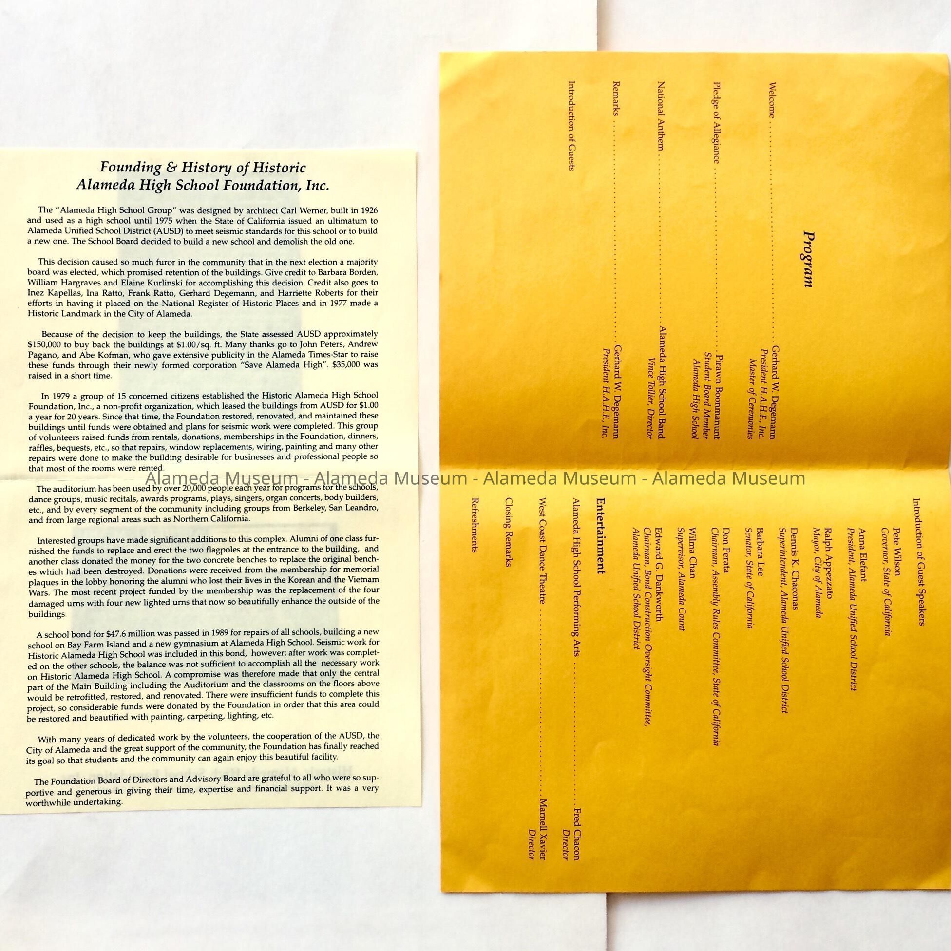 D. PROGRAM, PRINTED ON GOLD-COLORED PAPER, WITH ILLUSTRATION OF AUDITORIUM ENTRANCE, HISTORIC ALAMEDA HIGH SCHOOL.