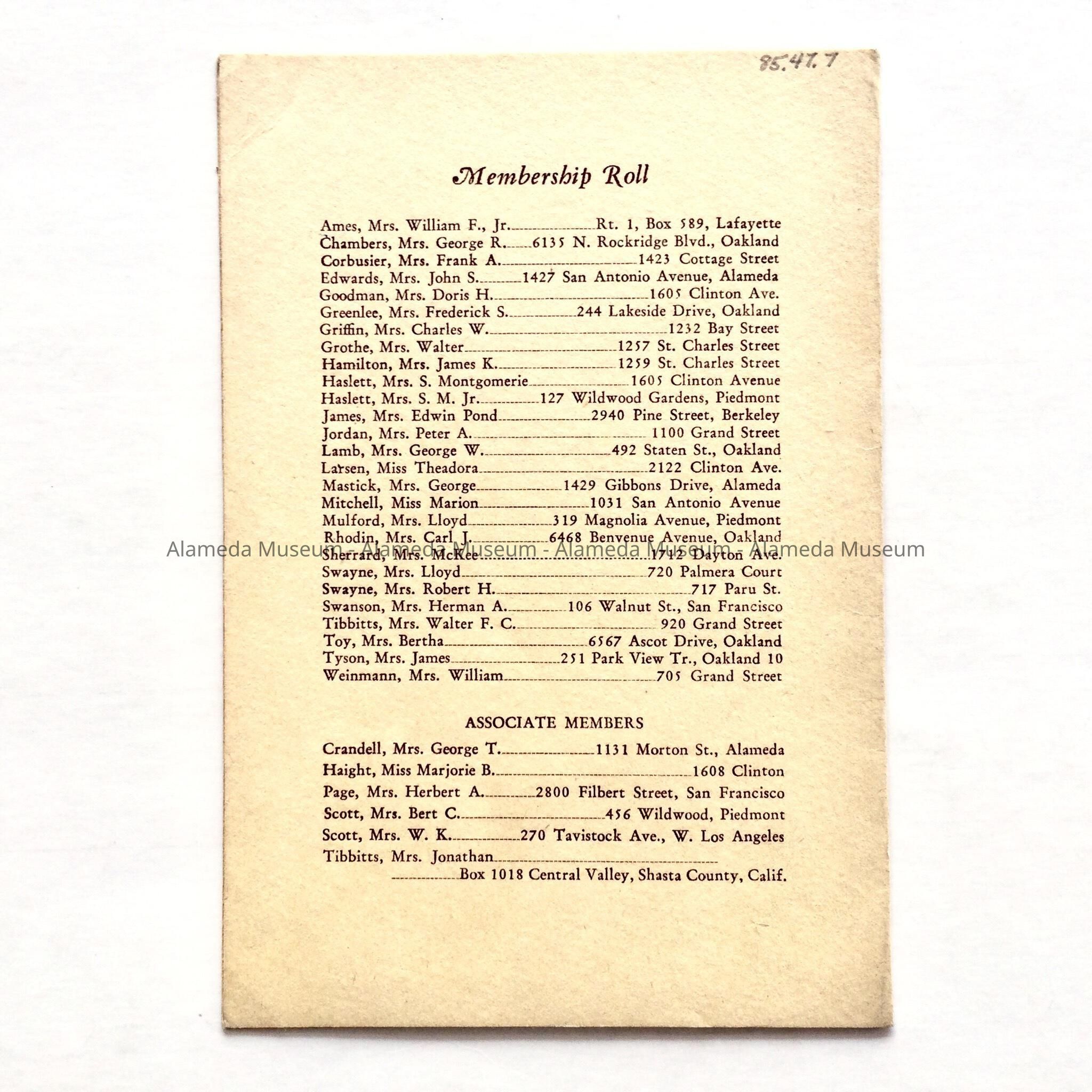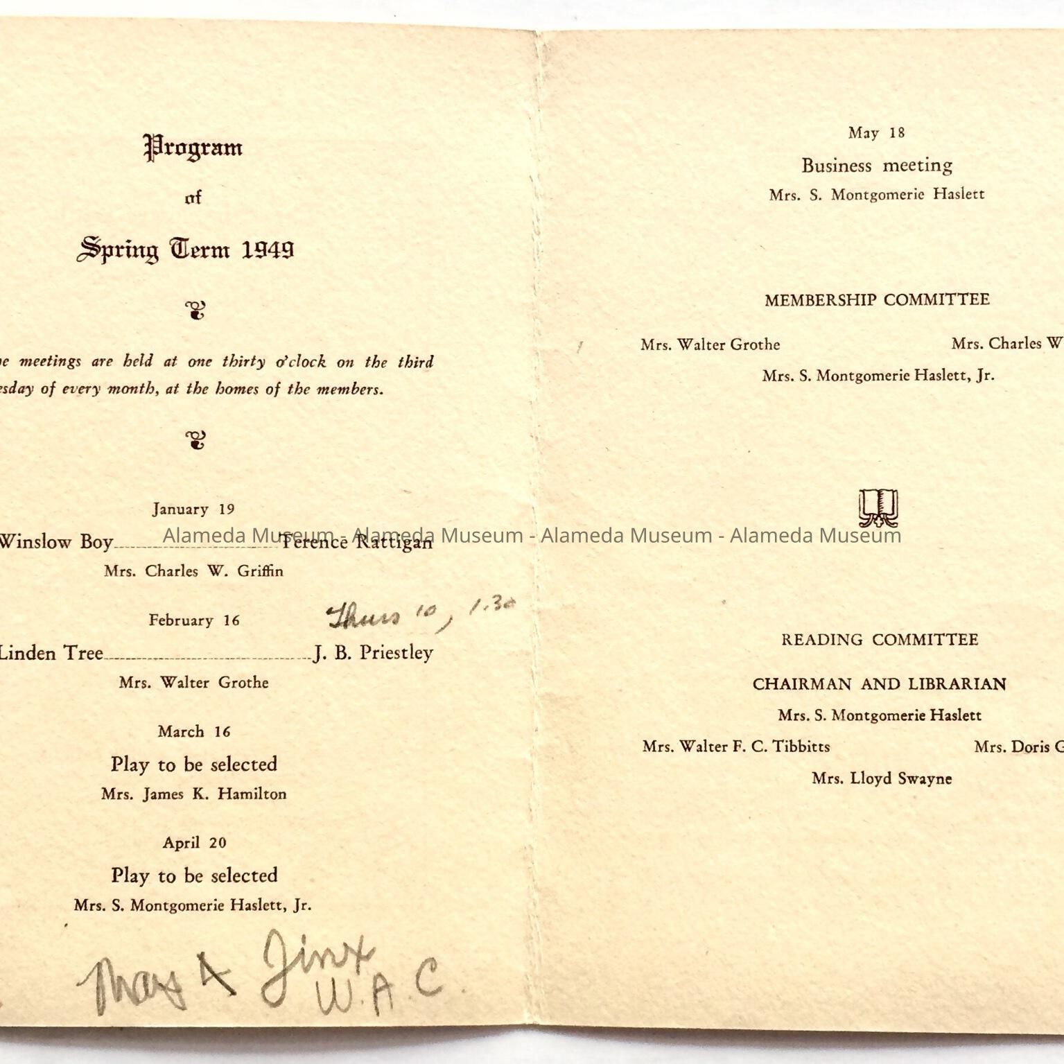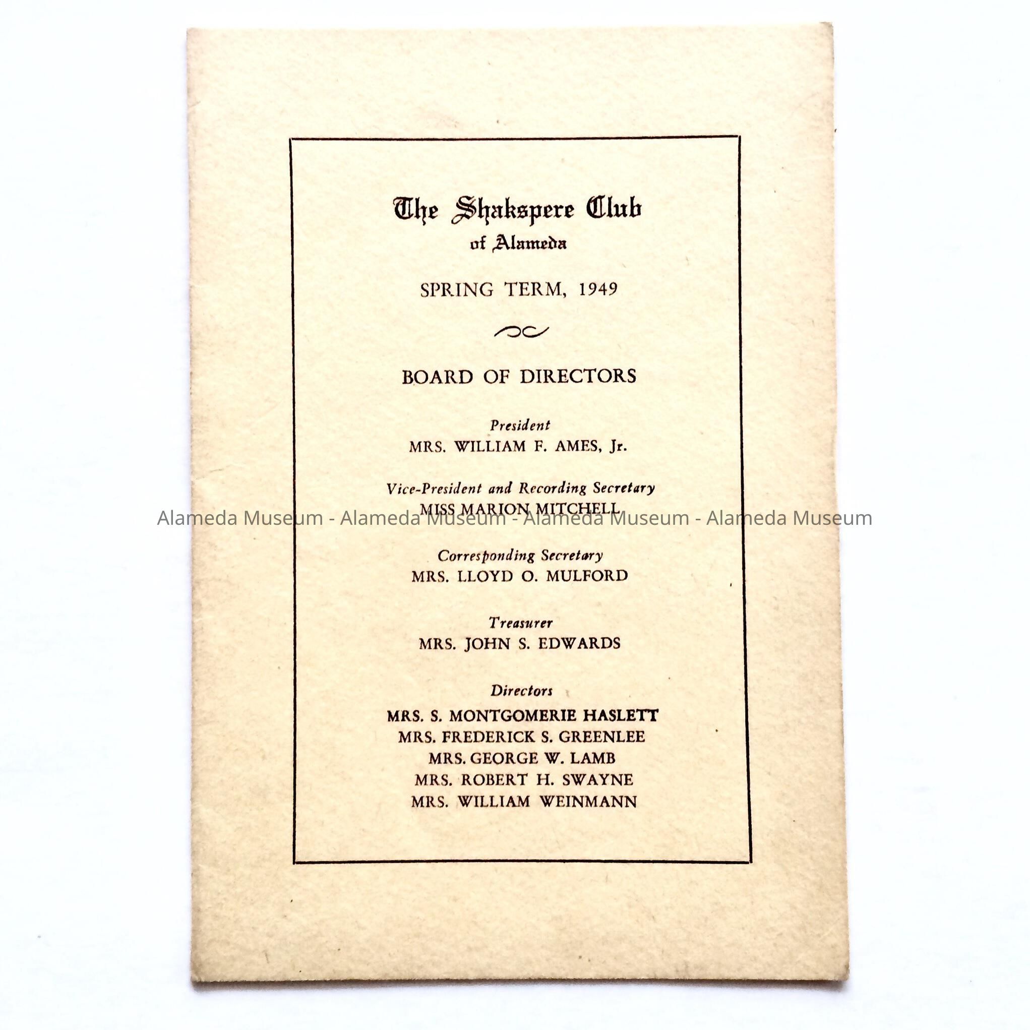 History of Object: Booklet containing the Board of Directors-1949, program for the Spring term (1949), and membership roll of the Shakspere Club, Alameda, Calif.
