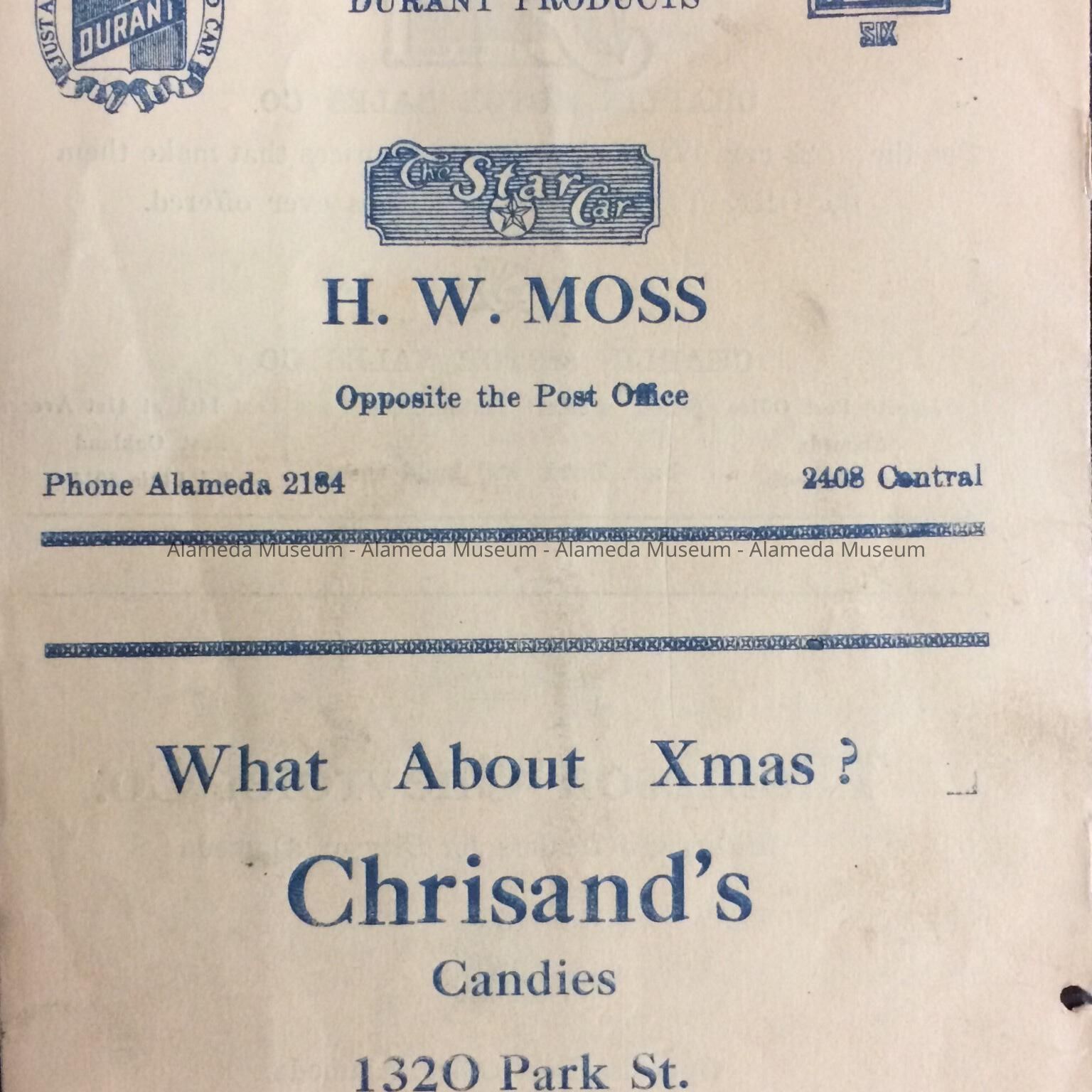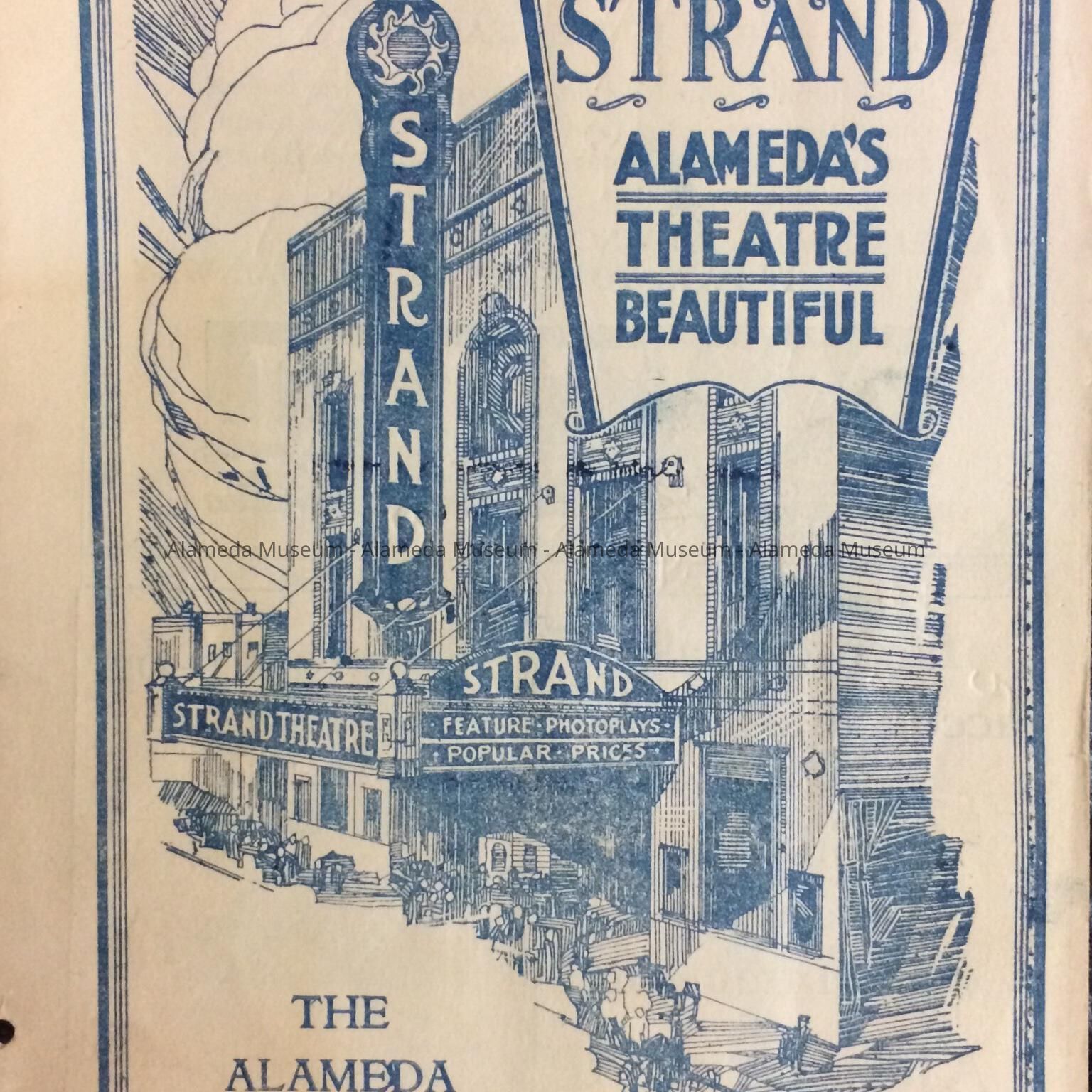 Description: Booklet type program (soft cover) four pages, cover illustrated (blue print) with a drawing of the exterior of the Strand Theatre, Park Street, Alameda. The contents of the booklet contains illustrated movie and business ads for local merchants of the period. Size: 5 3/4x8½ inches.