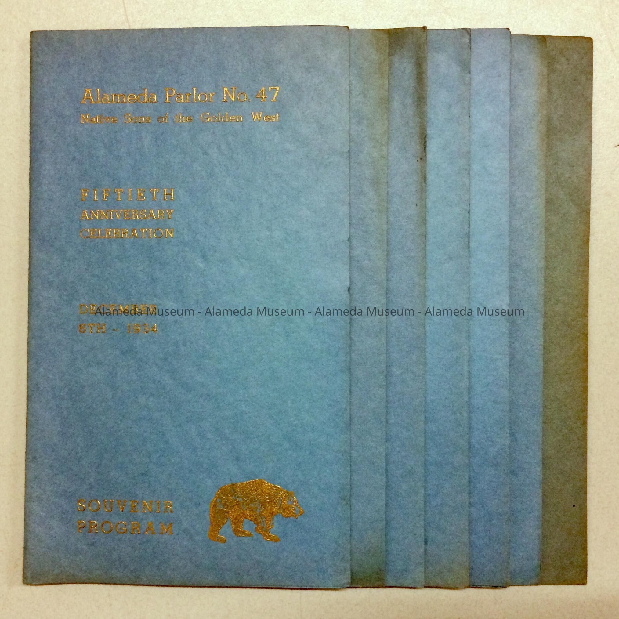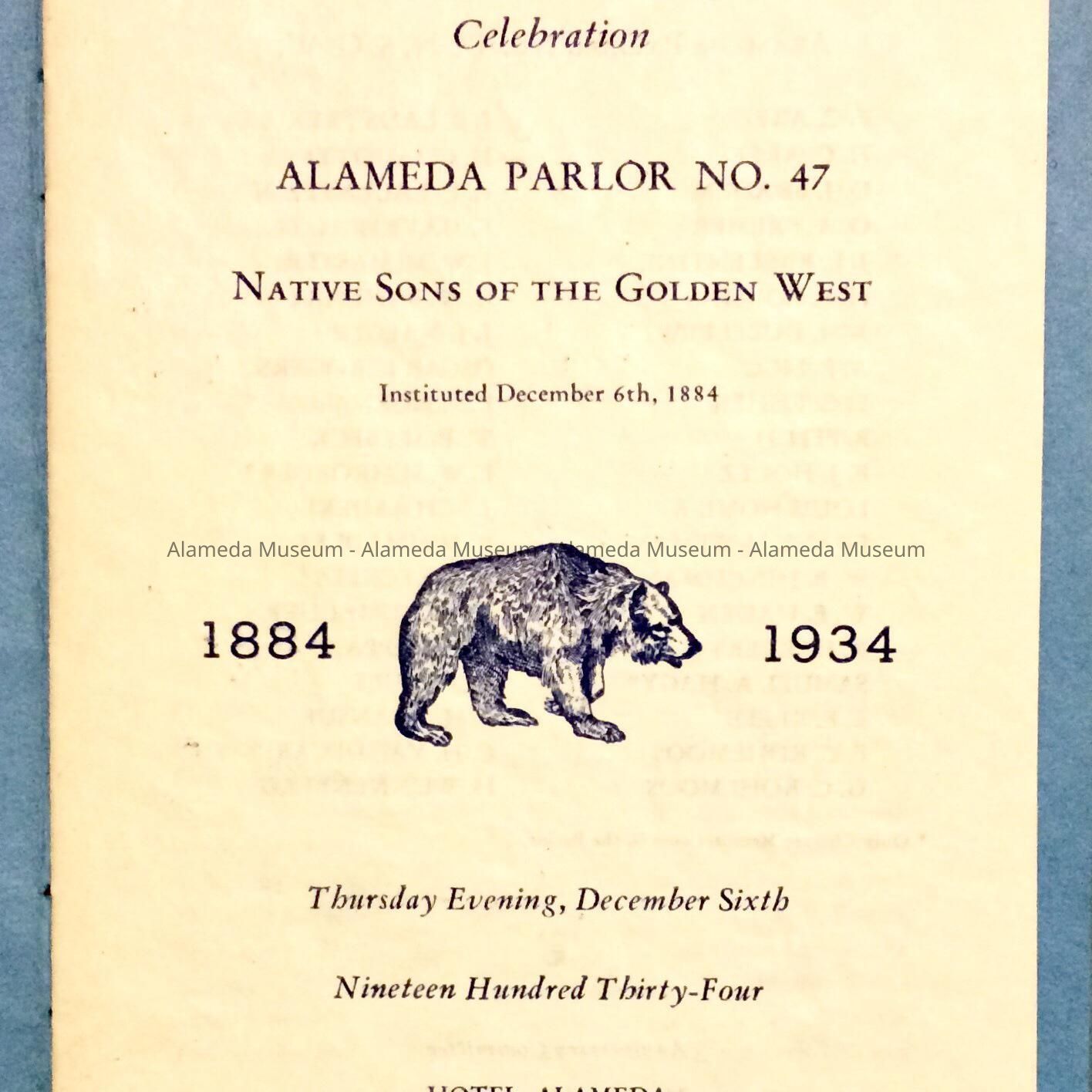 SOUVENIR PROGRAM OF DECEMBER 6, 1934, CELEBRATING THE 50th ANNIVERSARY OF THE ALAMEDA PARLOR NO. 47, NATIVE SONS OF THE GOLDEN WEST. PROGRAM INCLUDES A LIST OF PAST PRESIDENTS, CHARTER MEMBERS, ETC. OF THE ORGANIZATION.