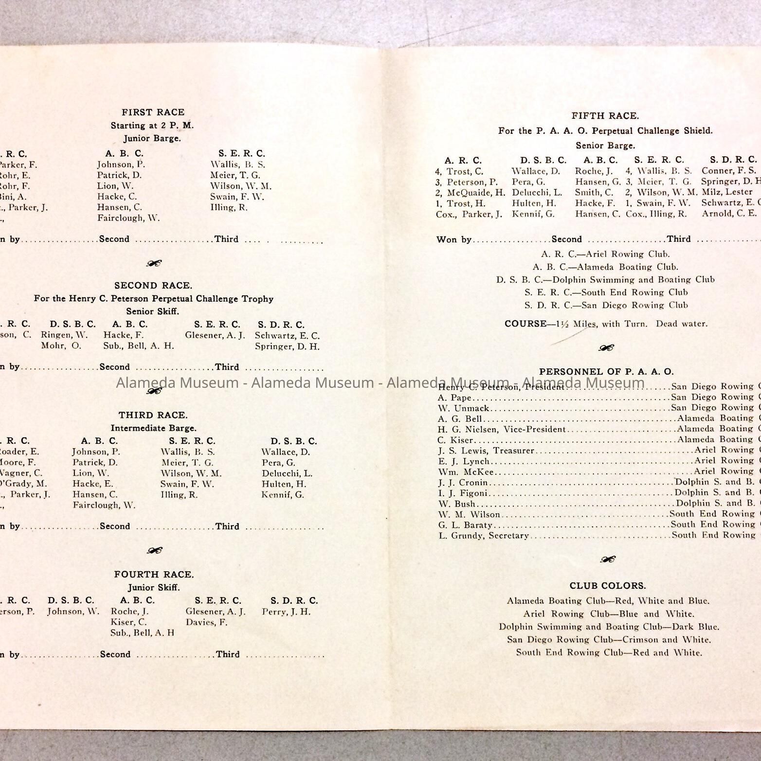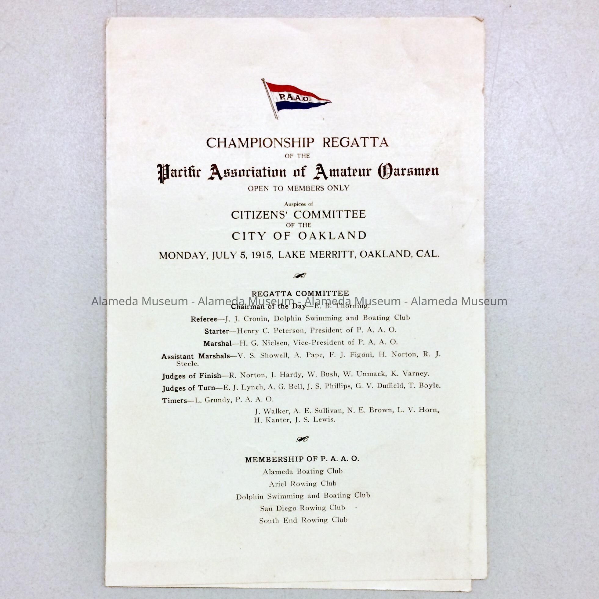 Program of the Championship Regatta of the Pacific Association of Amateur Oarsmen, held on July 5, 1915, Lake Merritt, Oakland, Cal. The Alameda Boating Club was a participant in the event.