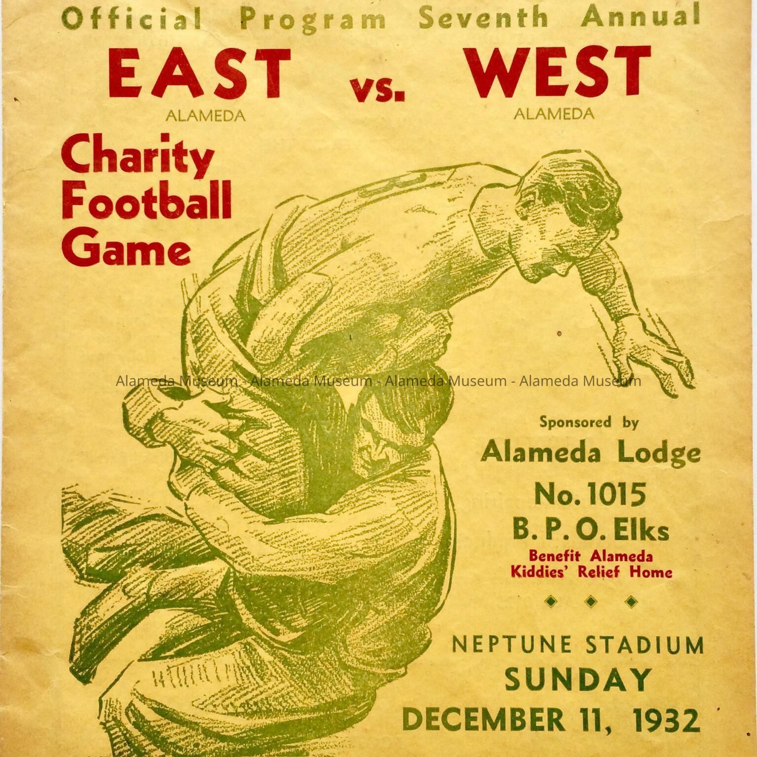 Official program of the Seventh Annual East v. West Alameda Charity Football Game, sponsored by the Alameda Lodge No. 1015 Elks, held at the Neptune Stadium, Sunday, December 11, 1932. The program is illustrated with portraits of some of the players and includes ads for local businesses.