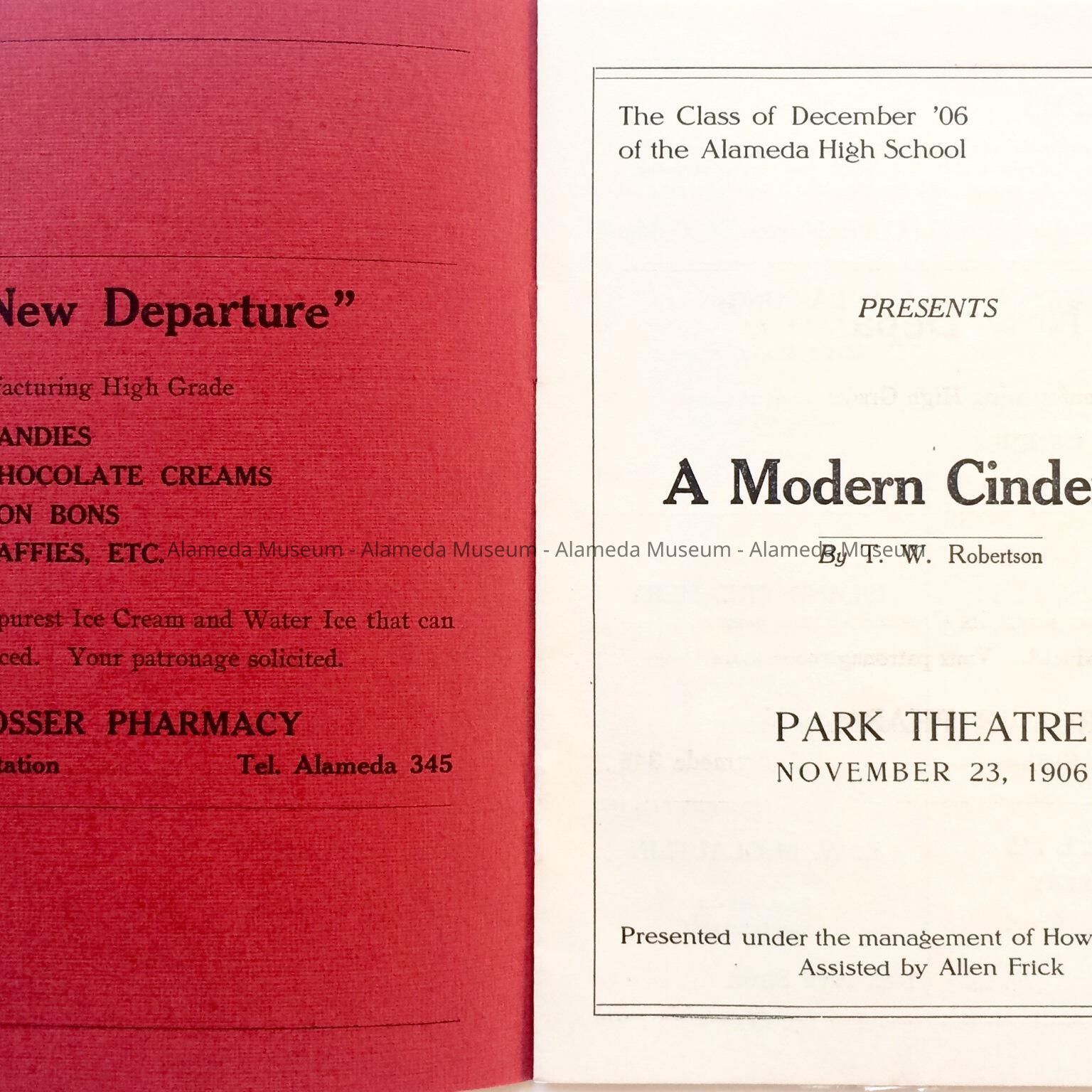 History of Object: Program, class play "A Modern Cinderella", performed at the Park Theatre, Nov 23, 1906, by the graduating class of the Alameda High School (1906).