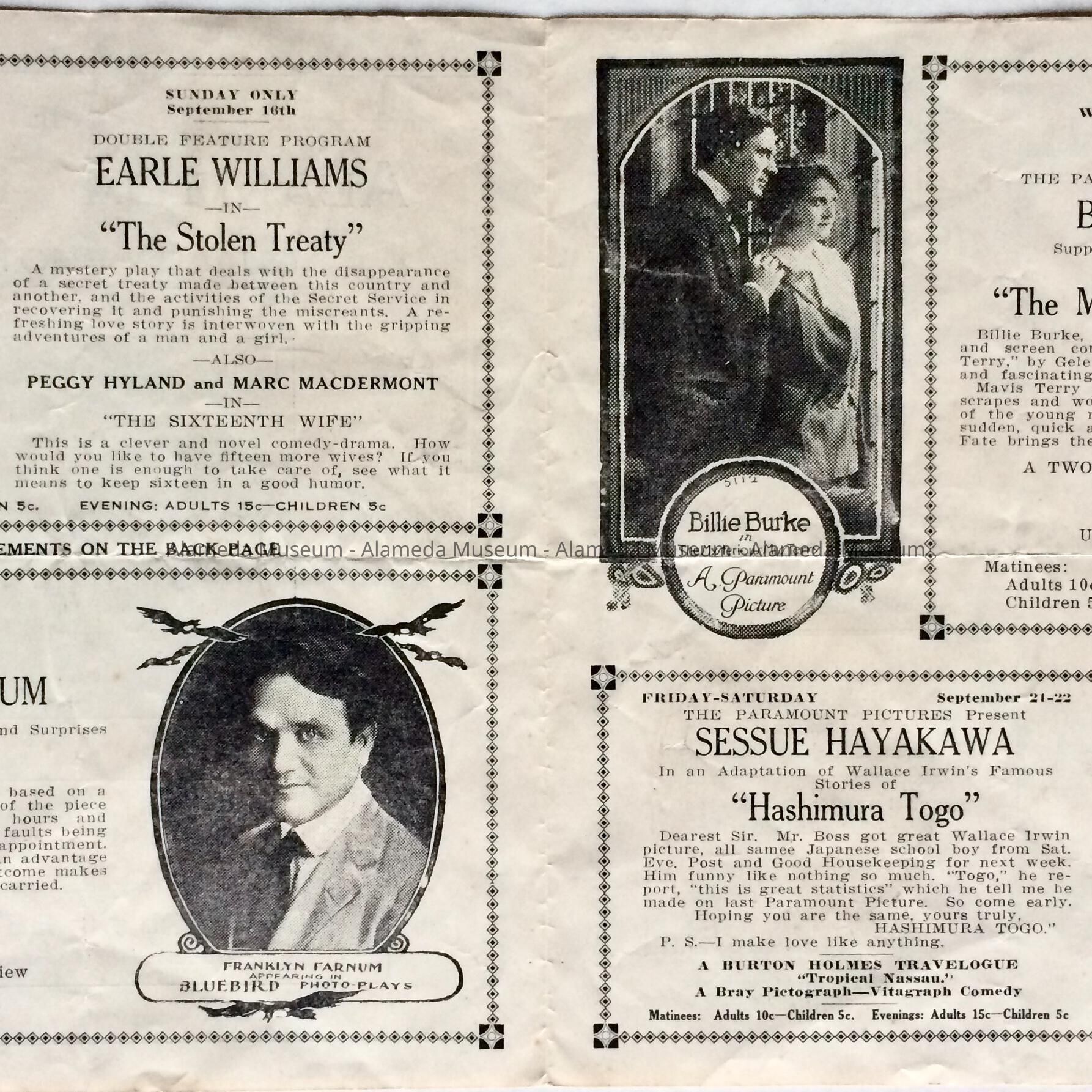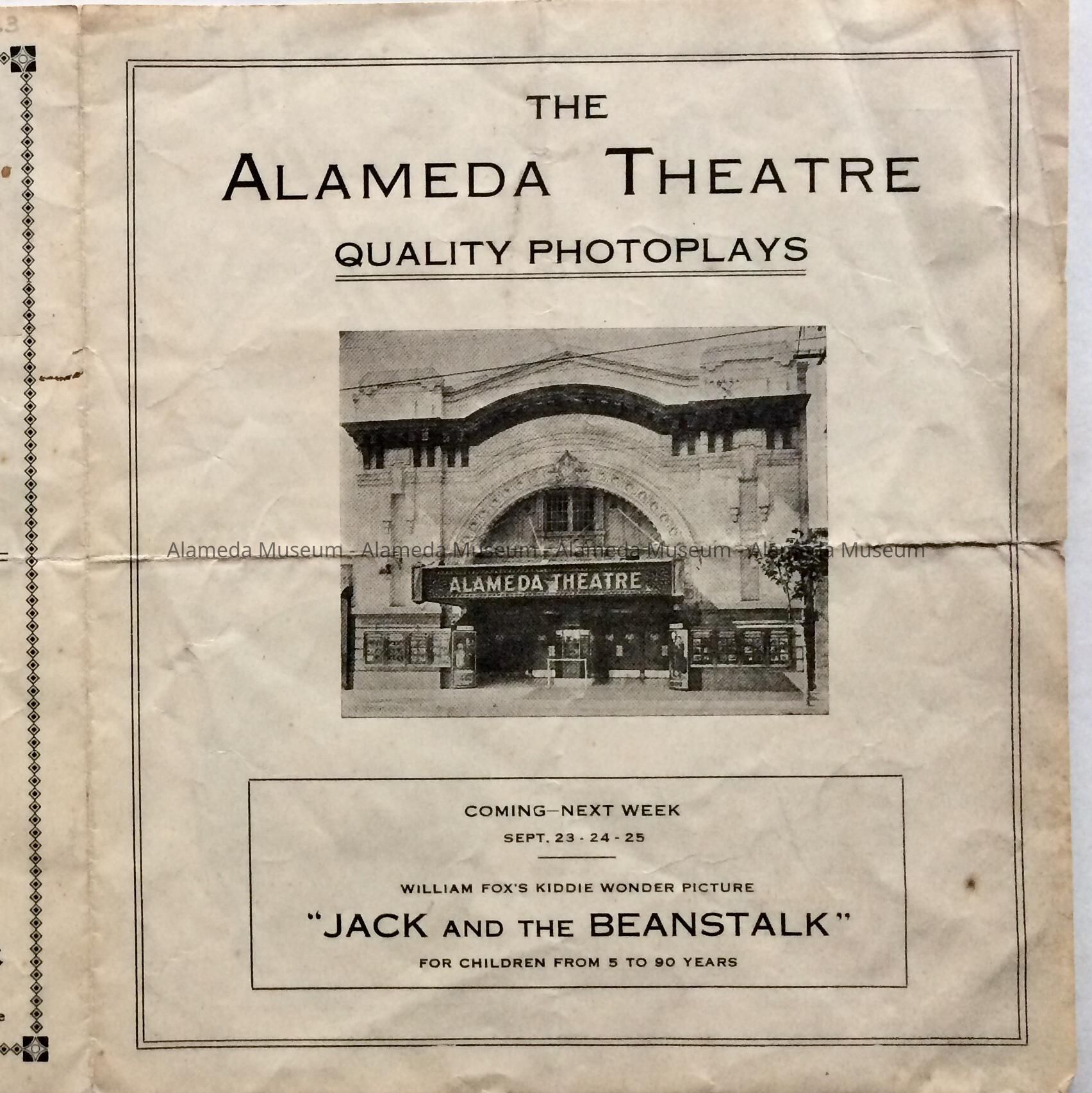 Program for coming attractions of silent movies to be shown at the Alameda Theater, corner of Santa Clara and Park Street. The building is still standing.