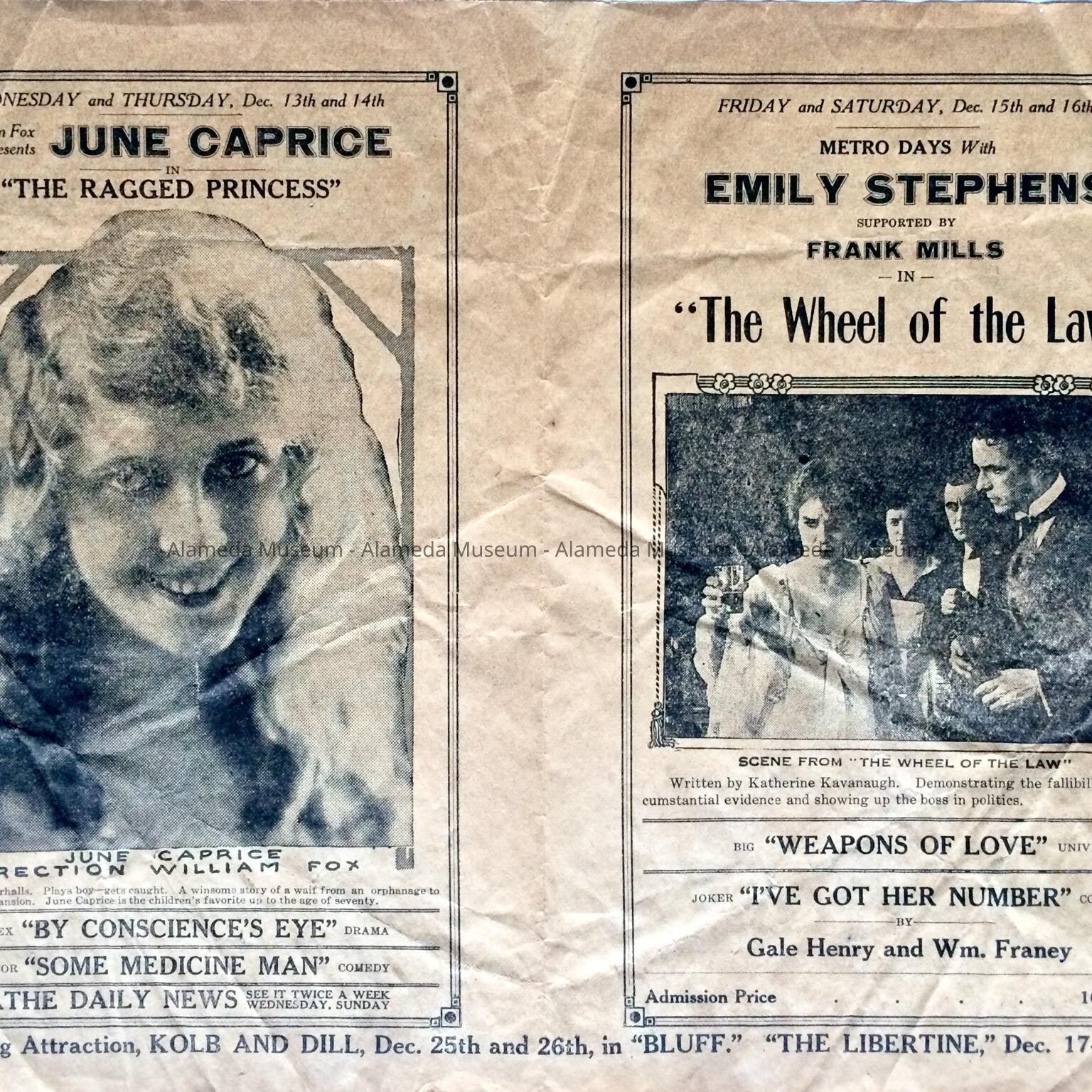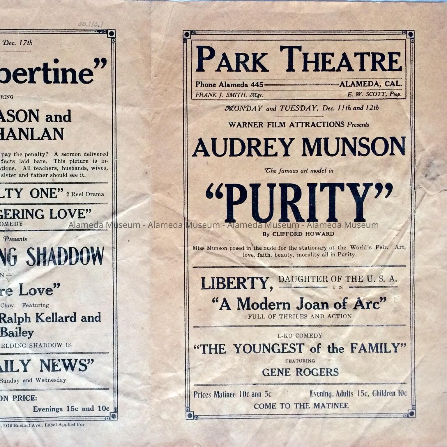 Program announcing coming attractions of silent pictures at the Park Theatre. The building is still standing but is much altered.