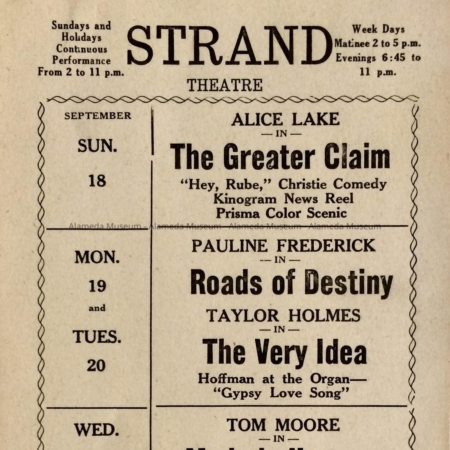 A list of coming attractions of silent pictures to be shown at the Strand Theater, which was on the east side of Park Street near Encinal Avenue. It is now the parking lot of the main branch of the Alameda Fire Department.