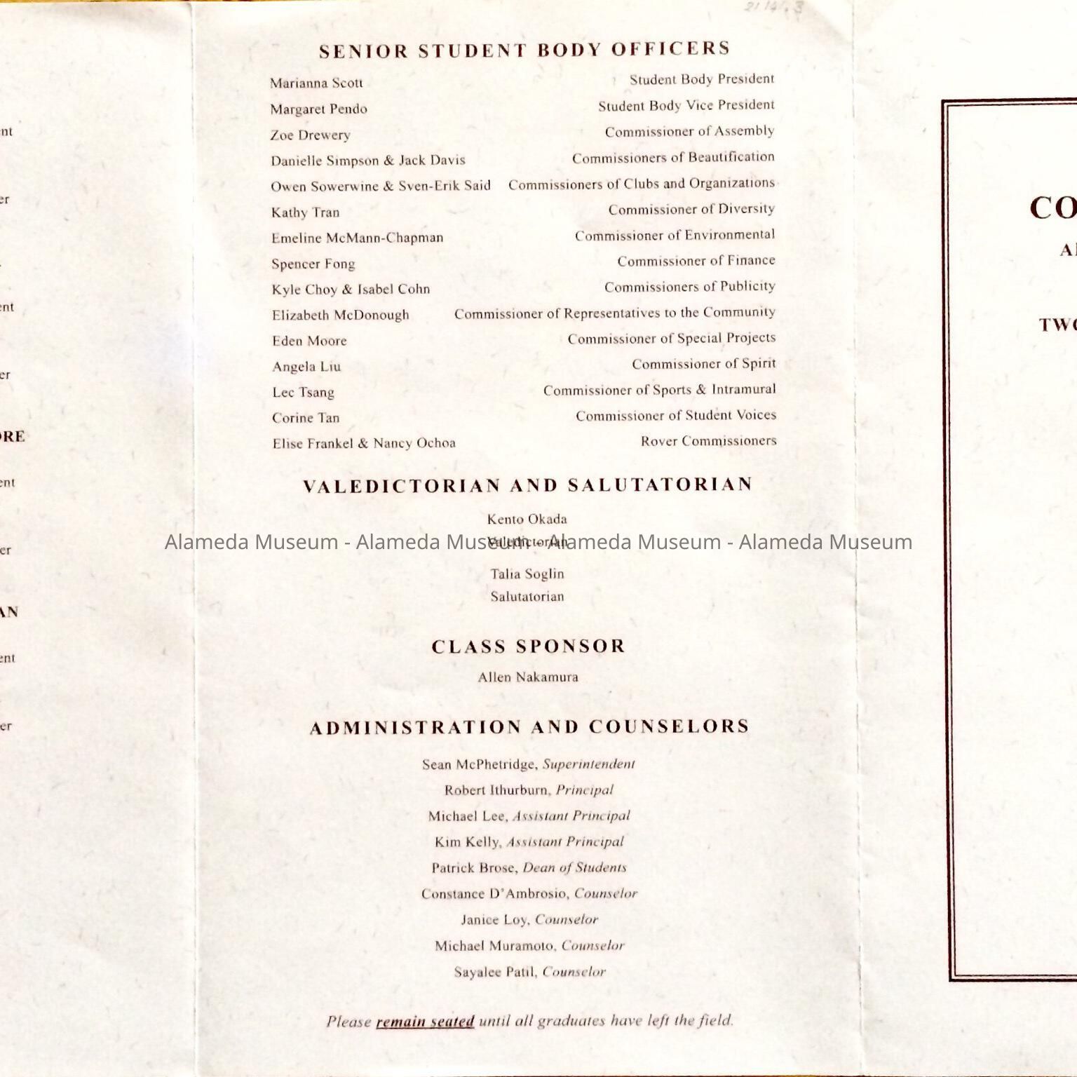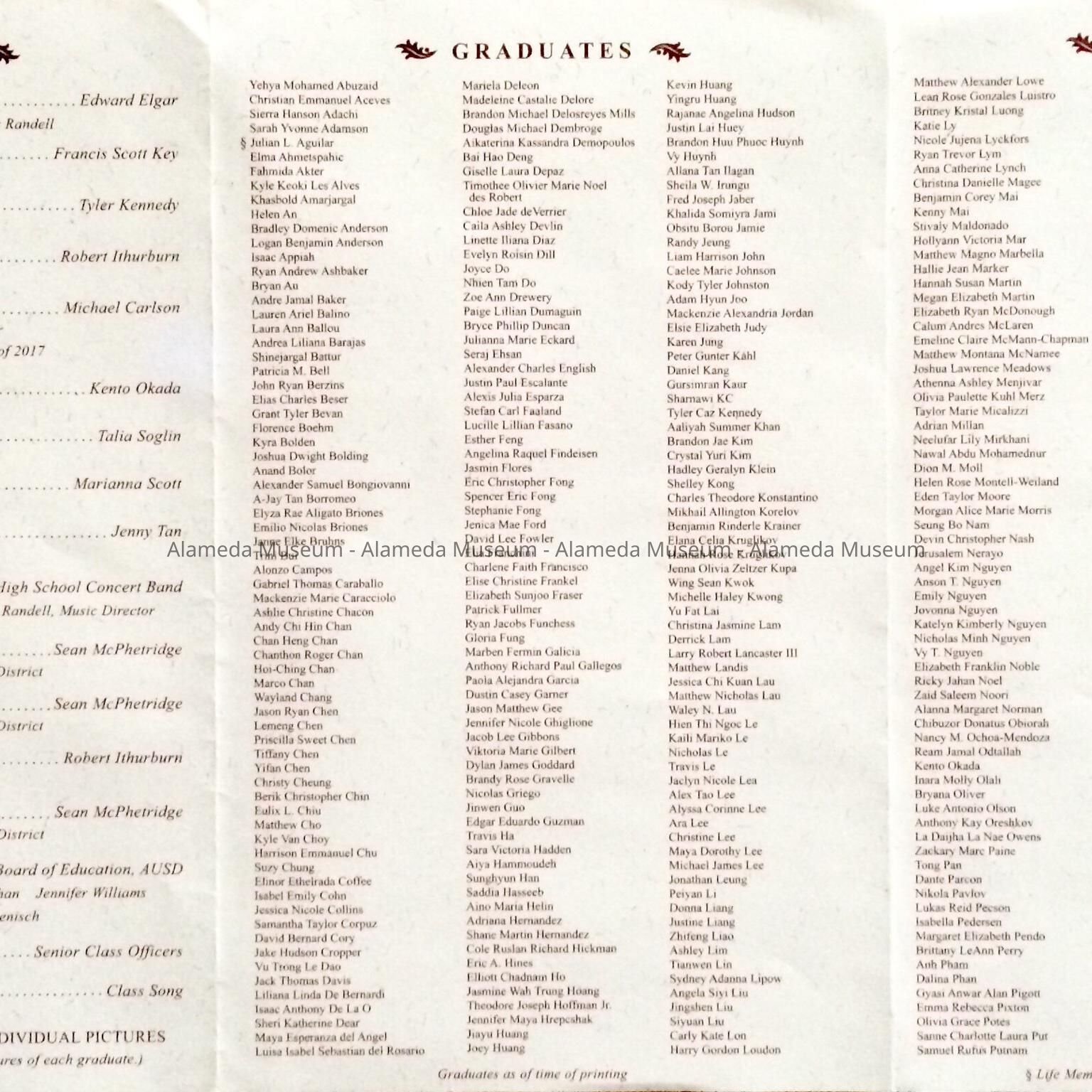 History of Object: Commencement Program for Alameda High School, June 2017. Includes list of graduates.