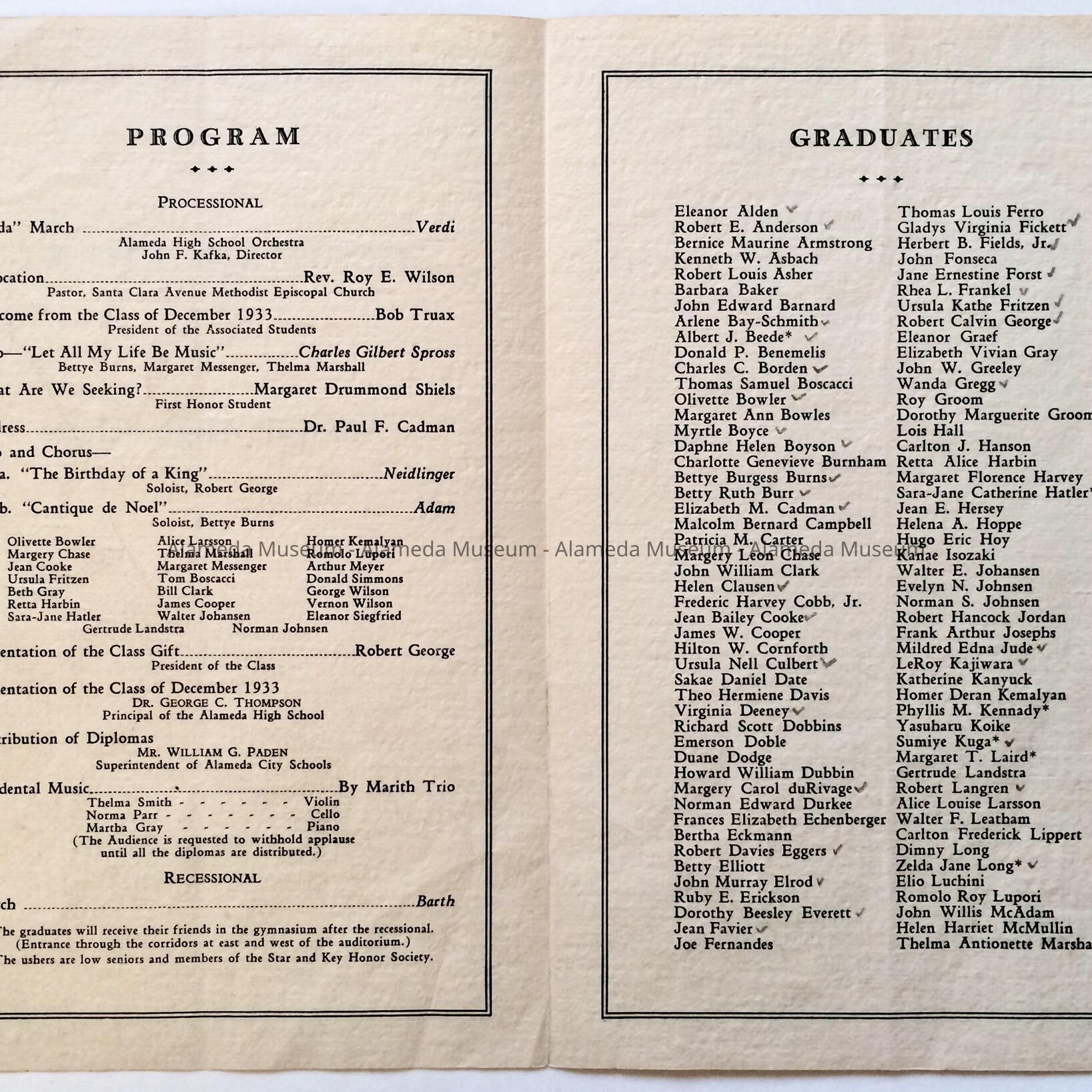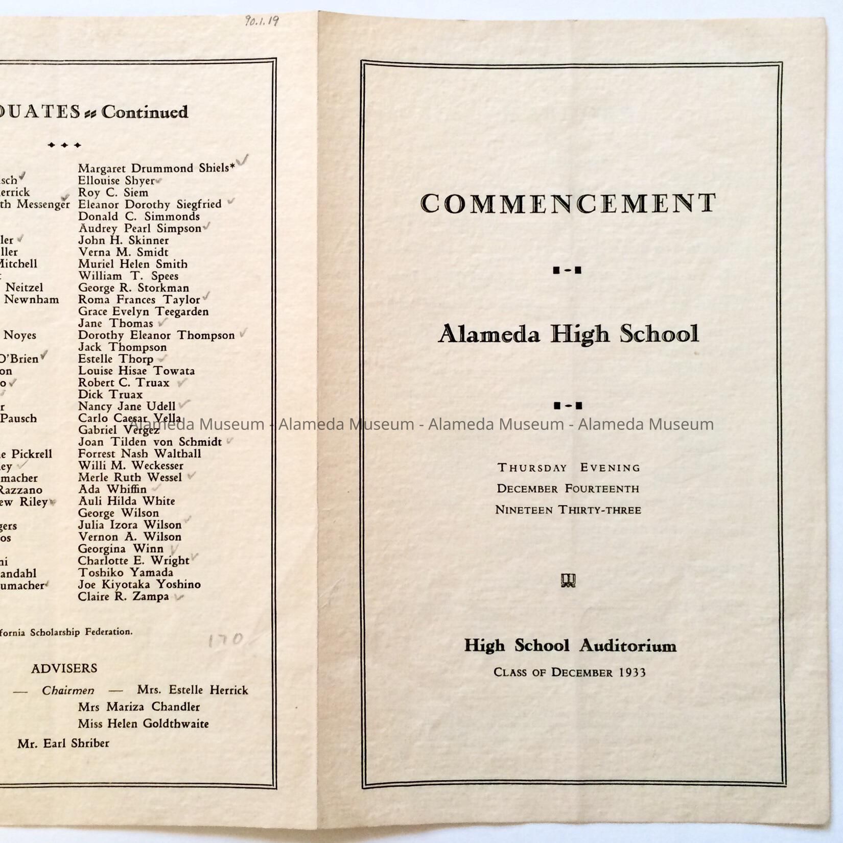 Program-Commencement-Alameda High School, Class of Dec., 1933. The donor, Barbara Baker, was a member of the graduating class.