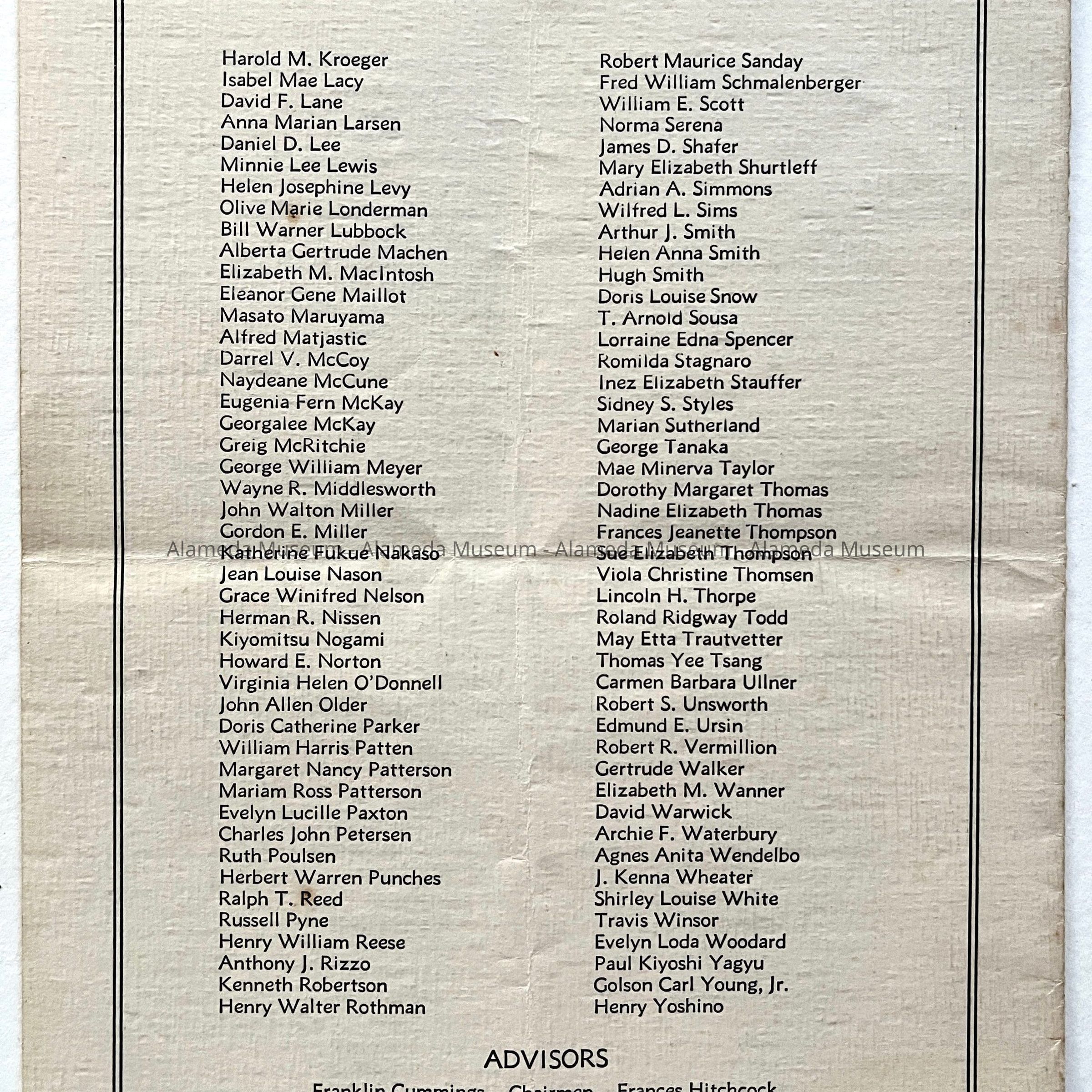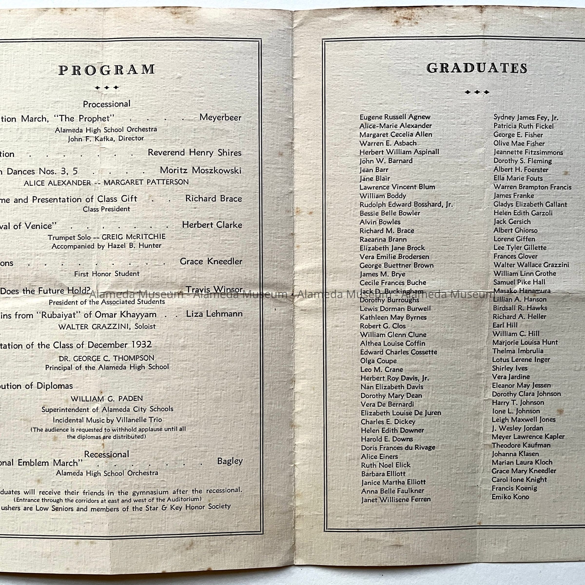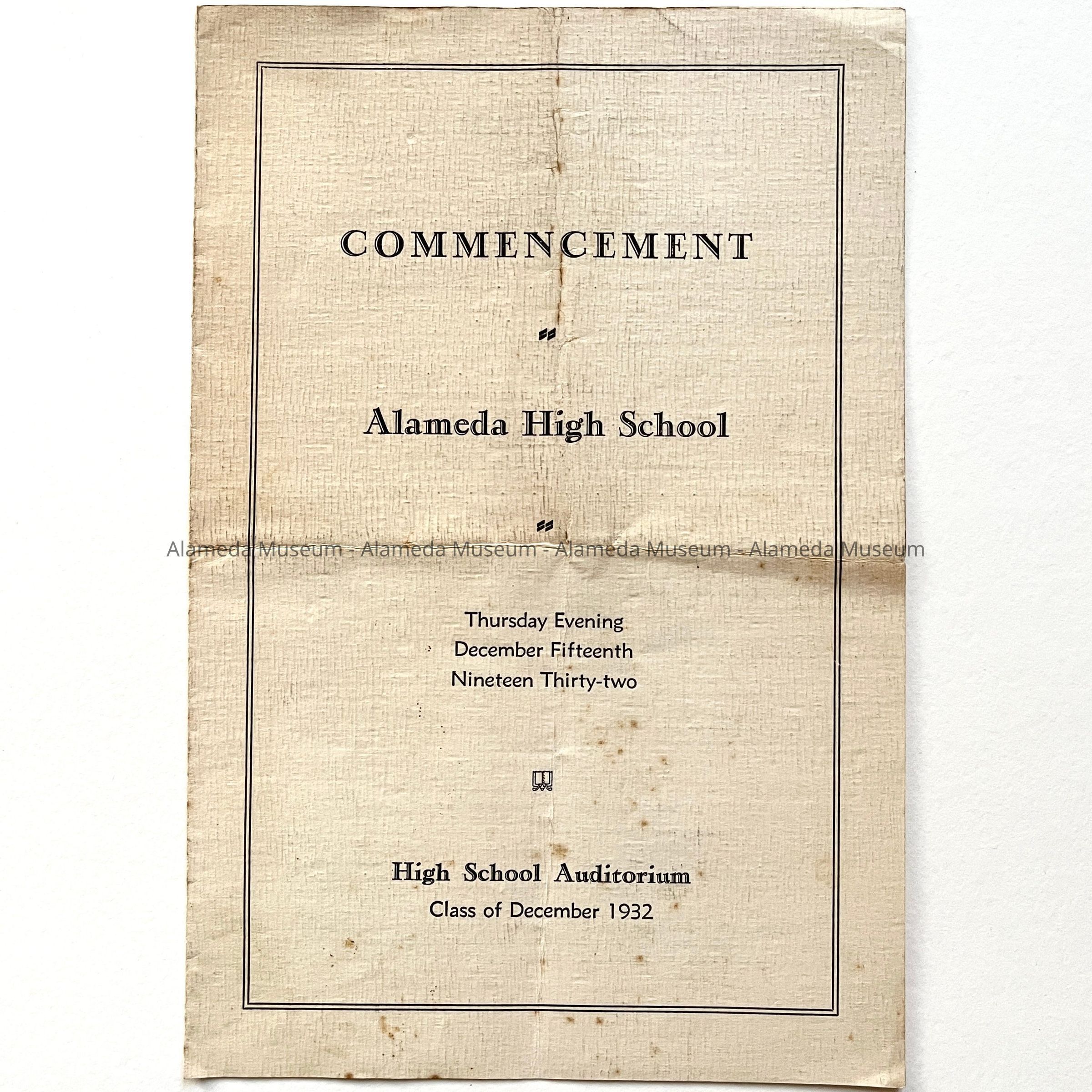 History of Object: Program for the Commencement Ceremonies of the Alameda High School, Class of December 1932, on December 15, 1932, in the High School Auditorium. Diplomas were distributed by Superintendent of Alameda City Schools, William G. Paden. Includes a list of graduates.