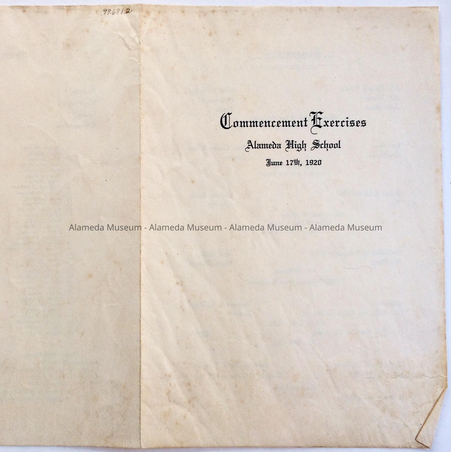 Program listing graduates for commencement exercises, Alameda High School, June 17, 1920.